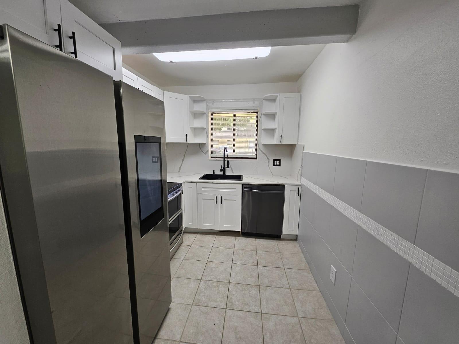 Beautiful 2/2 first-floor apartment. New flooring throughout the entire unit, including the bathroom and kitchen, features white shaker cabinets, quartz countertops, and a full backsplash in the kitchen, along with Samsung stainless steel appliances. Stackable washer and dryer inside the unit, water and trash collection included! 1 parking space + guest. Located just five miles from the sparkling shores of Pompano Beach, this property offers easy access to sun, sand, and surf. No pets allowed. Association approval required.