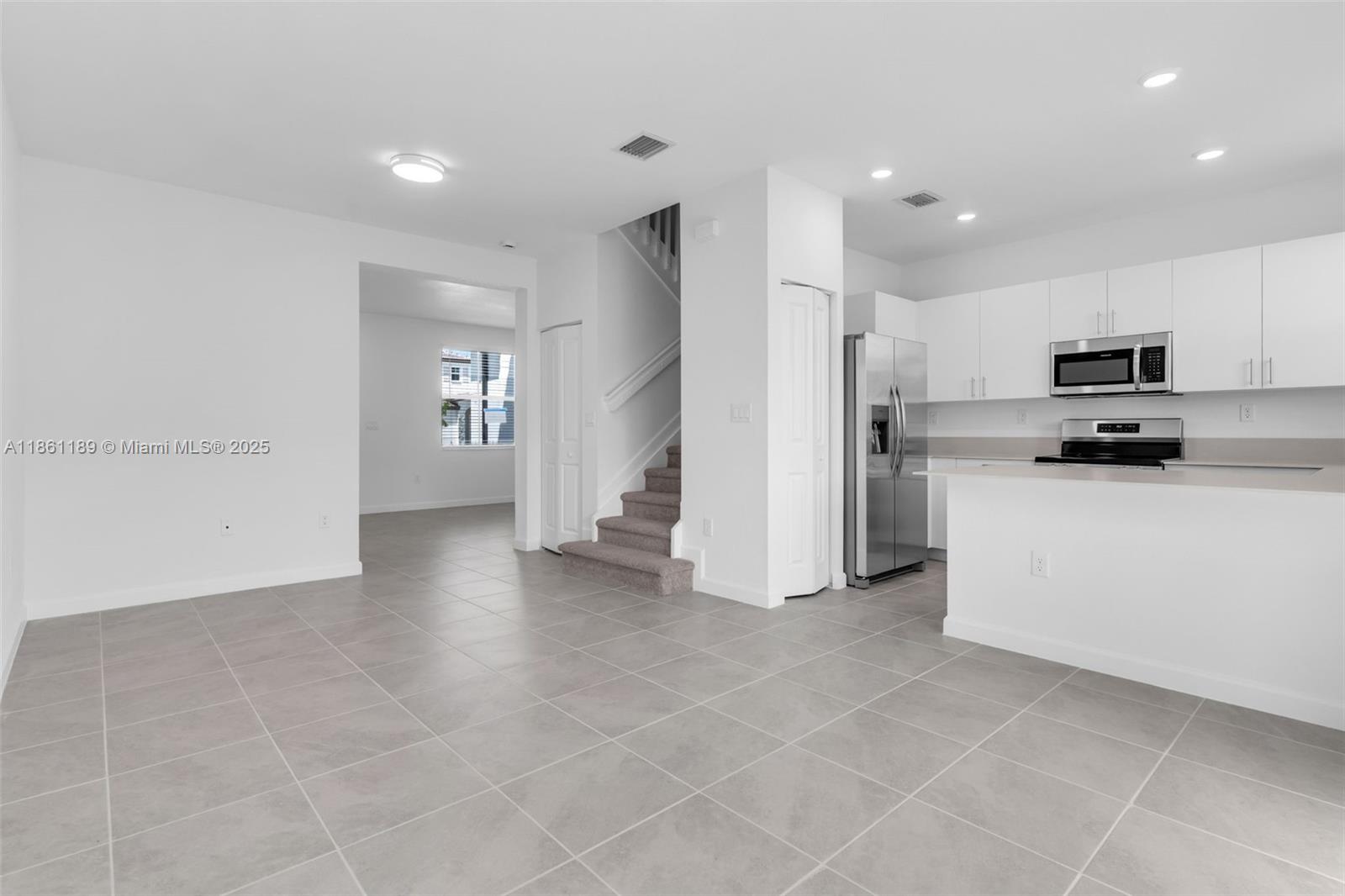 Brand-new two-story townhouse offers three spacious bedrooms, two full bathrooms, and one half-bath. The open layout features a family room/dining room, and kitchen, complemented by a separate living room for additional relaxation and entertainment space. All bedrooms are on the second floor. Kitchen boasts stainless steel appliances, quartz countertops, and ample cabinet space. Elegant ceramic tile flooring on the main level, the second floor is carpeted for added comfort. A large, fenced patio provides the perfect setting for relaxation or entertaining. Conveniently situated near schools, Turnpike Exit 2, retail shops, restaurants, a hospital, Amazon Distribution Center, and Homestead Air Base. Association approval requires 30 days, and tenants are responsible for water and electricity.