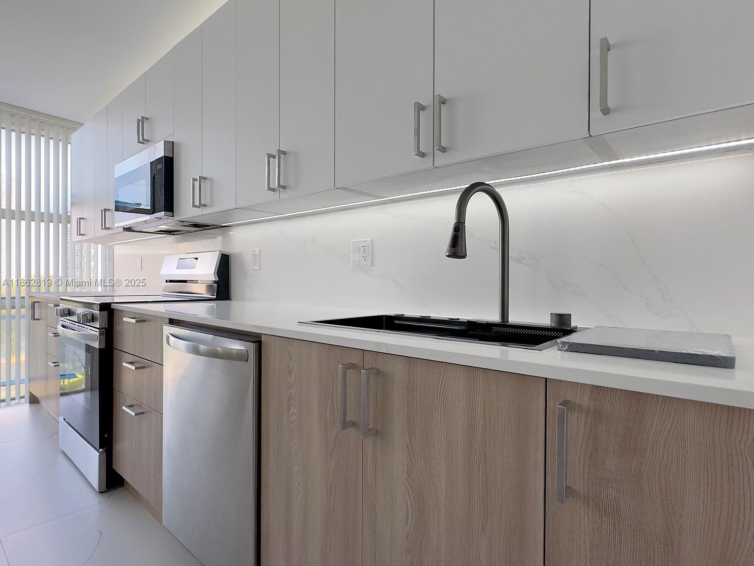 1257 Biscayne Cove unit, completely renovated and brand new! This unit has never been used since its remodel. It features two spacious bedrooms and two bathrooms, along with new porcelain floors and LED lighting throughout. The ultramodern kitchen and bathrooms are a highlight. The building is full of amenities and overlooks one of the Intracoastal lakes. Please note that the complex's exterior is currently being remodeled, with an expected completion soon. There may be some construction noise from Monday to Friday, between 9 a.m. and 4 p.m.