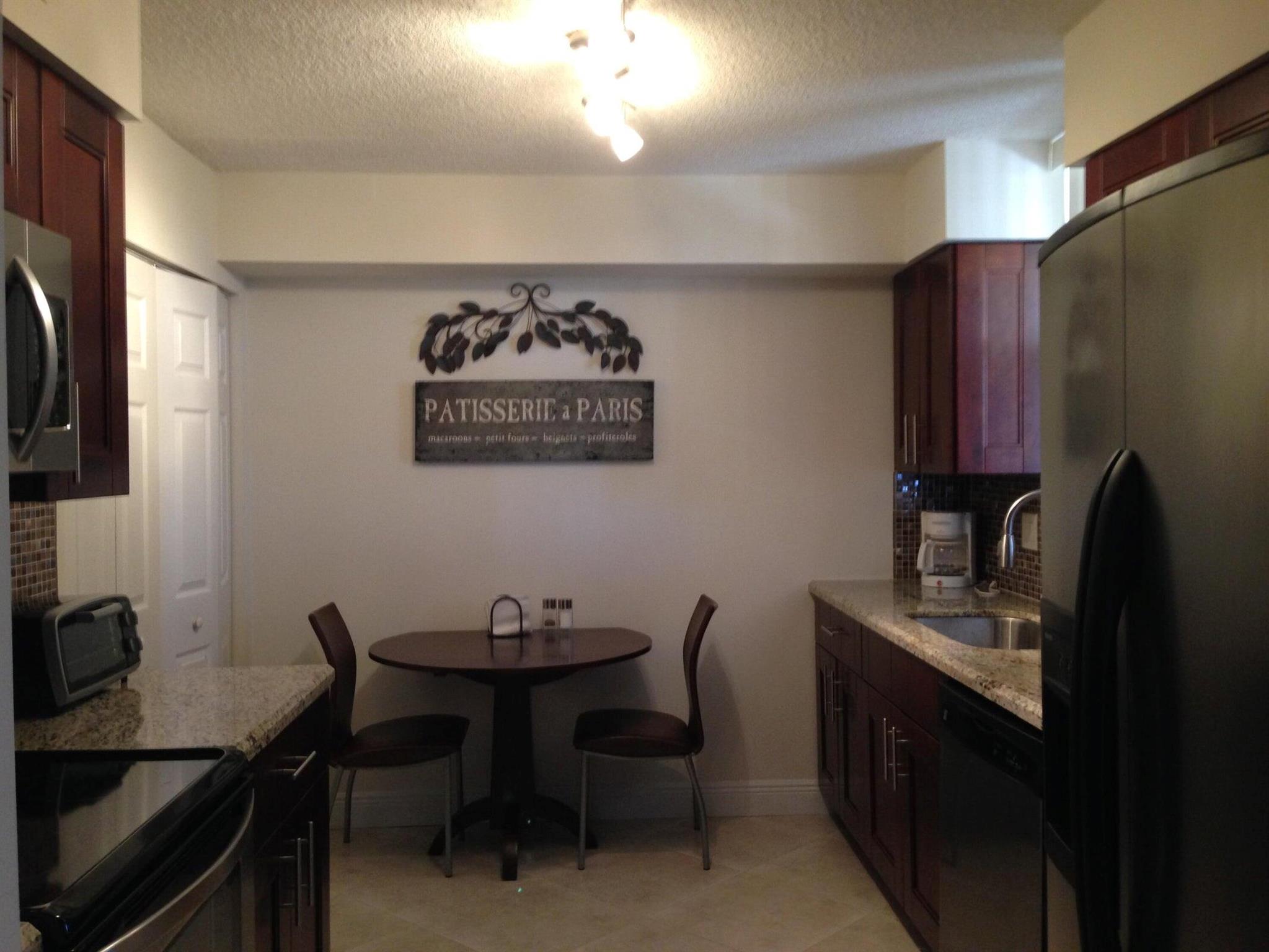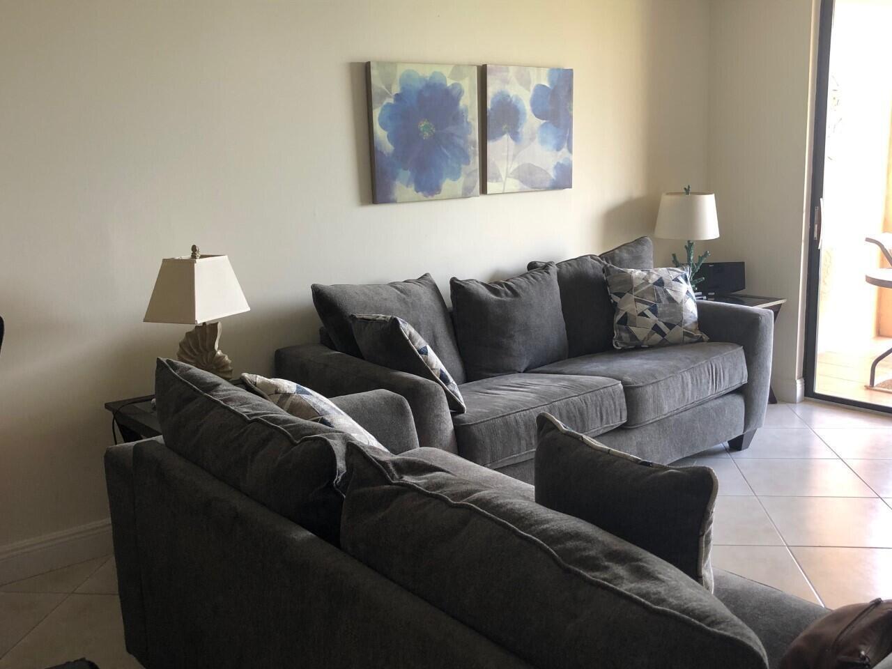 : Move right into this completely remodeled and FURNISHED one bedroom condo on the fourth floor. Tiled throughout with stainless steel appliances including washer and dryer. The apartment is tastefully and comfortably furnished with king size bed, dining room set, couch and love seat, flat screen televisions and fully equipped kitchen. Just bring your toothbrush. Private patio off both the living room and bedroom for spectacular south Florida sunsets. All this, just steps away from 24 tennis courts, two pristine pools, jacuzzi and fitness center in the beautiful Delray Racquet Club. Secure building just minutes from the beach, I95 and trendy Atlantic Ave. Walk to Target, Starbucks, Whole Foods, Fresh Market and Trader Joe. Trash, water wi fi and basic cable included. No smoking, no pets.