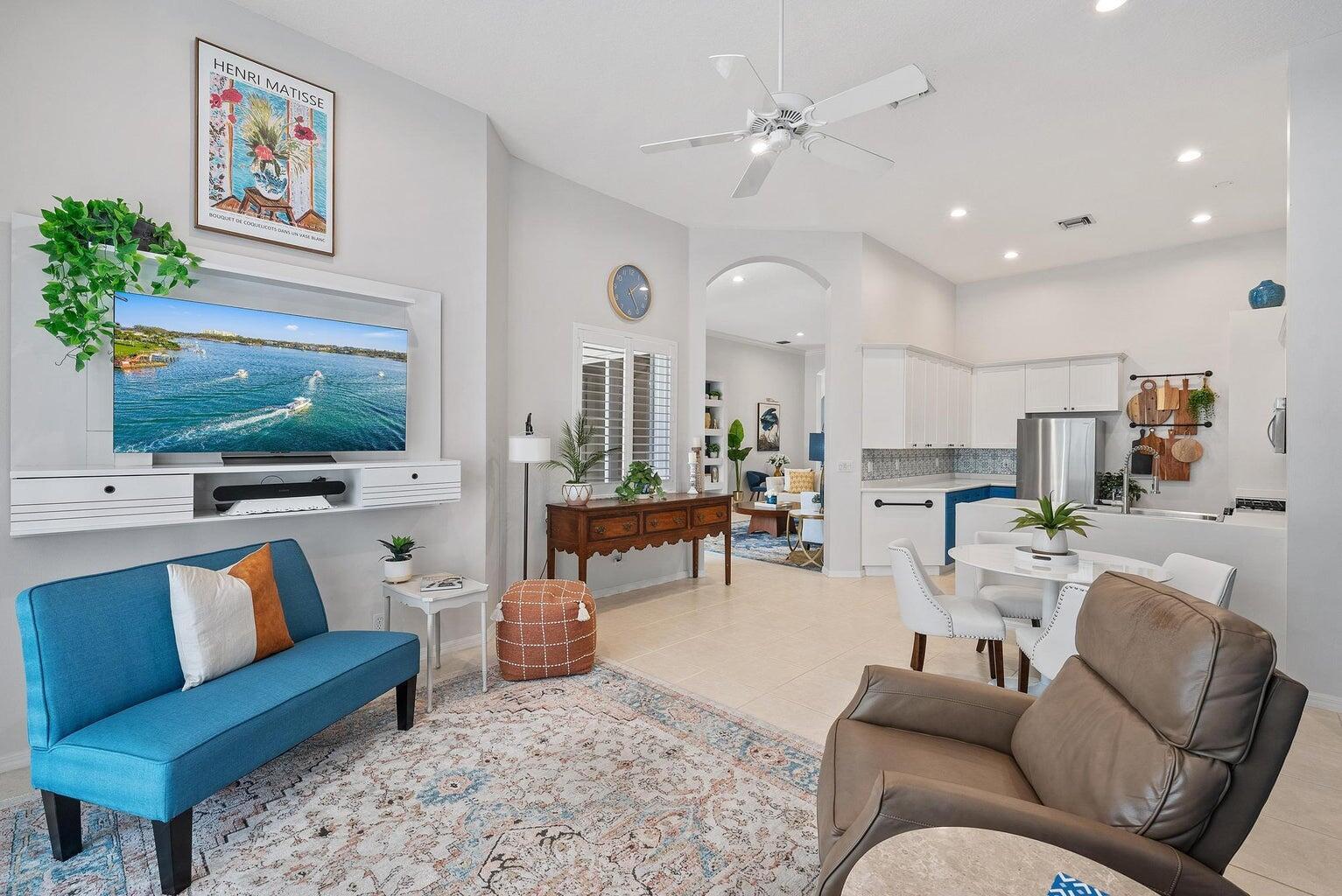 AVAILABLE FOR SEASONAL LEASE! ALSO, AVAILABLE ANNUALLY $7,000/MONTH. Enjoy the South Florida lifestyle in this 3BR/2.5BA + Flex Room home in the Grande neighborhood of The Club at Ibis. Perfectly positioned on a private lot with serene water views, this floor plan features soaring ceilings, sun-filled living spaces, and a newly expanded lanai with travertine pavers and custom screening.The open kitchen and family area are ideal for entertaining, with a gas range, new stainless-steel refrigerator, Corian countertops, and plenty of dining space. Upgrades include fresh interiors, crown molding, plantation shutters, custom built-ins, and brand-new plank flooring in the bedrooms and office.