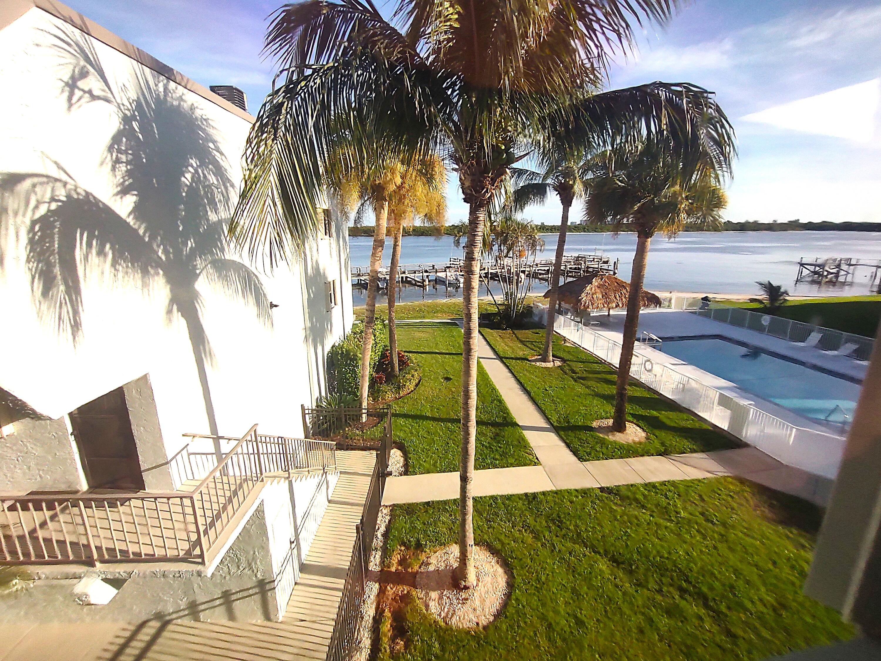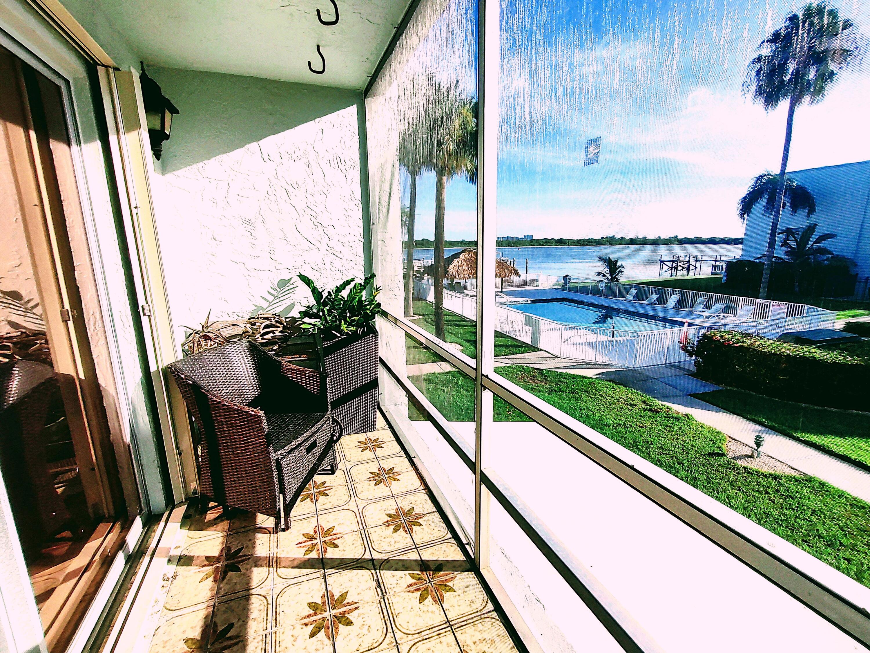 Water View! Lovely 2/1.5 end unit with Views of Inlet, pool and boat dock.Heated Swimming Pool and Club House. This well appointed condo features 2 screened-in Balconies with views. Accordion Storm shutters, Brand New A/C and Assigned Parking. Nearby shopping, banking, fine dinning, live entertainment & excellent fishing and water sports.