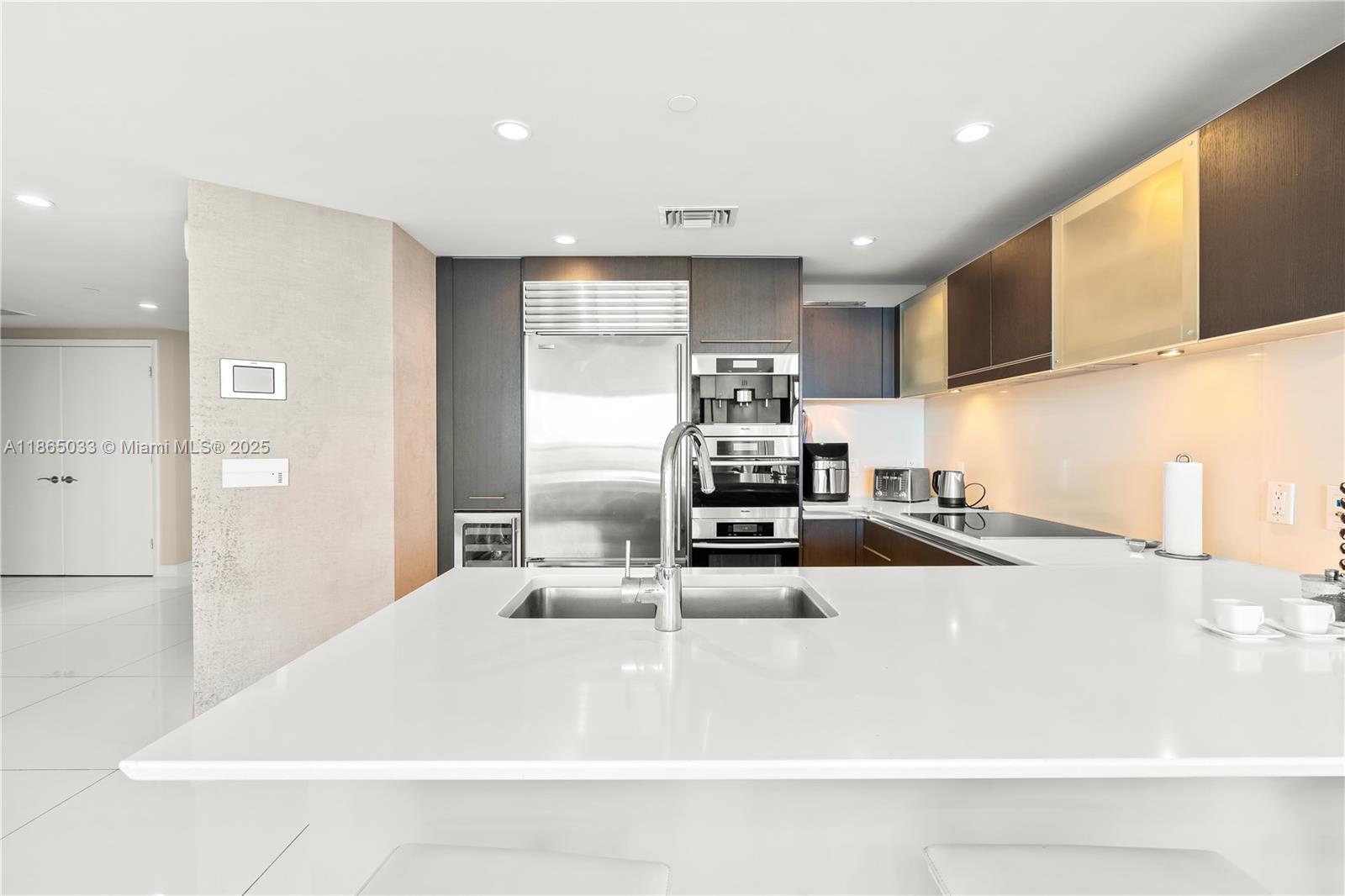 Spectacular furnished corner residence, 3 beds + 3.5 baths with private elevator opening to a private foyer. Enjoy breathtaking, unobstructed ocean views from this residence in the sky. Beautifully decorated with wallpaper, Artefacto furnishings and other luxury brands, electric shades, European appliances, quartz kitchen countertops, Snaidero cabinetry, custom millwork, closets, and window treatments. A truly unique high-end home with elegant design and finishes.