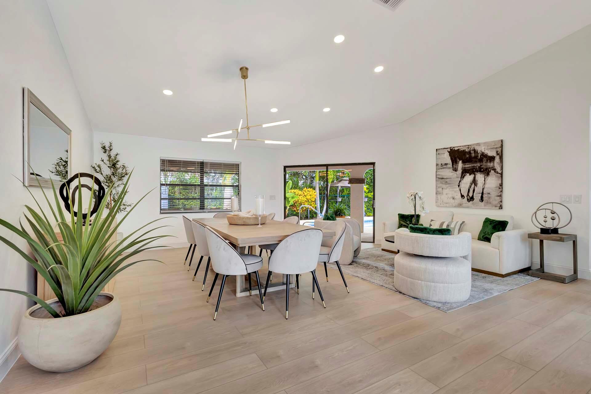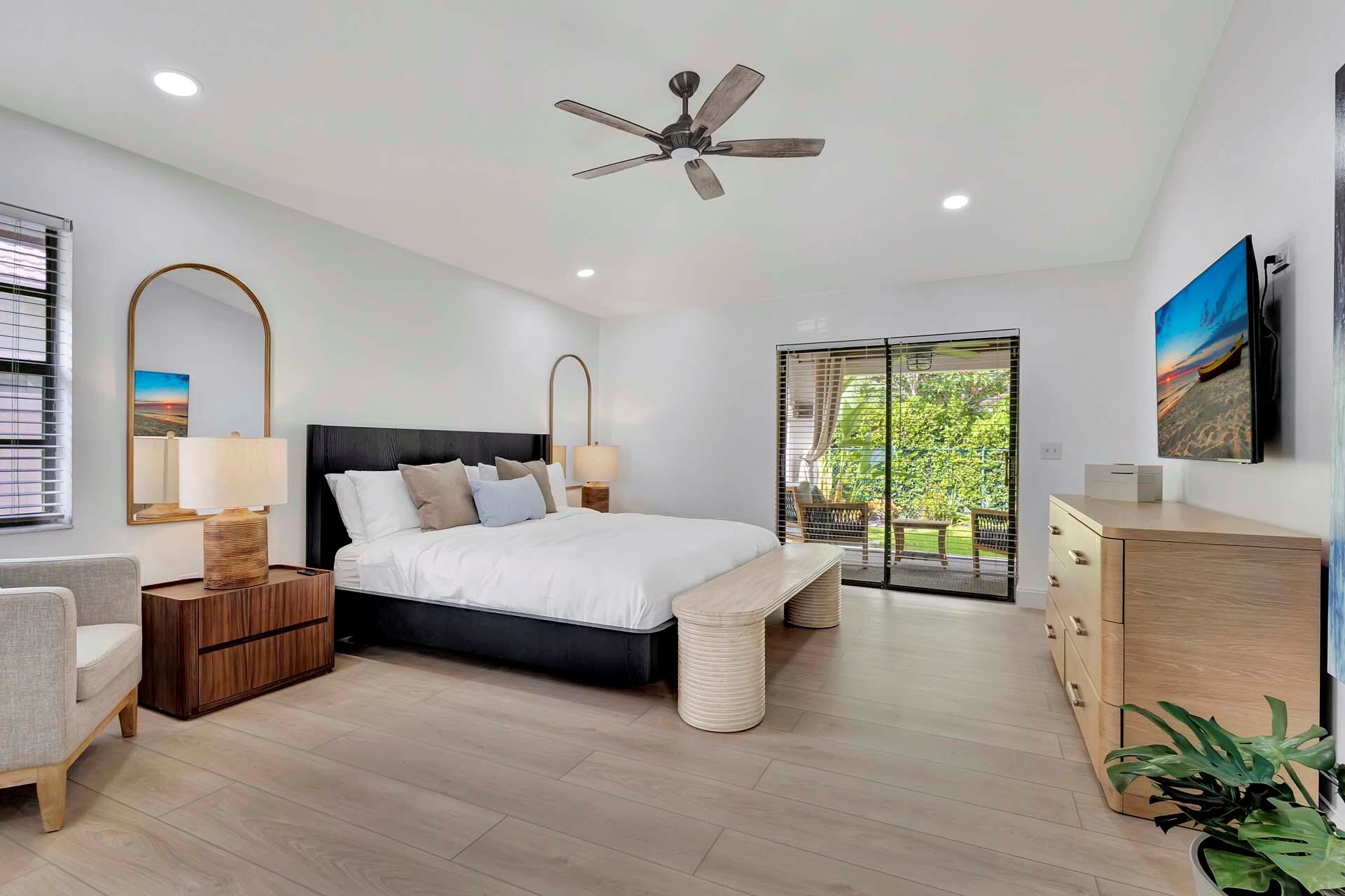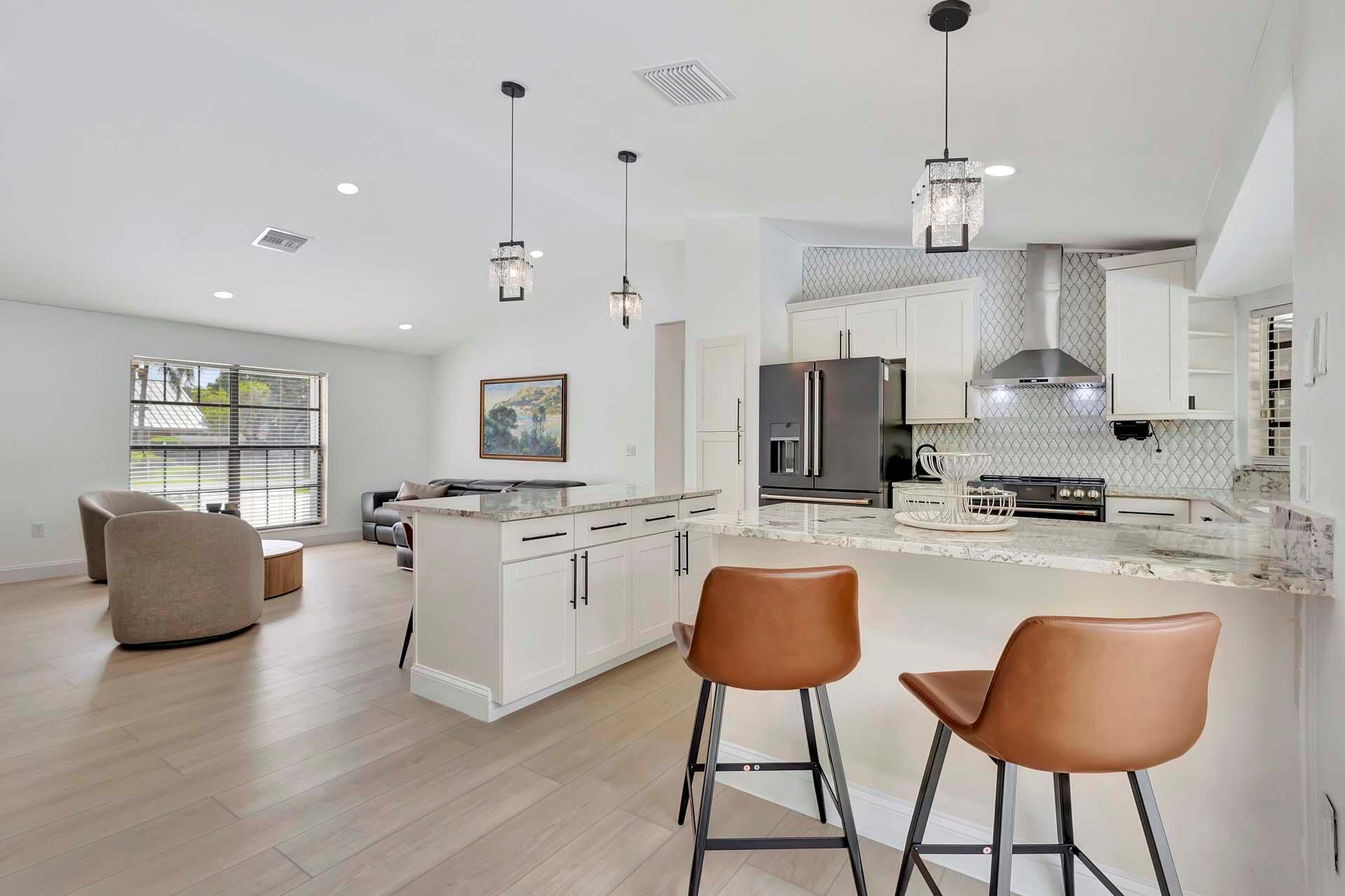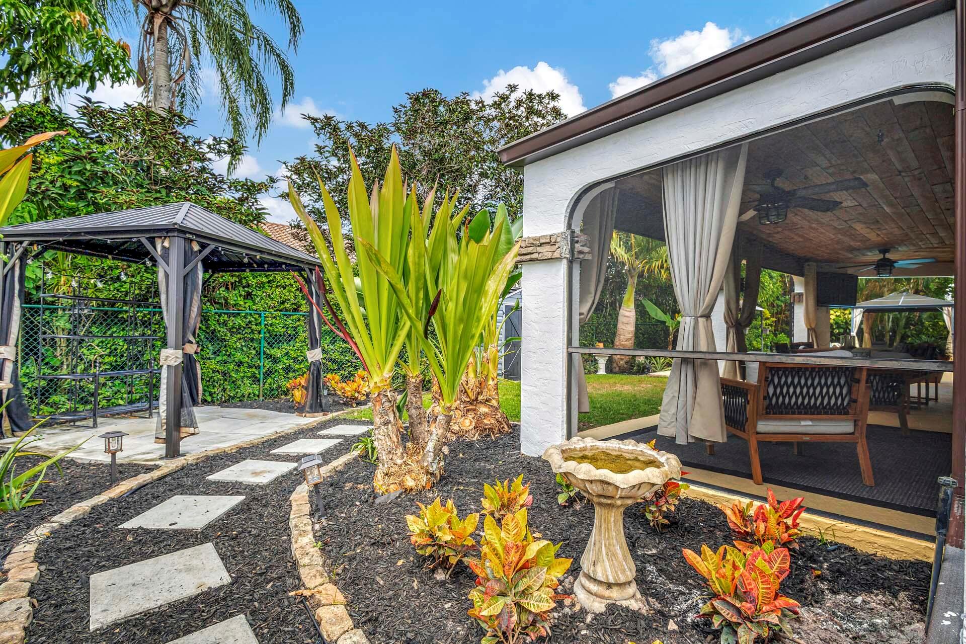 This stunning 4-bedroom, 2-bath home exemplifies luxury living. Completely updated with brand-new furnishings. Enjoy a spacious split floor plan and an open-concept design that will impress. The fourth bedroom, furnished with a double sofa bed, serves as a versatile den/office. This home offers multiple exquisite living and entertaining spaces, leading to a fully fenced, private tropical oasis with a large lanai, pool, and several gazebos for shade and relaxation. It features a 2-car garage and an oversized driveway for ample parking. Conveniently located, it's just a short distance from all amenities and less than 3 miles from Wellington International and Global. The roof was replaced in 2021. New impact doors and windows.