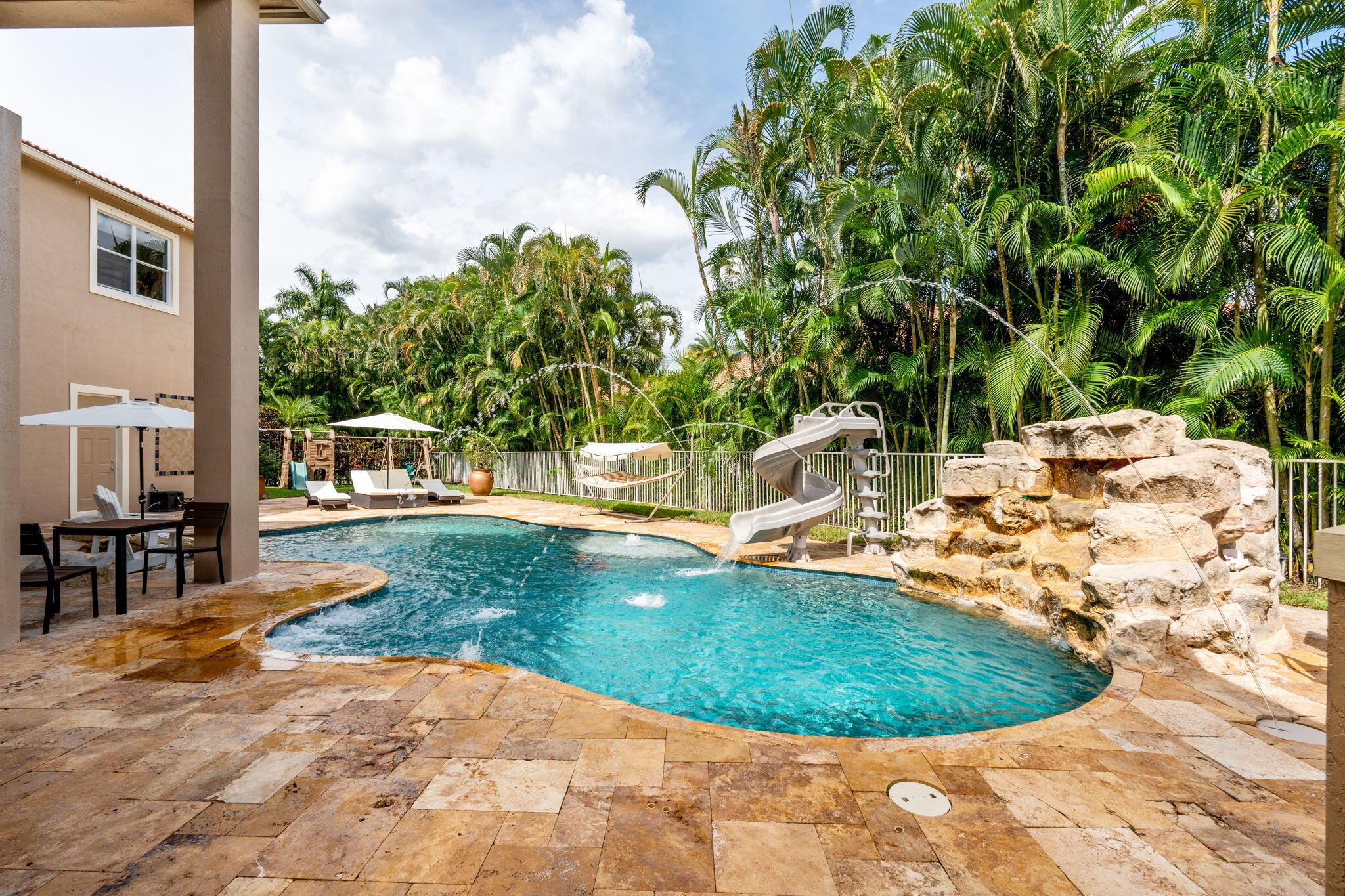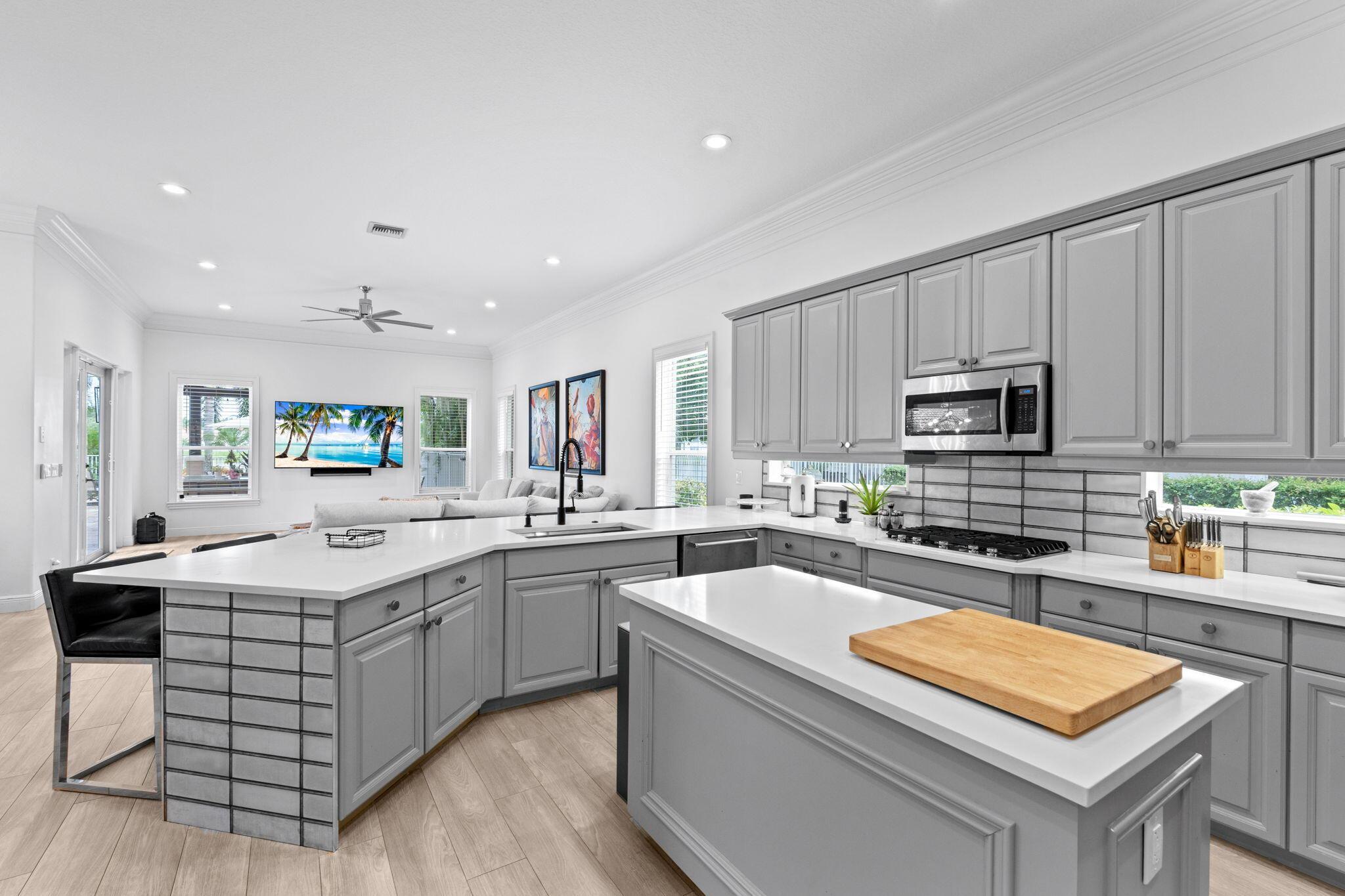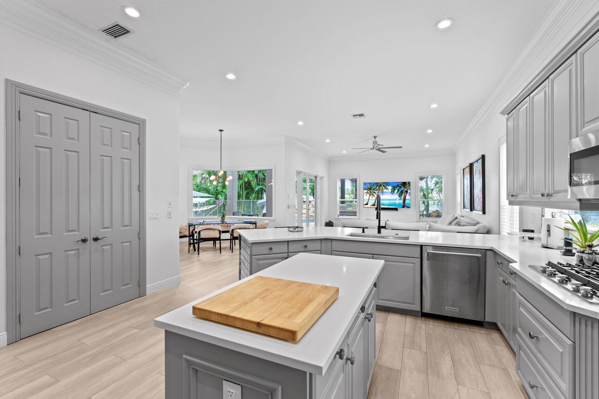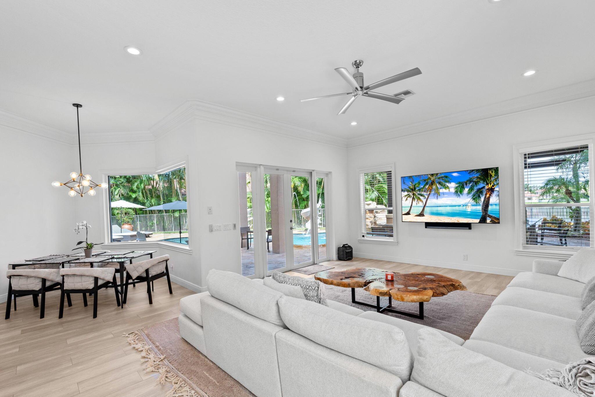 Welcome to this beautiful light-filled 6-bedroom, 4.5-bath seasonal rental offering luxurious comfort, space, and style. Upon entering, a striking floor-to-ceiling rear window greets you, framing the backyard, resort-style pool, and water, filling the home with light and serenity, with abundant space and storage throughout. The first floor features wood-tile flooring, a guest suite with a cabana bath and pool access, and flexible living and dining areas perfect for entertaining. The open family room and breakfast nook flow seamlessly into the gourmet kitchen with a 5-burner double oven, oversized island, walk-in pantry, and backsplash windows that bring in even more natural light.