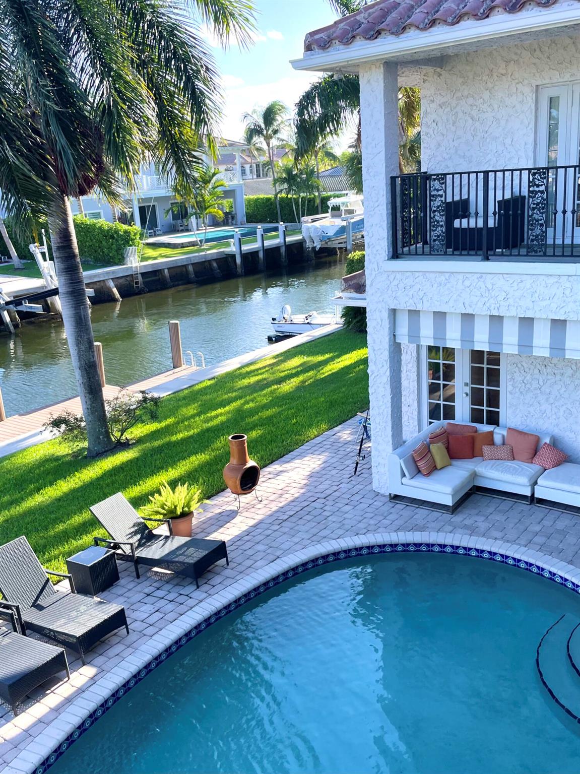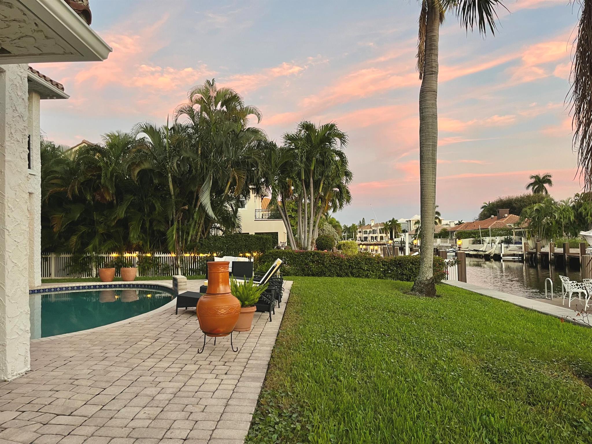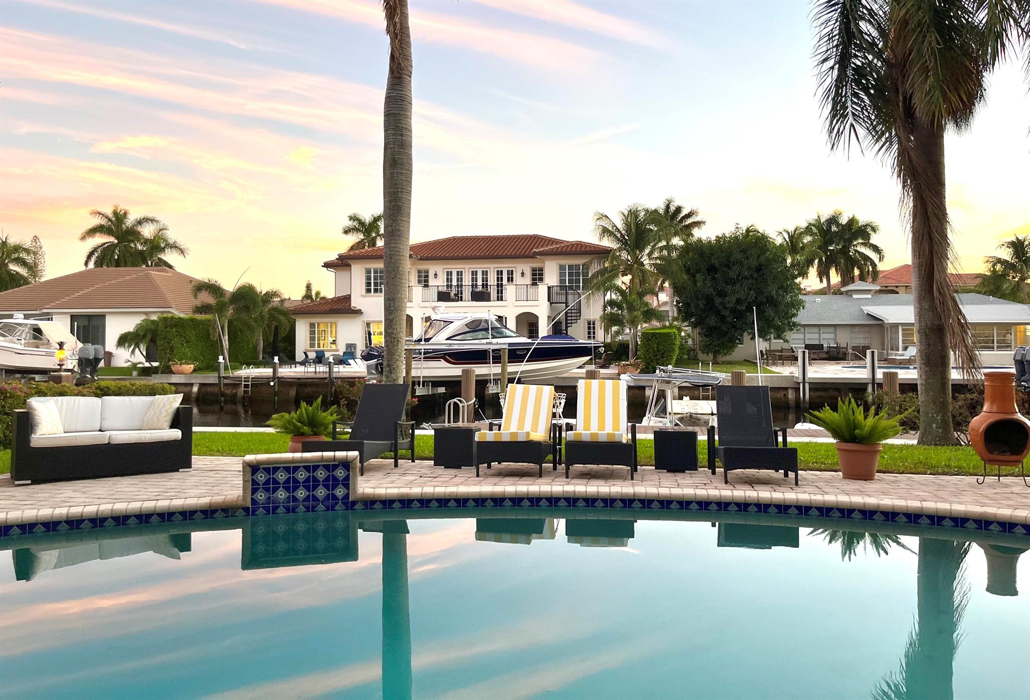 Seasonal or Annual, luxury waterfront living. A short walk to the beautiful Atlantic ocean, or take a quick drive to the vibrant and popular Atlantic Avenue and downtown Delray Beach. A stunning deep-water, pool home offering a 90' dock in the highly desirable Tropic Isle neighborhood. Meticulously maintained with an open and airy floor plan, providing canal and sparkling pool views from every room. Featuring a sumptuous master suite and bathroom, plus an additional three bedrooms, all en-suite. Each bedroom also provides outdoor access via private wrap around balconies maximizing water views. The home additionally features a large, private office/tv/game room, and a spacious two-car garage. A quick boat ride along the intracoastal waterway leads to