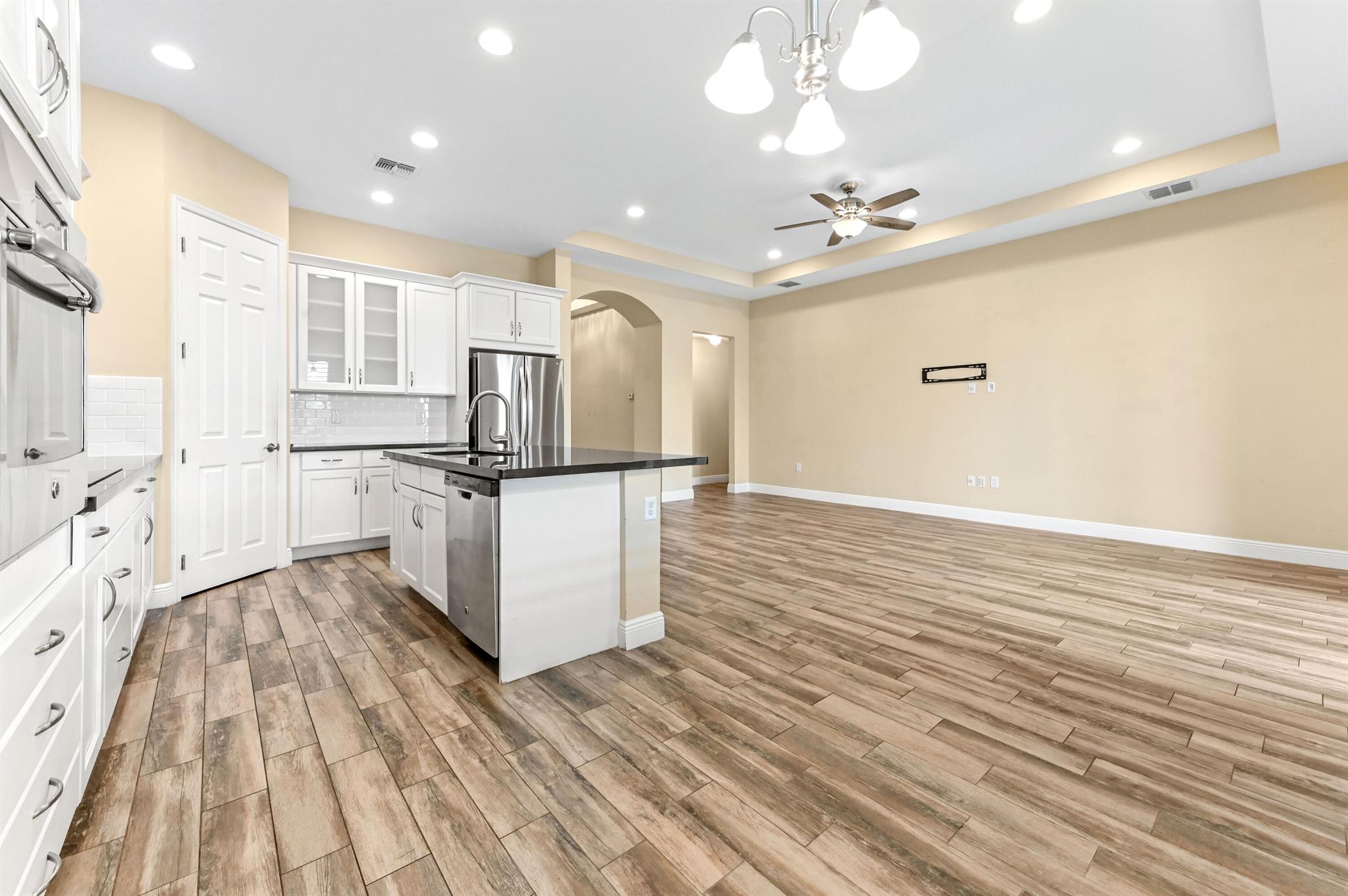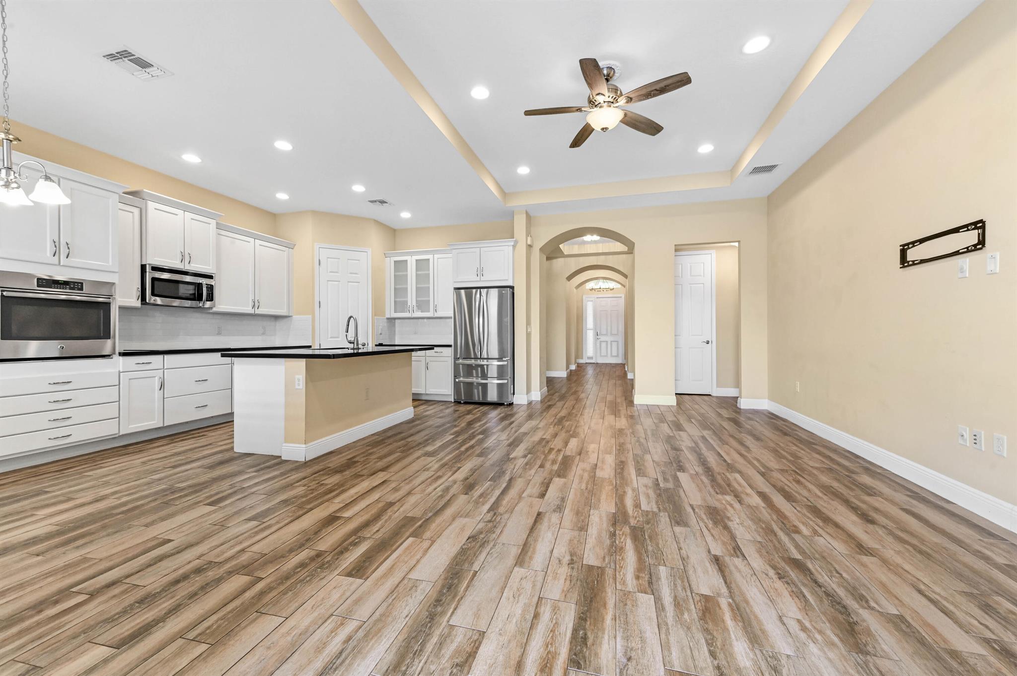 Stunning lakefront gem with a privately fenced yard and oversized screened lanai with picture-perfect water views, boasting 4 beds and 2.5 baths. The home features a massive main bedroom retreat with walk-in closets, formal dining room, and a wide great room that flows into a chef's dream open kitchen. Highlights include an eat-in breakfast nook, black quartz center island, brand new top-of-the-line stainless appliances, triple-door fridge, new induction cooktop paired with a sleek wall oven, temperature-controlled built-in wine storage, complete with white custom cabinetry, and a walk-in pantry. The primary suite is oversized, with an ensuite spa-style bathroom and a huge walk-in shower.