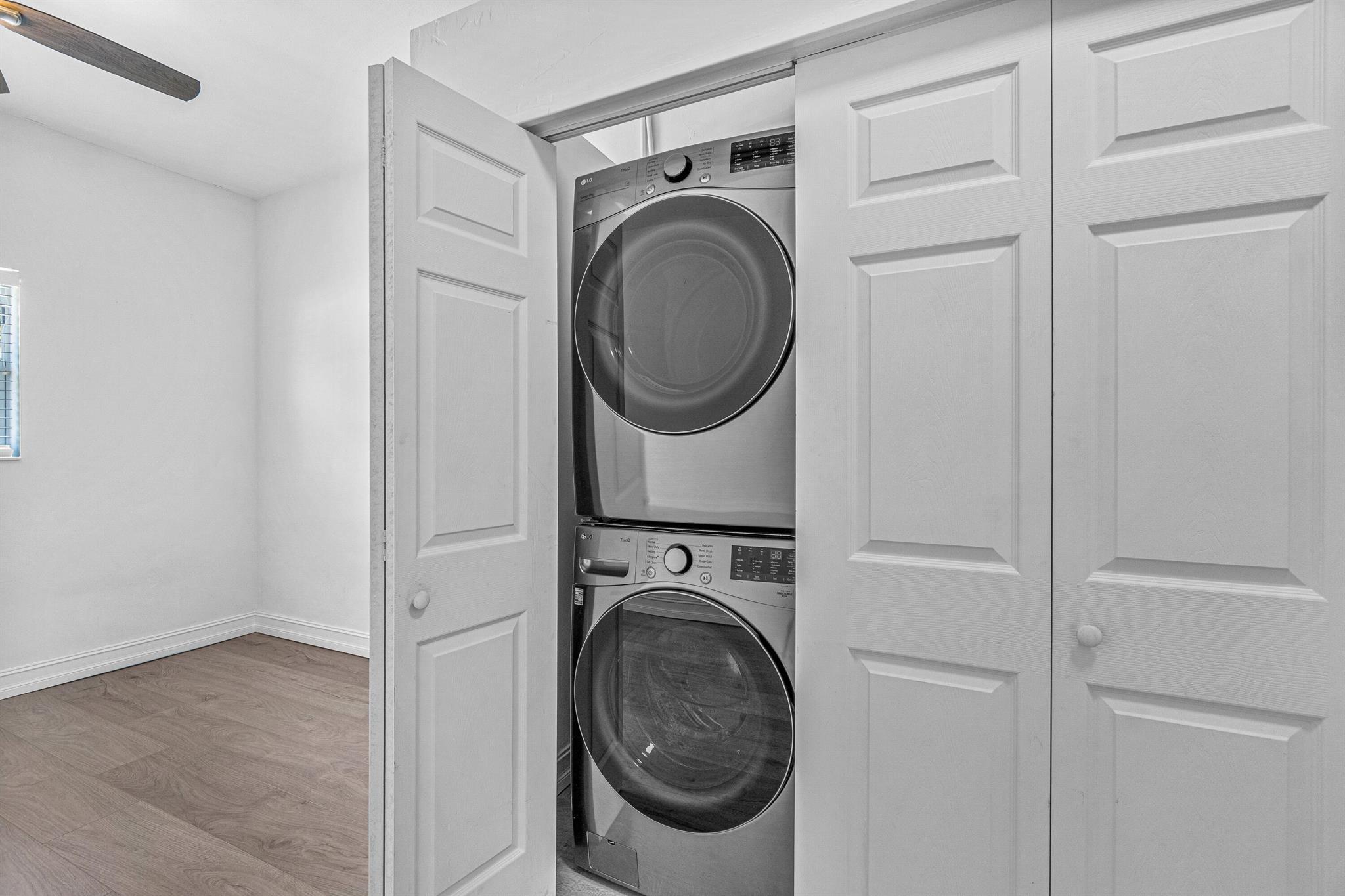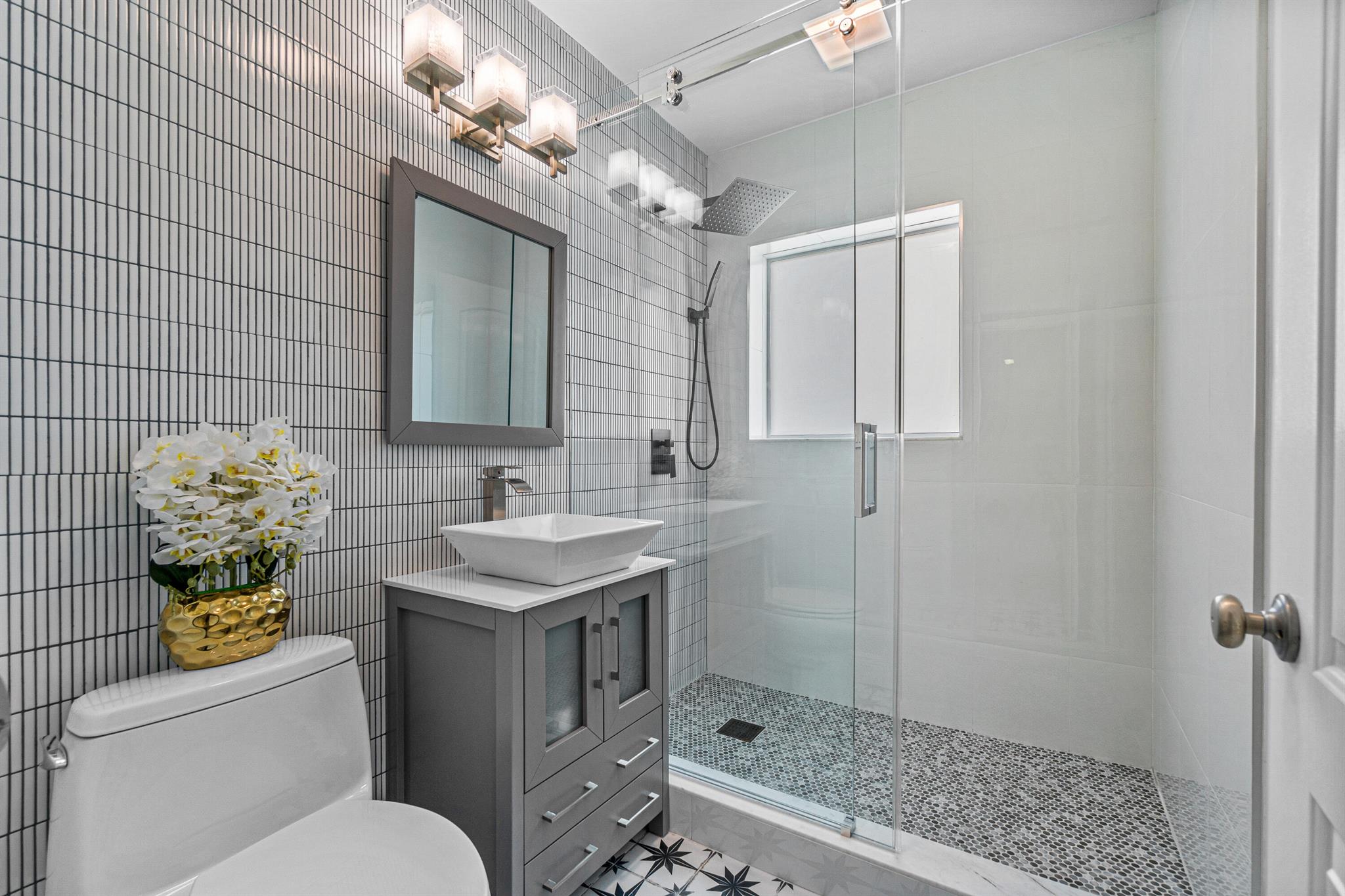 This beautiful mid-century modern home in Lake Worth Beach is a walker's paradise, located in the Historic Jewell District just steps away from downtown restaurants and shops. The 3 bedroom, 2 bath home has been completely renovated to suit todays contemporary lifestyles, with all new floors, appliances, and energy-efficient central HVAC, Doors, SS Appliances and Bathrooms. The oversized quartz island in the kitchen is perfect for entertaining guests, and the front-loading washer/dryer makes laundry day a breeze. The home also features a completely new spa-like bathroom with all new fixtures, doors, and fresh paint inside and out. The lush, private fenced-in yard is professionally landscaped with plenty of palm trees and is irrigated on its own well, with lawn services included to keep it