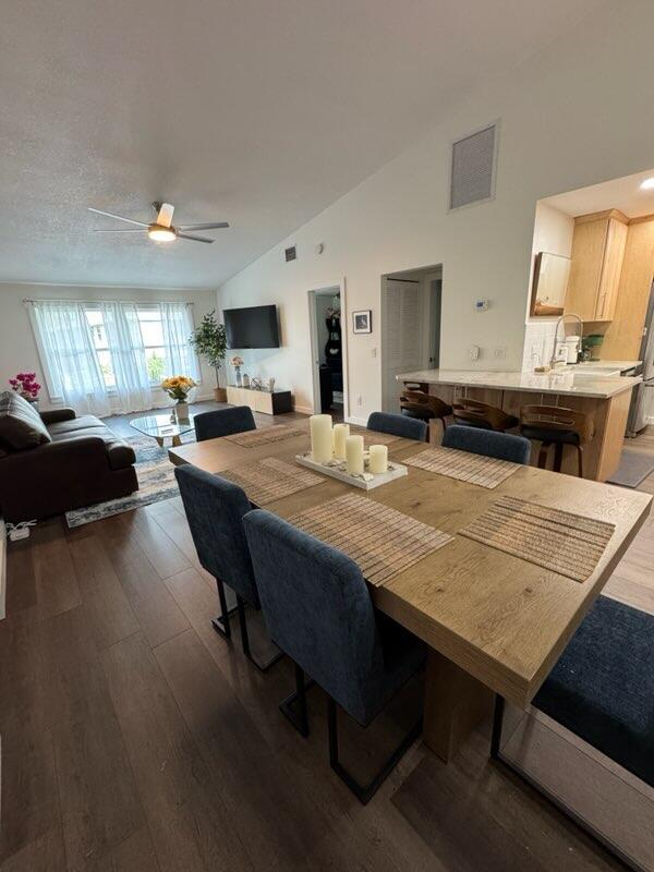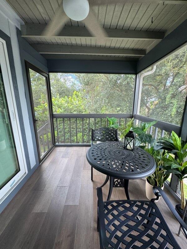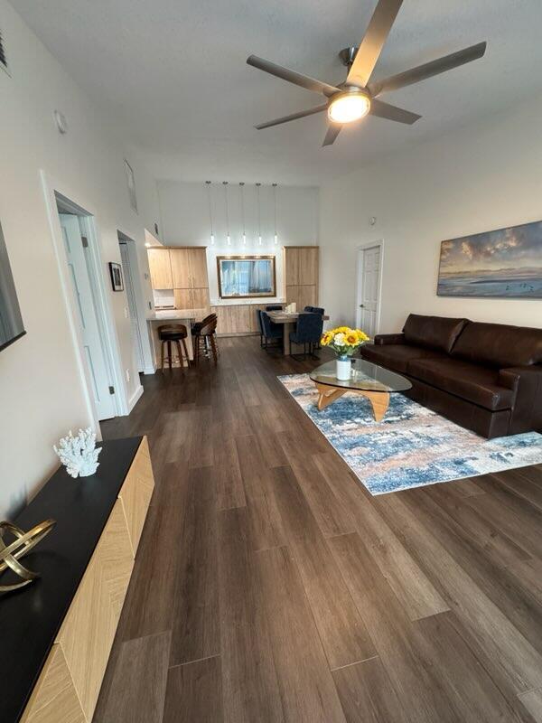 Welcome to this charming 2-bedroom, 2-bath condo, ideally located on the second floor in Hobe Sound, perfectly nestled between the vibrant cities of Jupiter and Stuart. The entrance features a screened balcony, offering a private space for fresh air and relaxation, complete with a convenient locked storage area. Inside, the home is painted in neutral colors, creating a bright and inviting atmosphere. The open-concept living and dining area provides a seamless flow, leading to a functional kitchen with classic cabinets, white appliances, and a snack bar for casual dining. A pantry and a stacked in-unit washer and dryer add to the home's effortless convenience.