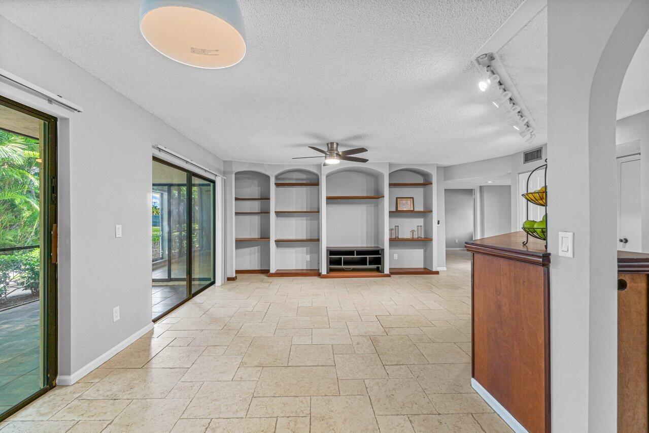 Beautifully updated TWO BEDROOM/ONE BATH FIRST FLOOR UNIT. This light and bright residence offers stone flooring throughout and a redesigned open floorplan. Formal living room and dining room overlooking the outdoor greenspace. Beautifully updated white kitchen boasting stainless appliances, quartz countertops and tile backsplash. Private 20x8 screened and tiled patio perfect for added outdoor living space. Beautifully updated bath located between the two bedrooms with a white vanity, grey quartz top and tub/shower. One car garage with newer washer/dryer and large walk-in storage room. Coach Houses is located in the best Town Center location. Close to Town Center Mall, Publix, Walgreens, CVS, shops & the best restaurants. Cable and water included. Two heated community pools. A must see!