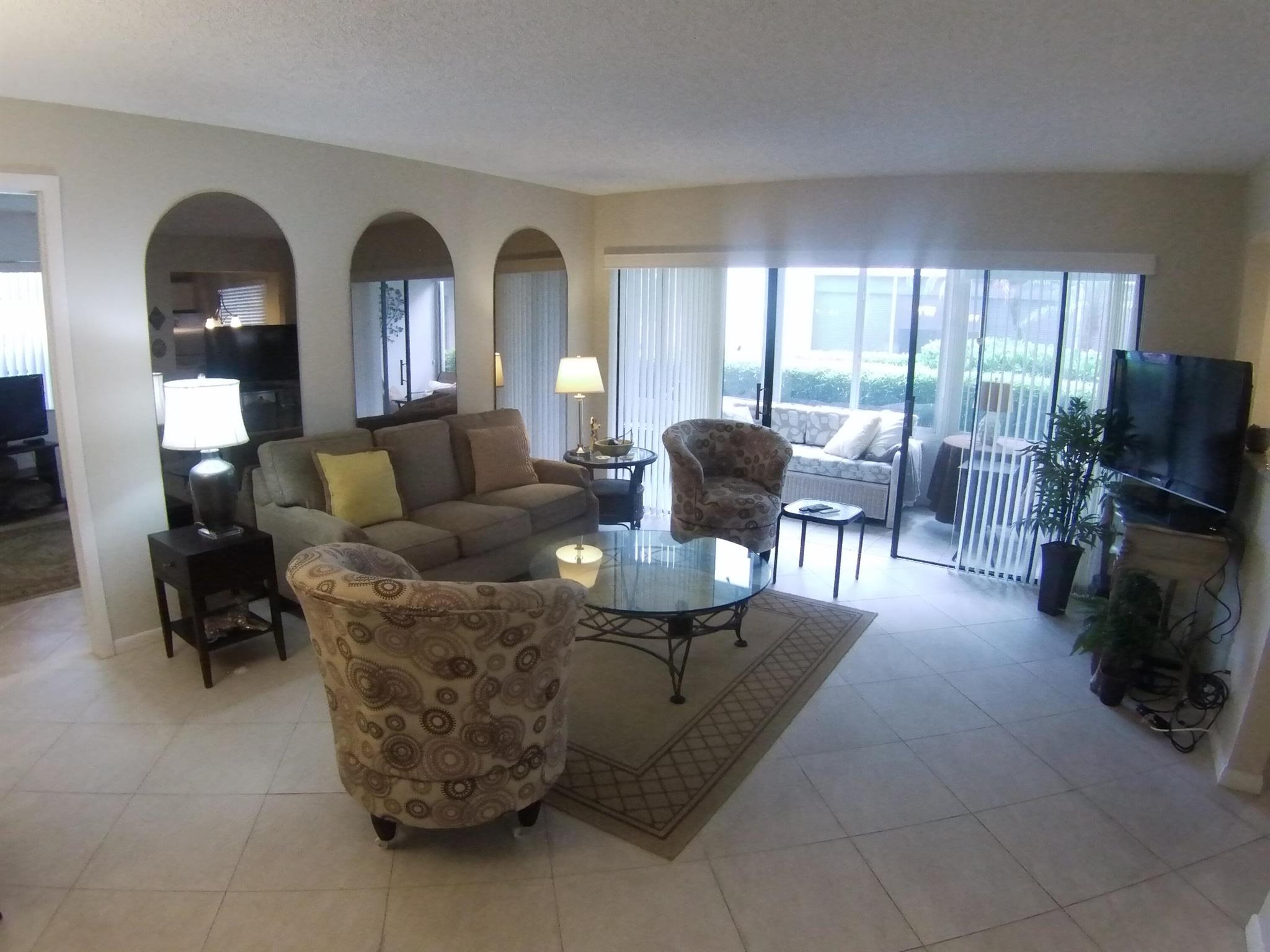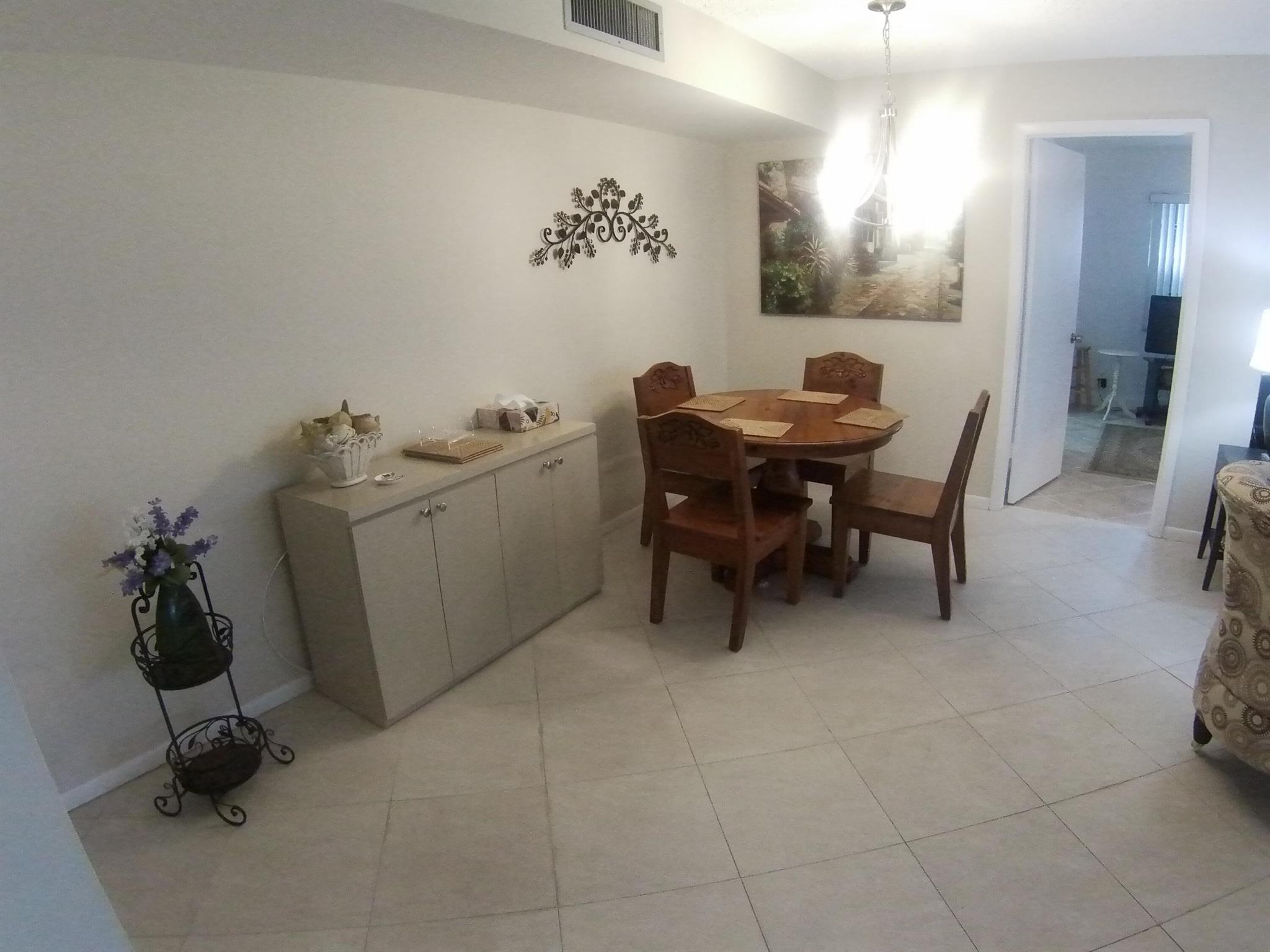 55+ community. SEASONAL RENTAL - First floor, unit furnished, one-bedroom condo. Tile throughout. Updated kitchen cabinets. 1.5 bathrooms. Enclosed patio with washer and dryer. Located 6 miles from the beach and the historic district of Delray Beach. The public library and Delray Market Place are within 2.5 miles of Kings Point. The community has multi-million dollar clubhouses. It also has entertainment, parties, bus service, golf courses, pickleball, tennis, outdoor pools and so much more!