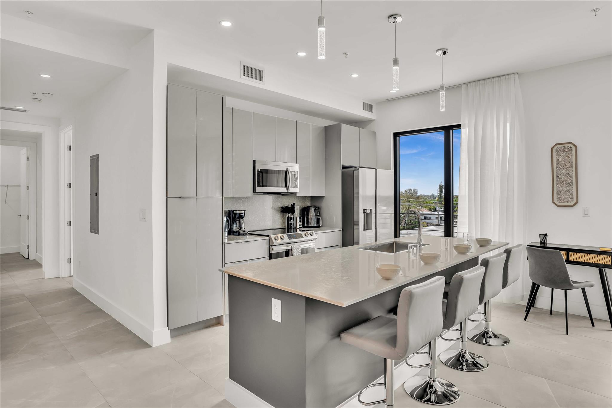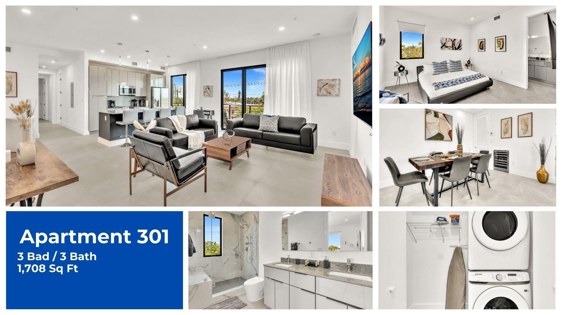 Experience boutique living at its finest – only 12 residences at OceanWave Apartments, completed in 2024. Spacious 3BR/3BA corner units feature soaring ceilings, abundant natural light, premium finishes, and private balconies. Each apartment comes fully equipped with high-end appliances – including dishwasher, washer/dryer, and a wine fridge. Enjoy resort-style amenities: a private fitness center and a panoramic rooftop with BBQ and lounge areas. Nestled in a quiet, safe neighborhood, just minutes from the beach, Fort Lauderdale Airport, and Port Everglades. Walking distance to Publix, Whole Foods, LA Fitness, restaurants, and shopping. September Special: Fully or partially furnished options available at no extra cost.