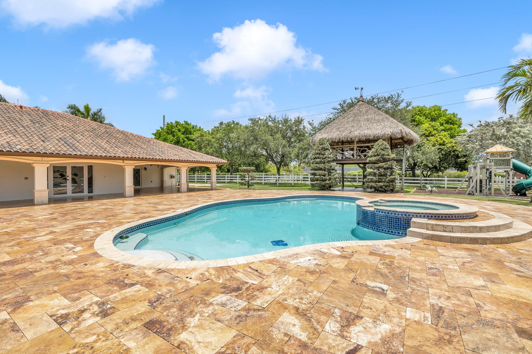 Welcome to this ultra-luxury estate in prestigious Southwest Ranches For Rent or For Sale, set on 2.03 meticulously maintained acres. Fully renovated, this exceptional property is a true masterpiece. The estate includes 8 horse stables & a separate 4,000 sqft garage featuring a private upstairs office with A/C, ideal for conversion into a guest house and another 1,000 sqft garage/storage area. The main residence spans 4,000 sq ft under air and showcases 5 bedrooms, 4 bathrooms, impact windows, a redesigned private gated driveway, and a laundry/utility/mudroom for added functionality. Step outside to your private resort-style oasis, complete with a large pool, Brazilian teak wood ceilings, a summer kitchen, a pool house, and a stunning two story tiki hut with electric and lighting.