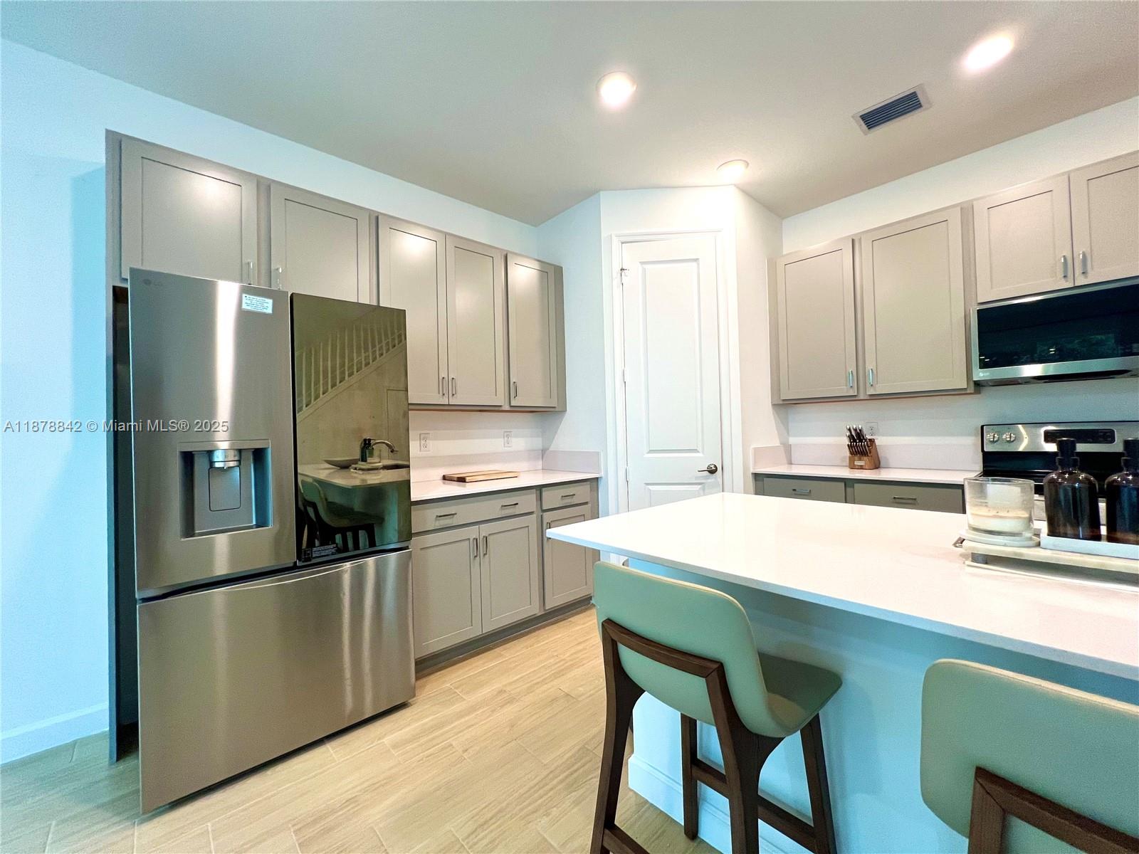 NO HOA approval process!! Quick move-in :) This LARGE LUXURY townhome comes with a wide foyer and open layout. The soaring 24 ft ceiling above the staircase, wood-look plank tile floors, wood cabinetry ,QUARTZ counter tops and STAINLESS STEEL appliances create a beautiful upgraded space. All 3 bedrooms are upstairs with a large laundry room. Lots of storage throughout. Impact windows & Doors & backyard space for your convenience. LAWN CARE included! This a secure community with GATED ENTRY. Other amenities include pool, gym, bbq area etc. Check out the schools! :) 2 min away from the Turnpike. Easy access to shopping & dining!