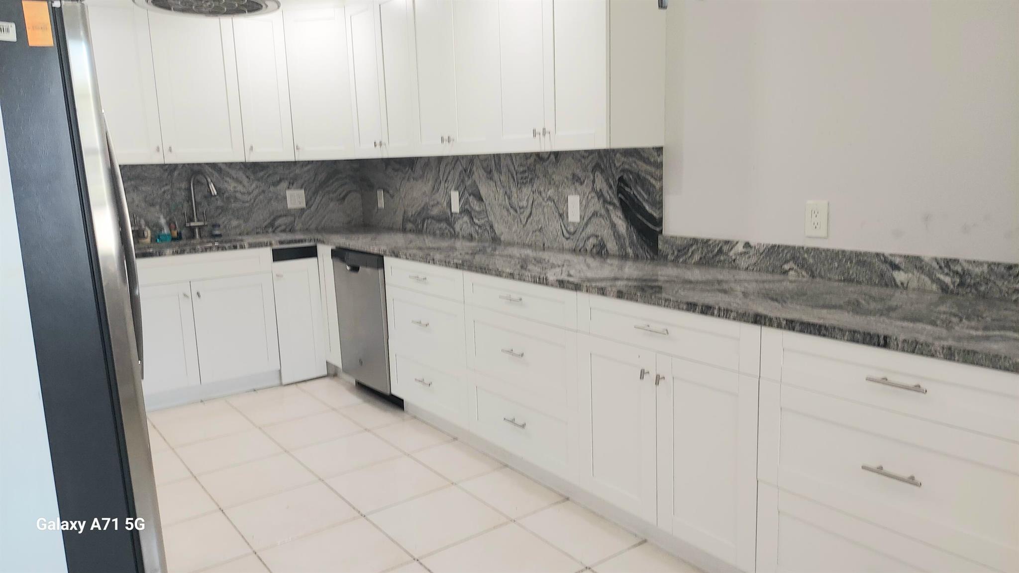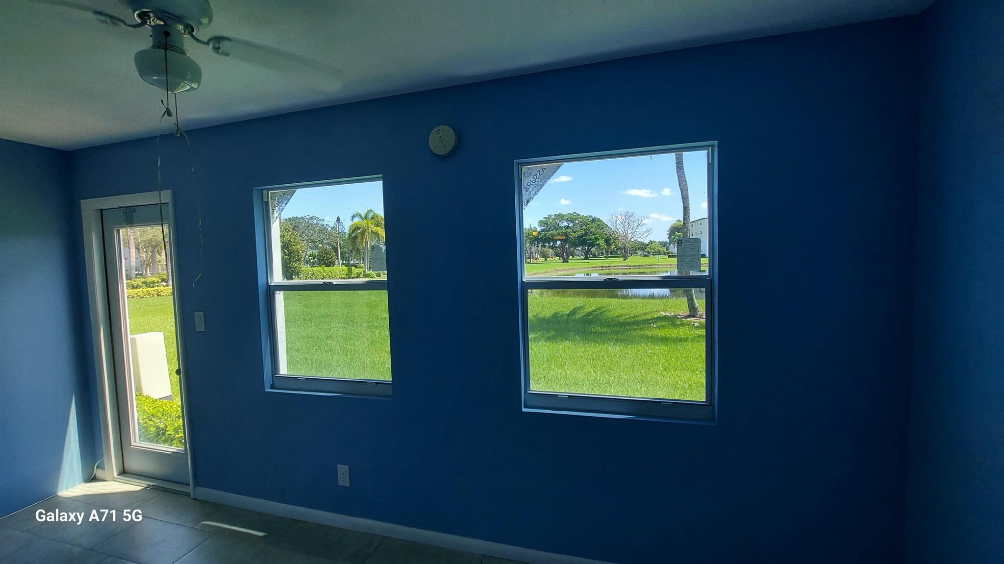 RENOVATED Kitchen! In 55 plus community with FIRST FLOOR WATERVIEW! Sparkling! Hurricane proof windows and doors in rear Lani which creates another room. Beautifully RENOVATED kitchen with granite cabinets extended into dining area for countertops and backsplash, with the increased cabinet space creating a larger kitchen look! MODERN WHITE kitchen! Stainless-steel appliances! Double sink! This 2-bedroom 2 bath has a very spacious feeling. Bathrooms with new vanity and modern toilet. Recessed lighting in kitchen. This condo is unfurnished