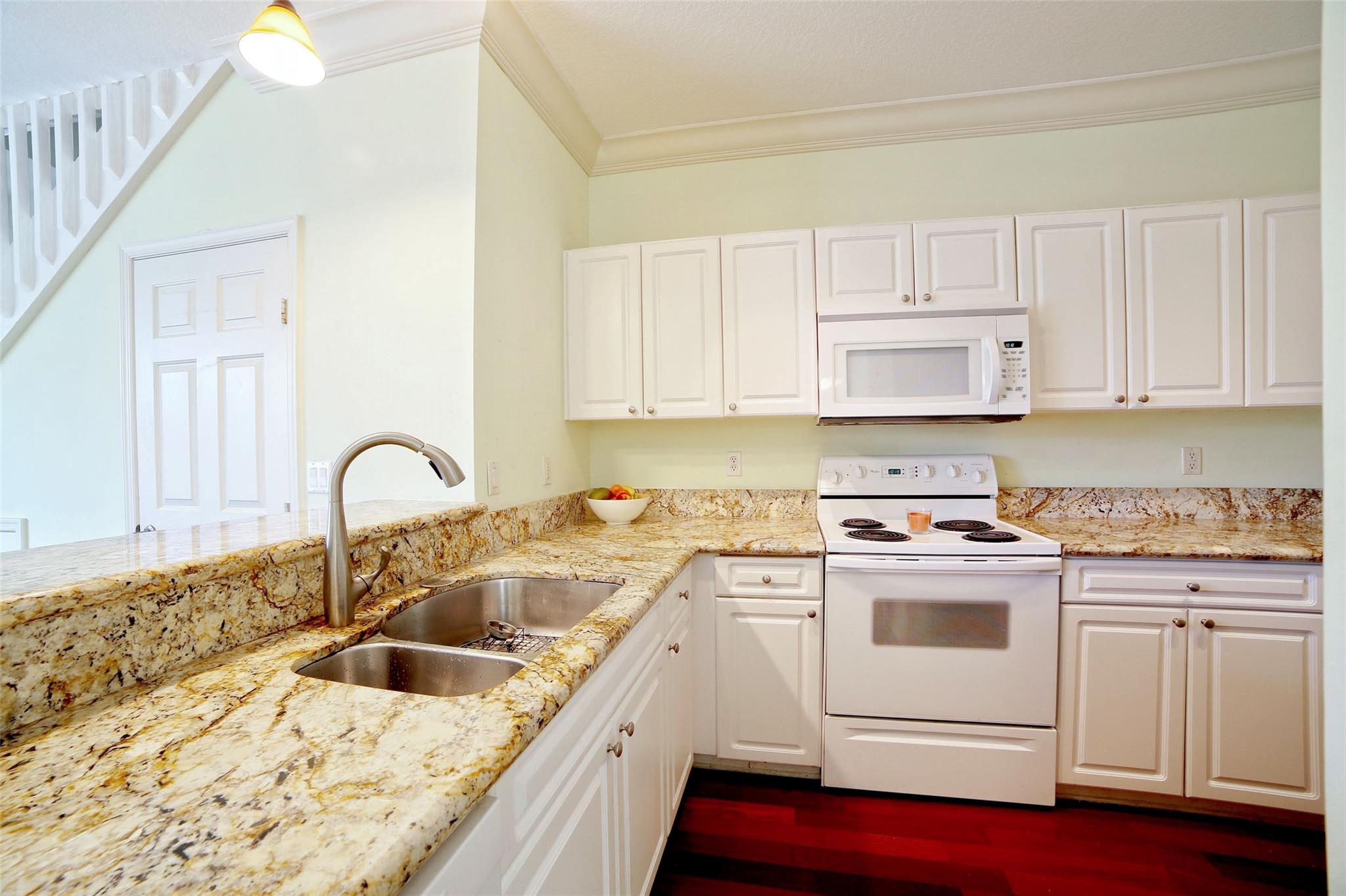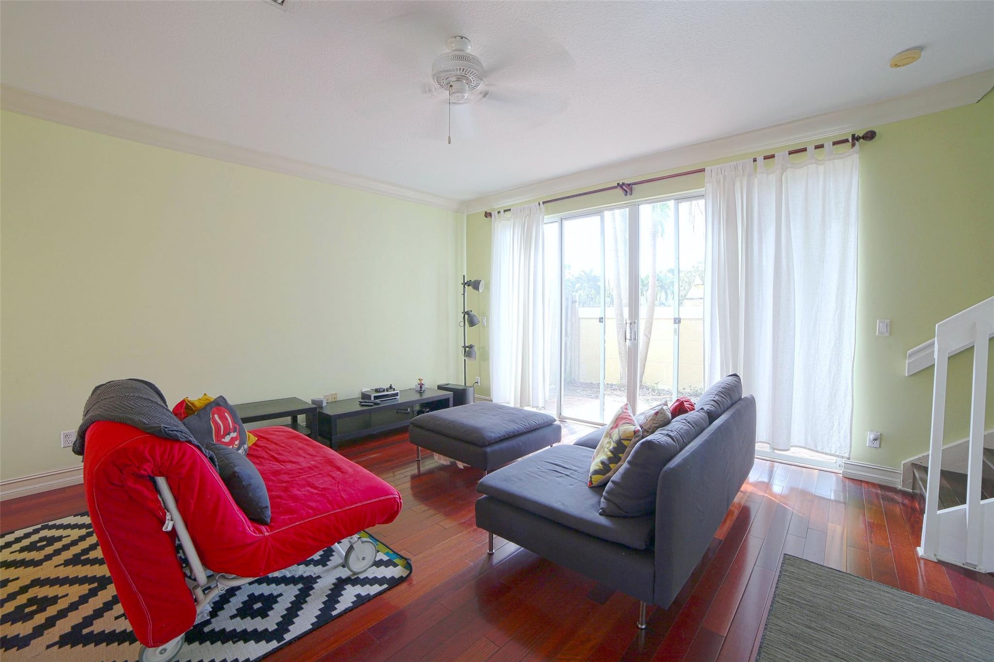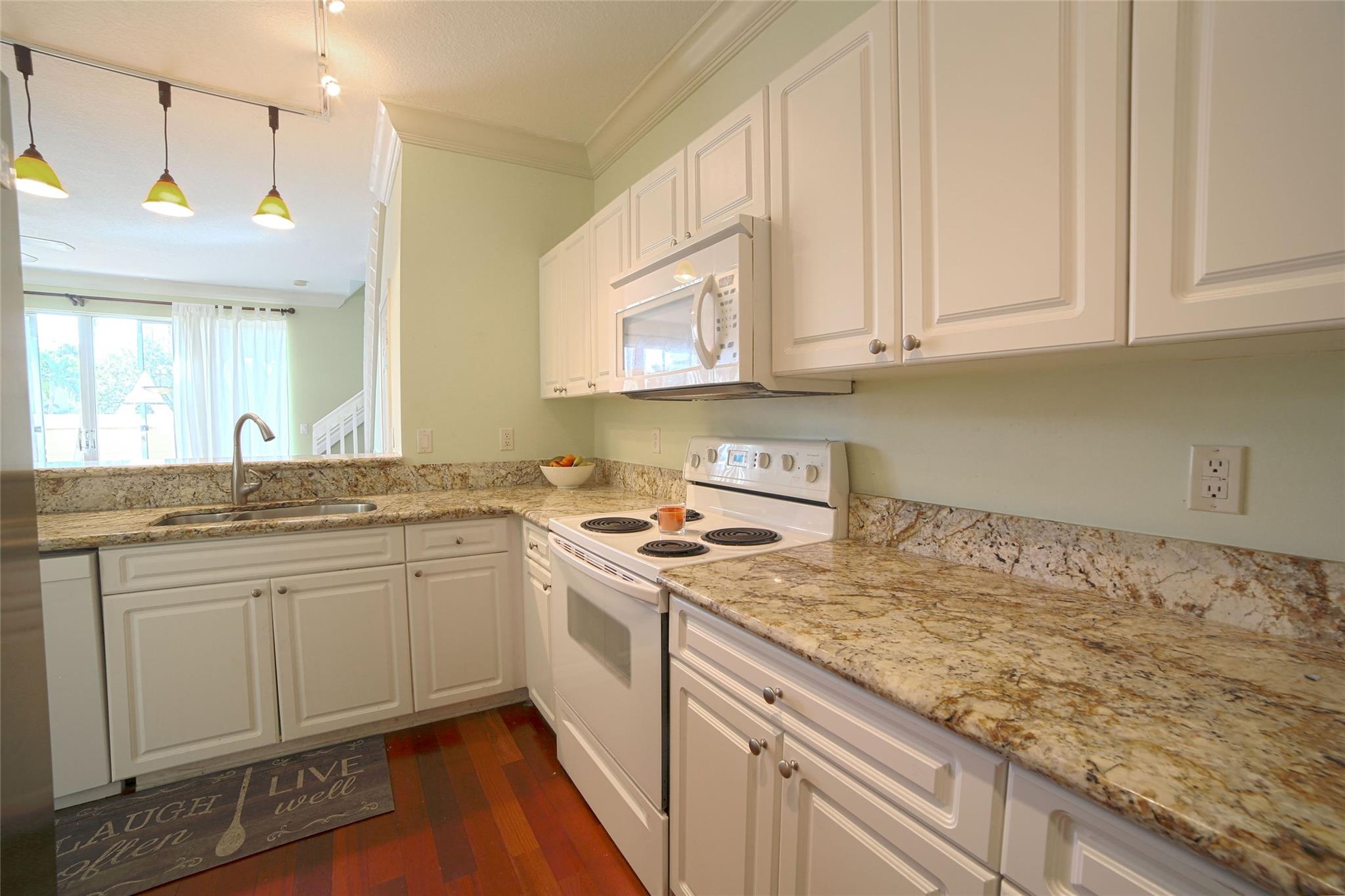 Centrally and conveniently located near shops, dining, beach and entertainment. This is lovely and spacious two-story townhouse with soaring high volume ceilings with lots of natural light and cherry wood floor throughout the ground level, which consists of a formal living and dining, kitchen, a half-bathroom and one car garage; White wood cabinets, and granite counter-tops in the kitchen. Laminate-wood floors upstairs which consists of two bedrooms and two bathrooms. There is a charming patio, perfect for BBQ and entertaining. Walk to the community pool. The location is ideal, just 1 mile from the beach and walking distance to Deerfield Elementary