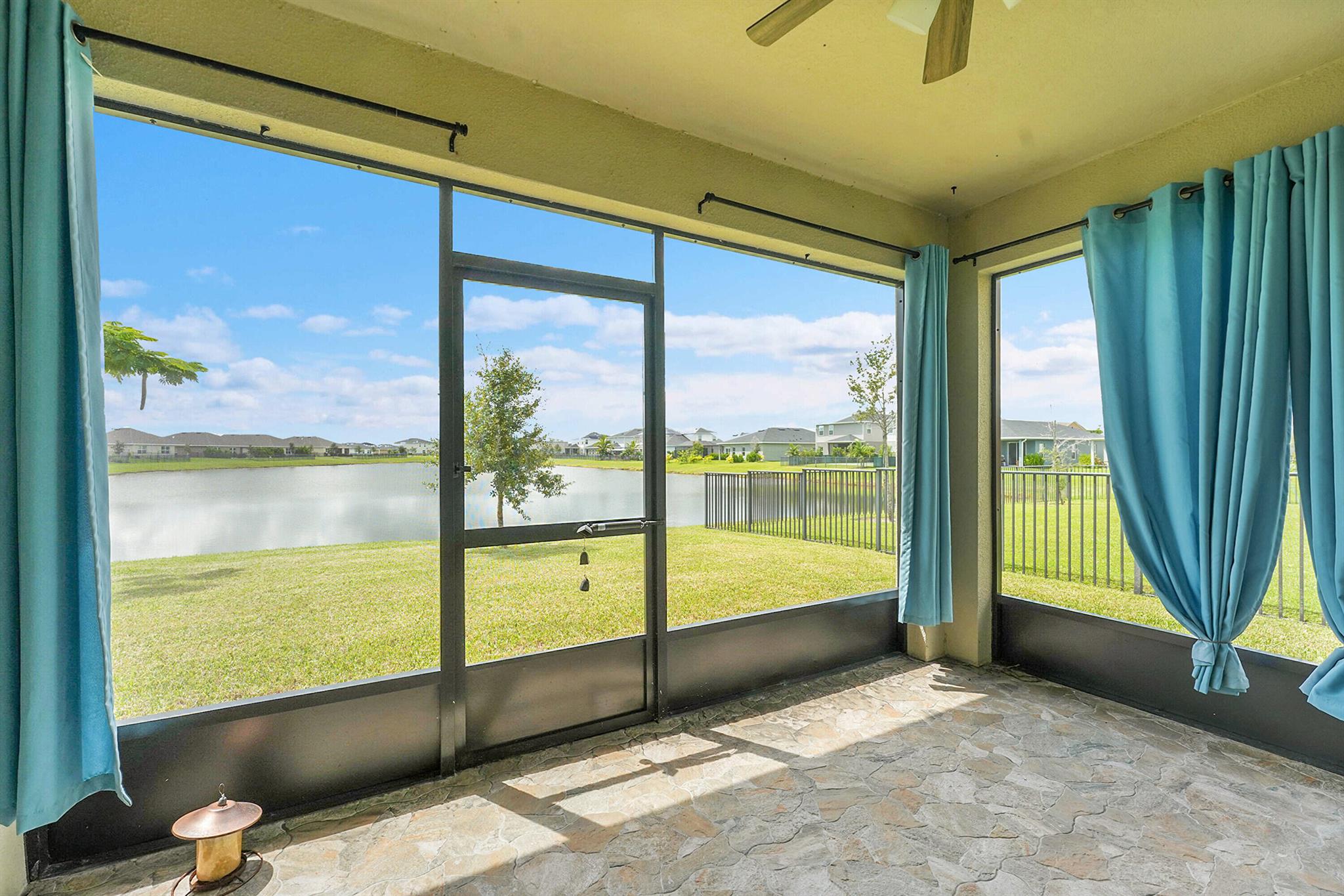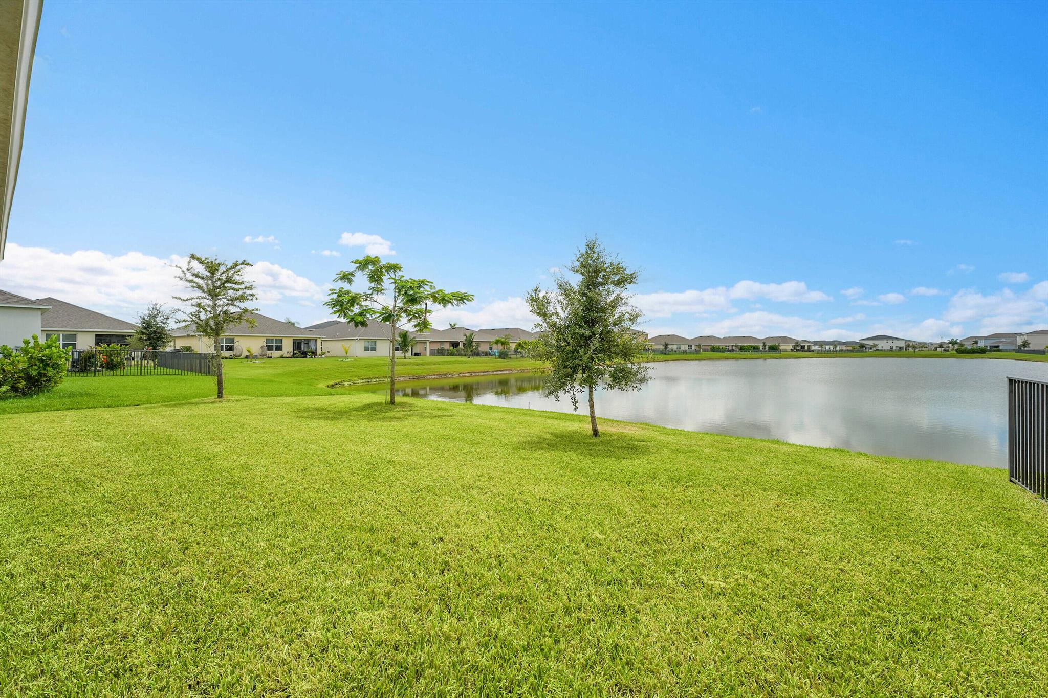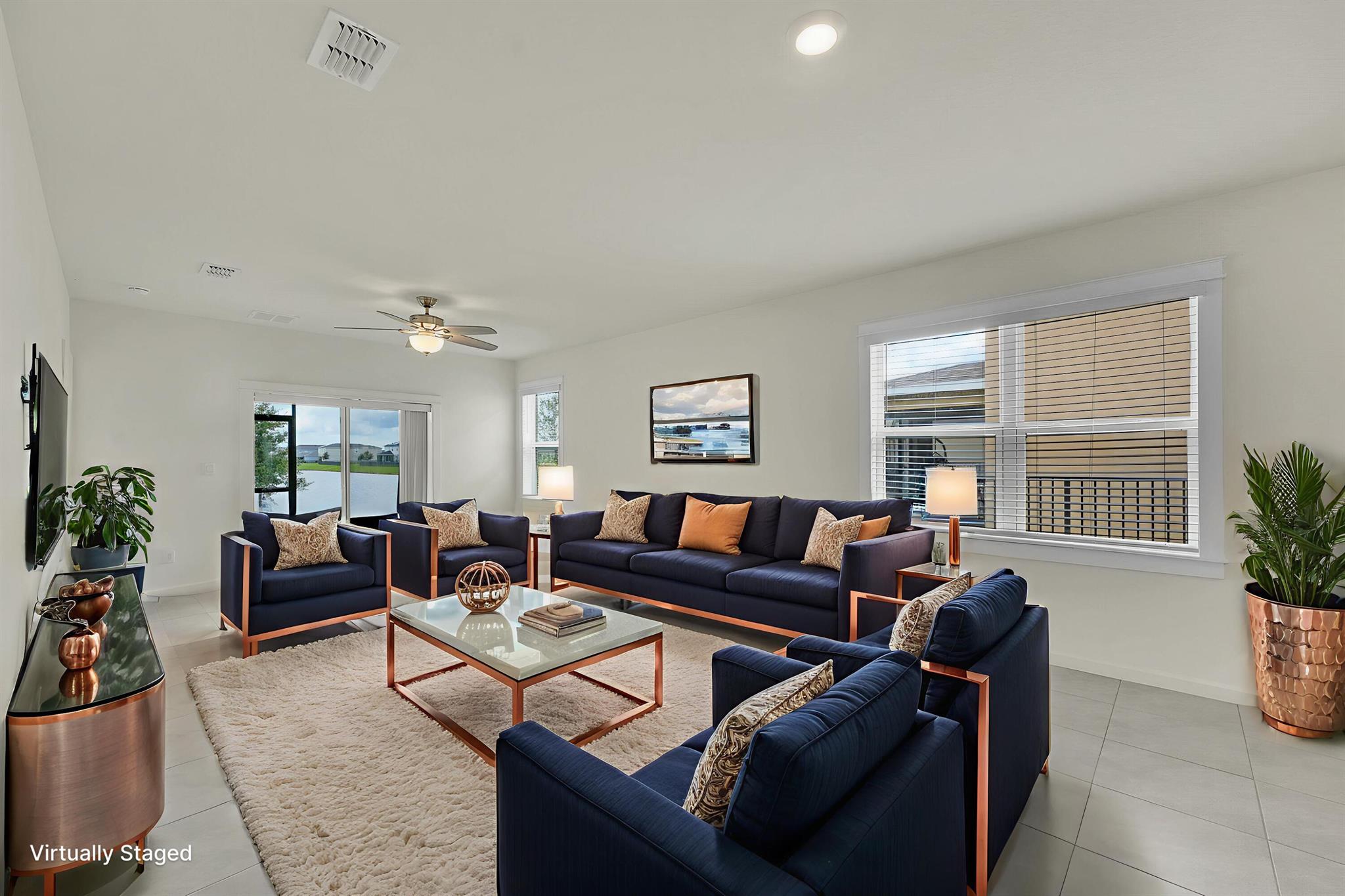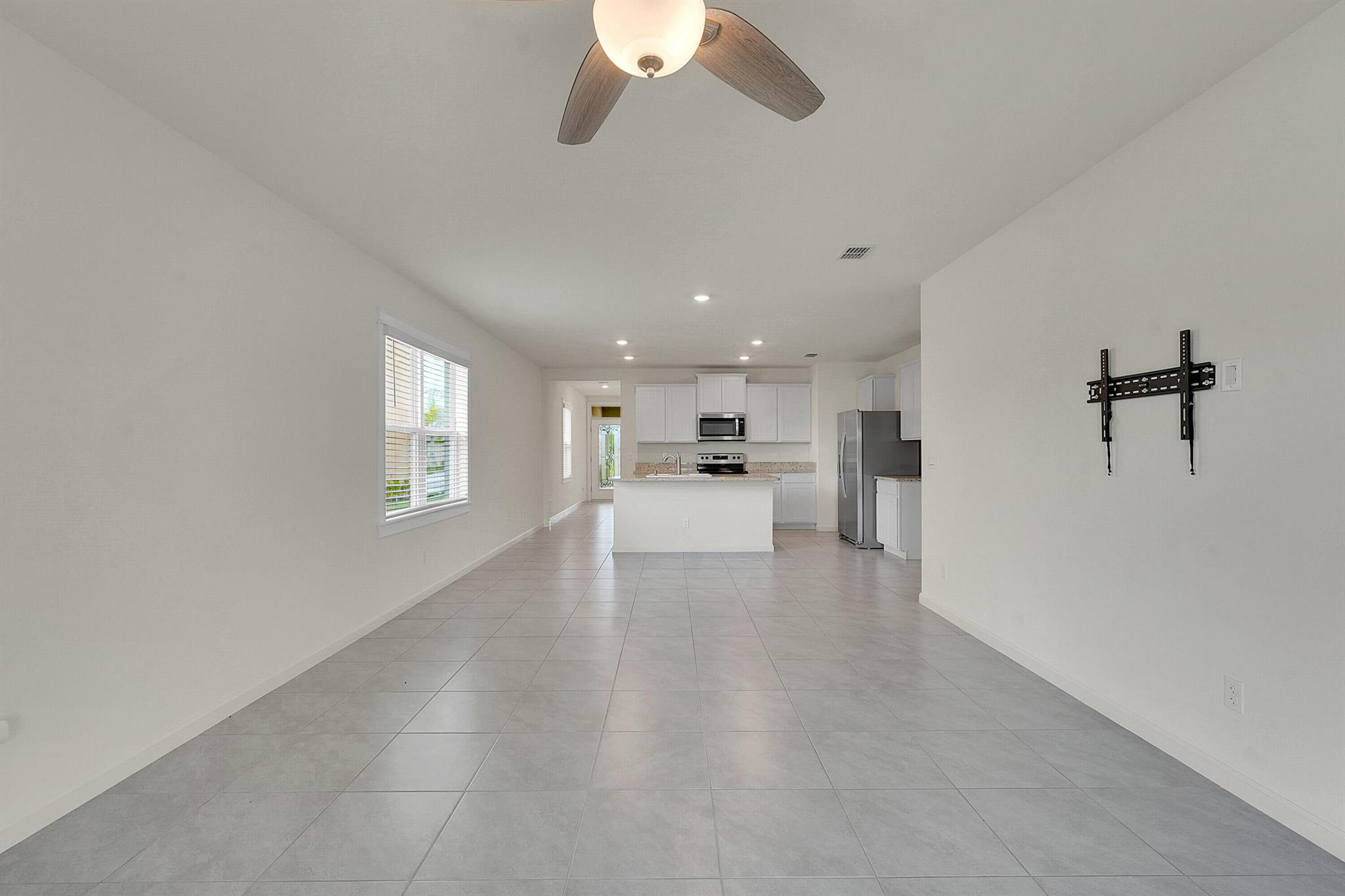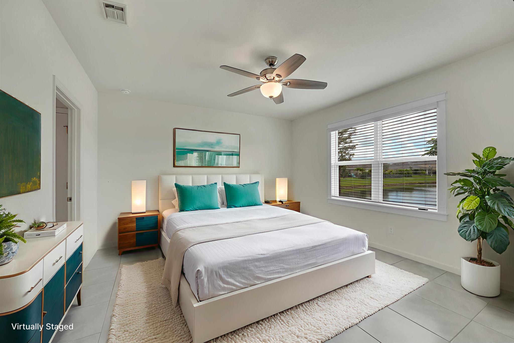 Beautifully maintained 3BR/2BA solar-powered home in Crosstown Commons with tranquil lake views and tile flooring throughout. The open-concept layout includes a modern kitchen with white cabinetry, stainless steel appliances, center island, and spacious living and dining areas. The primary suite features dual vanities, walk-in shower, and walk-in closet. Enjoy peaceful evenings from the screened patio overlooking the lake, can peacefully watch sunset. Community amenities include a pool, playground, and sidewalks. Low HOA. Conveniently located near I-95, Tradition, and St. Lucie West shopping and dining.
