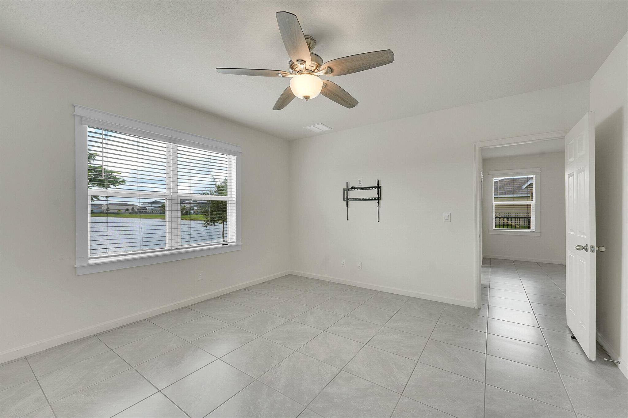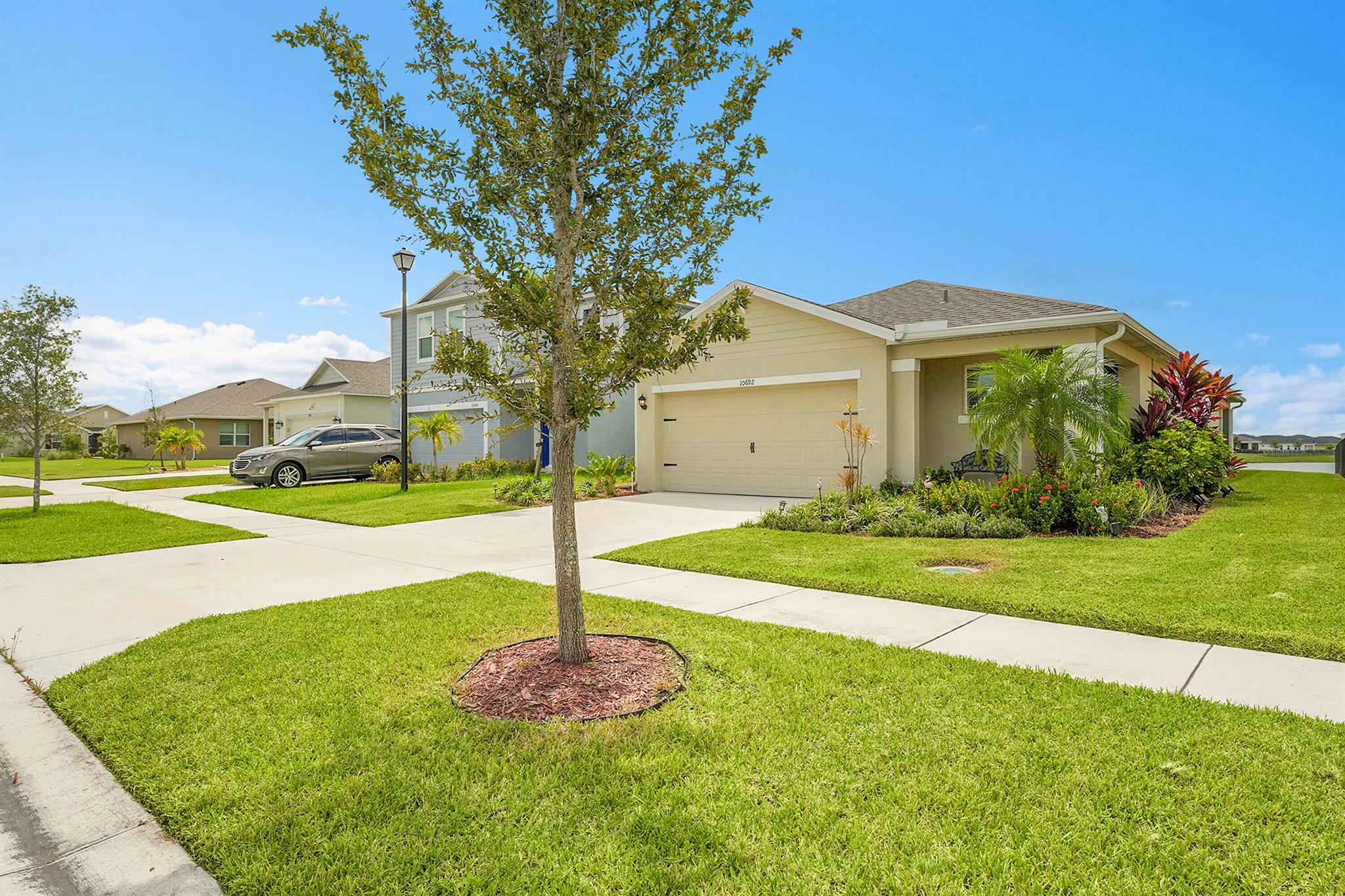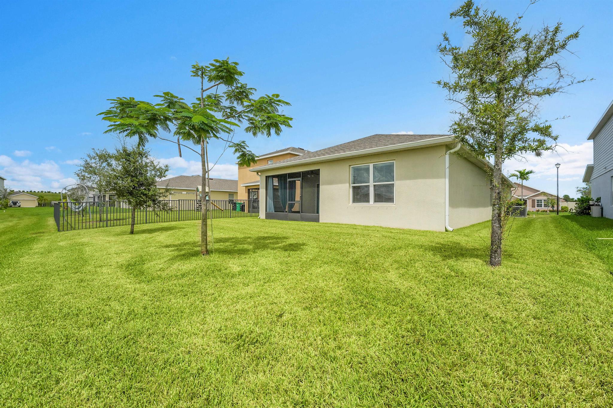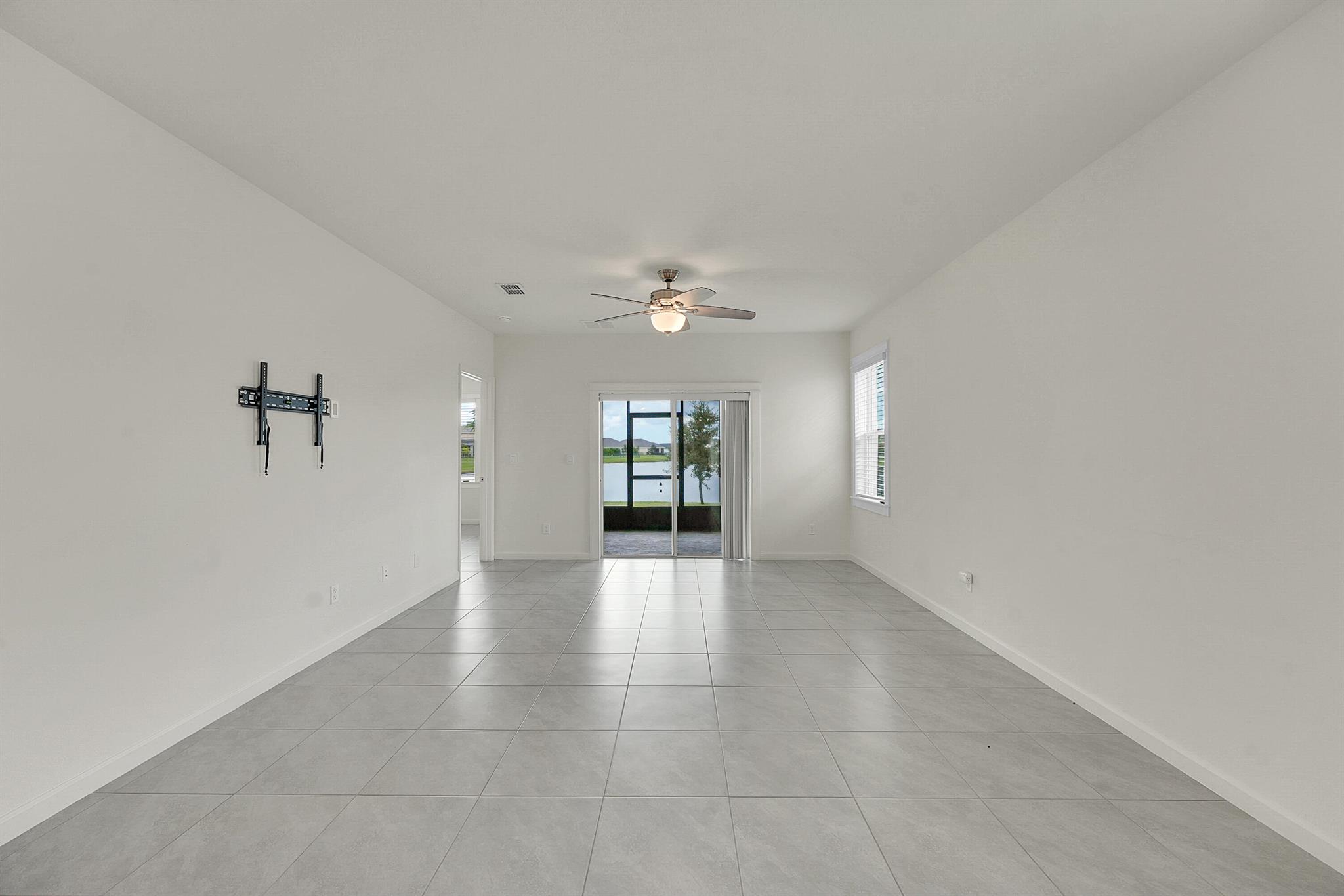 Beautifully maintained 3BR/2BA solar-powered home in Crosstown Commons with tranquil lake views and tile flooring throughout. The open-concept layout includes a modern kitchen with white cabinetry, stainless steel appliances, center island, and spacious living and dining areas. The primary suite features dual vanities, walk-in shower, and walk-in closet. Enjoy peaceful evenings from the screened patio overlooking the lake, can peacefully watch sunset. Community amenities include a pool, playground, and sidewalks. Low HOA. Conveniently located near I-95, Tradition, and St. Lucie West shopping and dining.