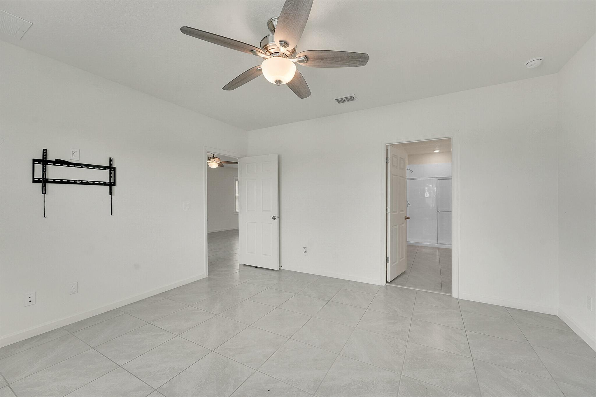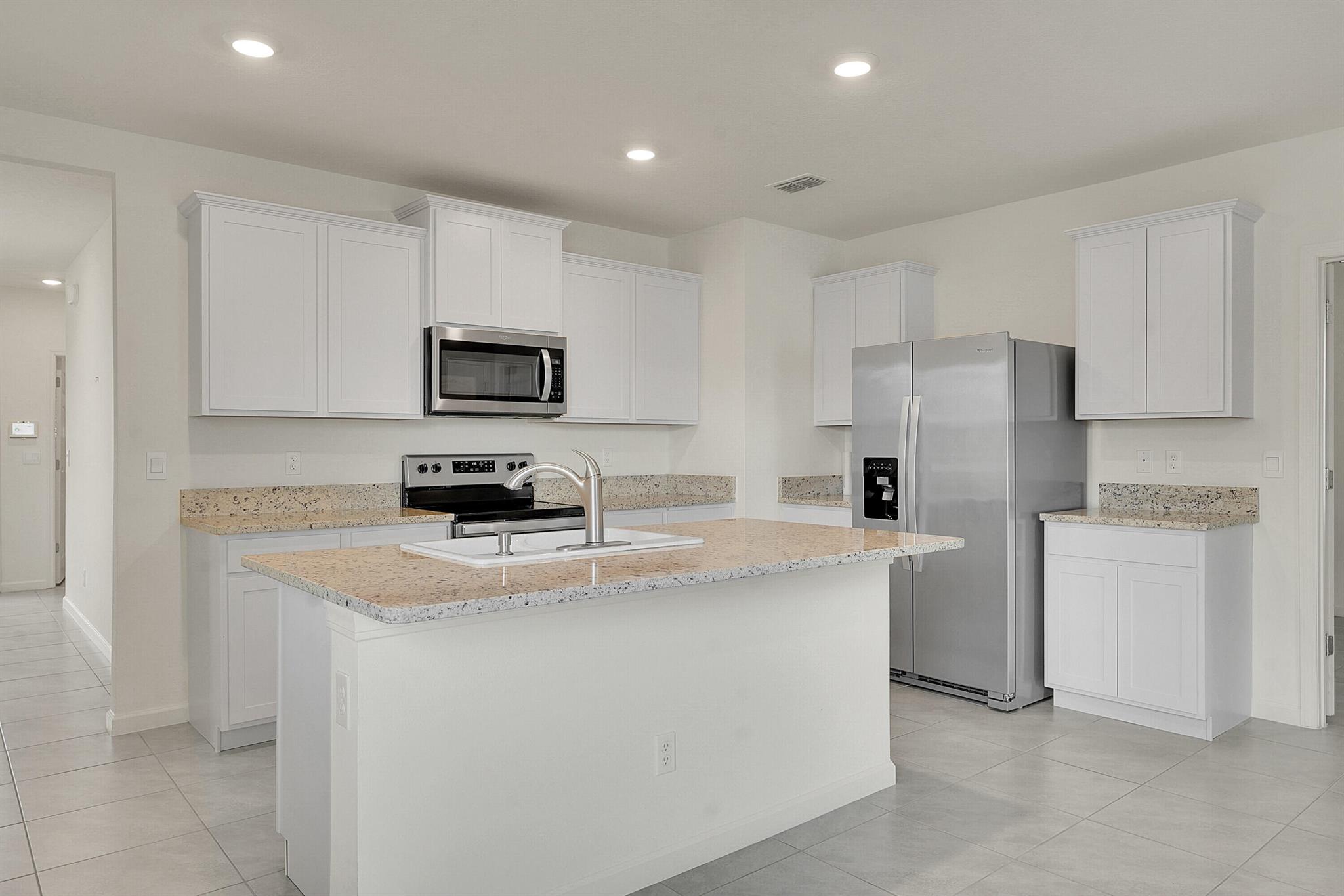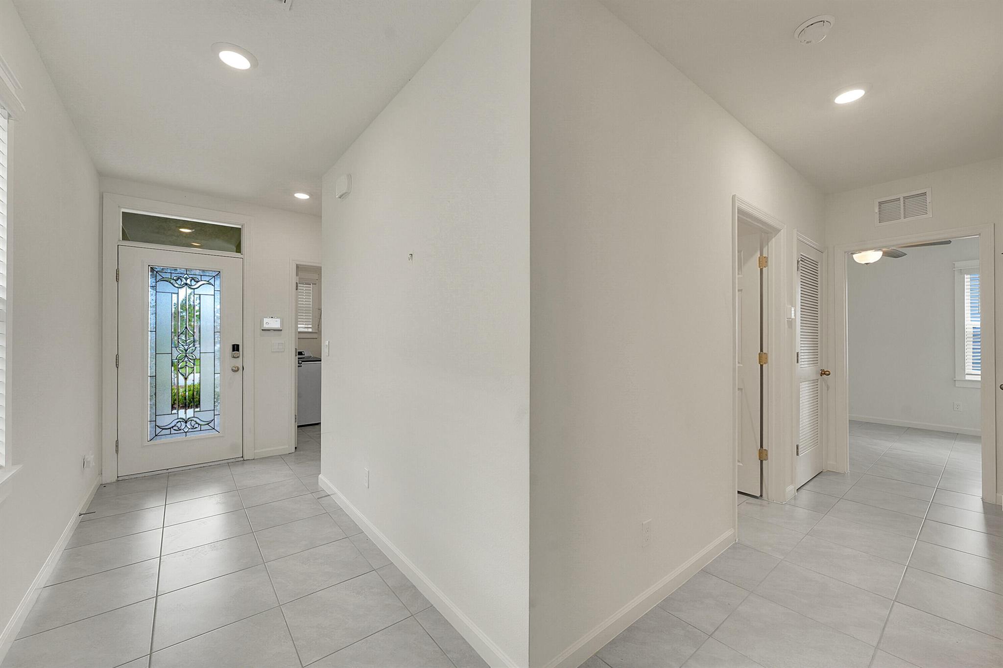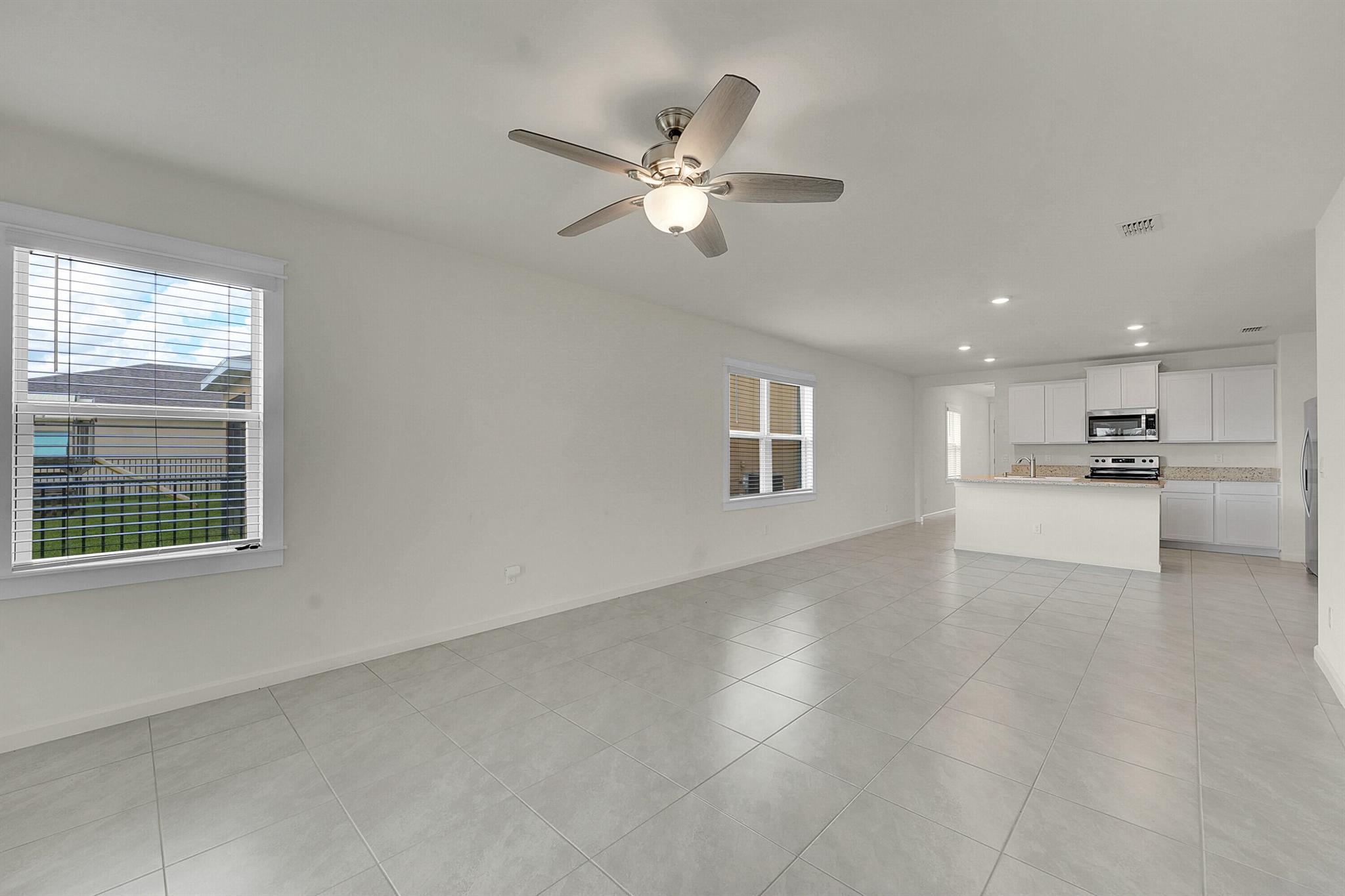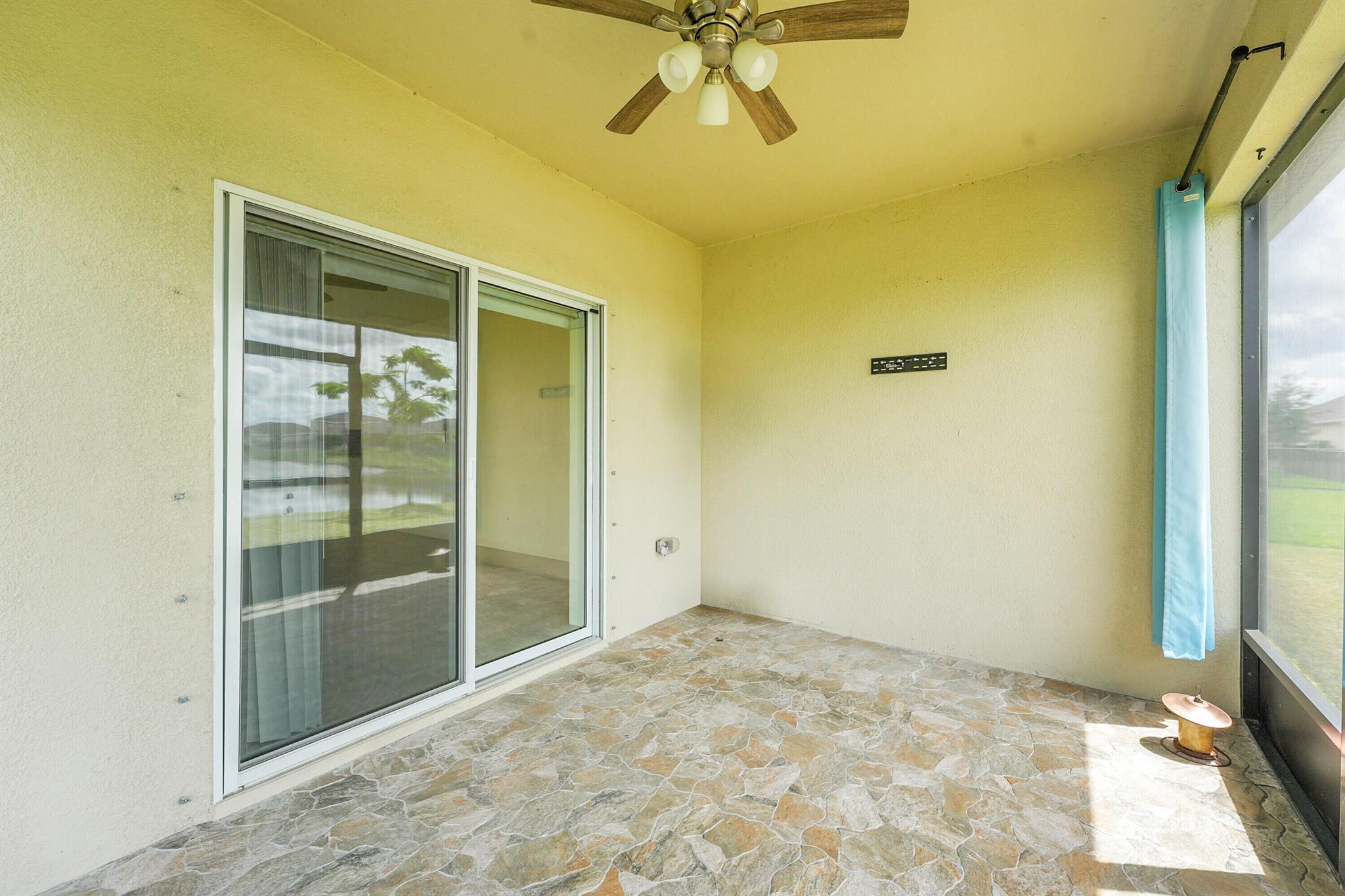 Beautifully maintained 3BR/2BA solar-powered home in Crosstown Commons with tranquil lake views and tile flooring throughout. The open-concept layout includes a modern kitchen with white cabinetry, stainless steel appliances, center island, and spacious living and dining areas. The primary suite features dual vanities, walk-in shower, and walk-in closet. Enjoy peaceful evenings from the screened patio overlooking the lake, can peacefully watch sunset. Community amenities include a pool, playground, and sidewalks. Low HOA. Conveniently located near I-95, Tradition, and St. Lucie West shopping and dining.