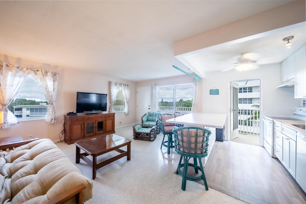 Location, location, location! It does not get better than DIRECTLY on the beach, with private access. Welcome to your dream coastal retreat on beautiful Singer Island! This stunning oceanfront building is located right on the sandy shores of the beach. Situated on the top (4th) floor, this end unit provides expansive views of the ocean from your private SCREENED balcony--an ideal spot to savor the breathtaking sunrises and sunsets. Step inside this charming 1 bedroom, 1 bathroom unit, FULLY FURNISHED. Just bring your suitcase. The open floor plan creates a seamless flow, featuring a coastal kitchen.