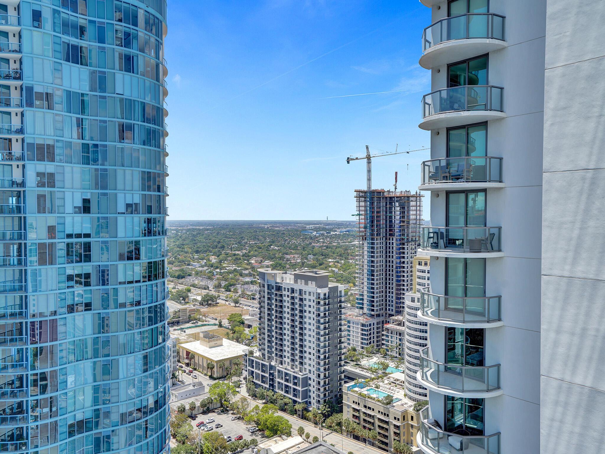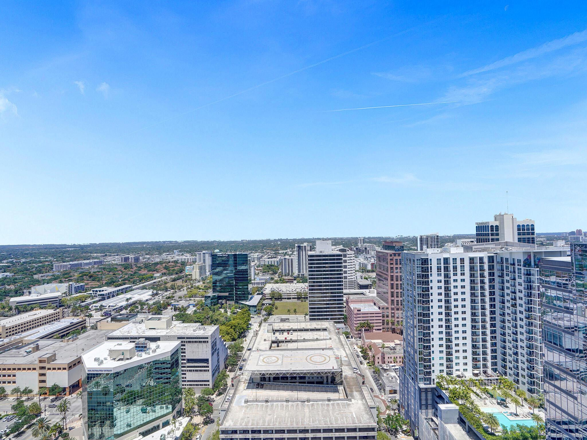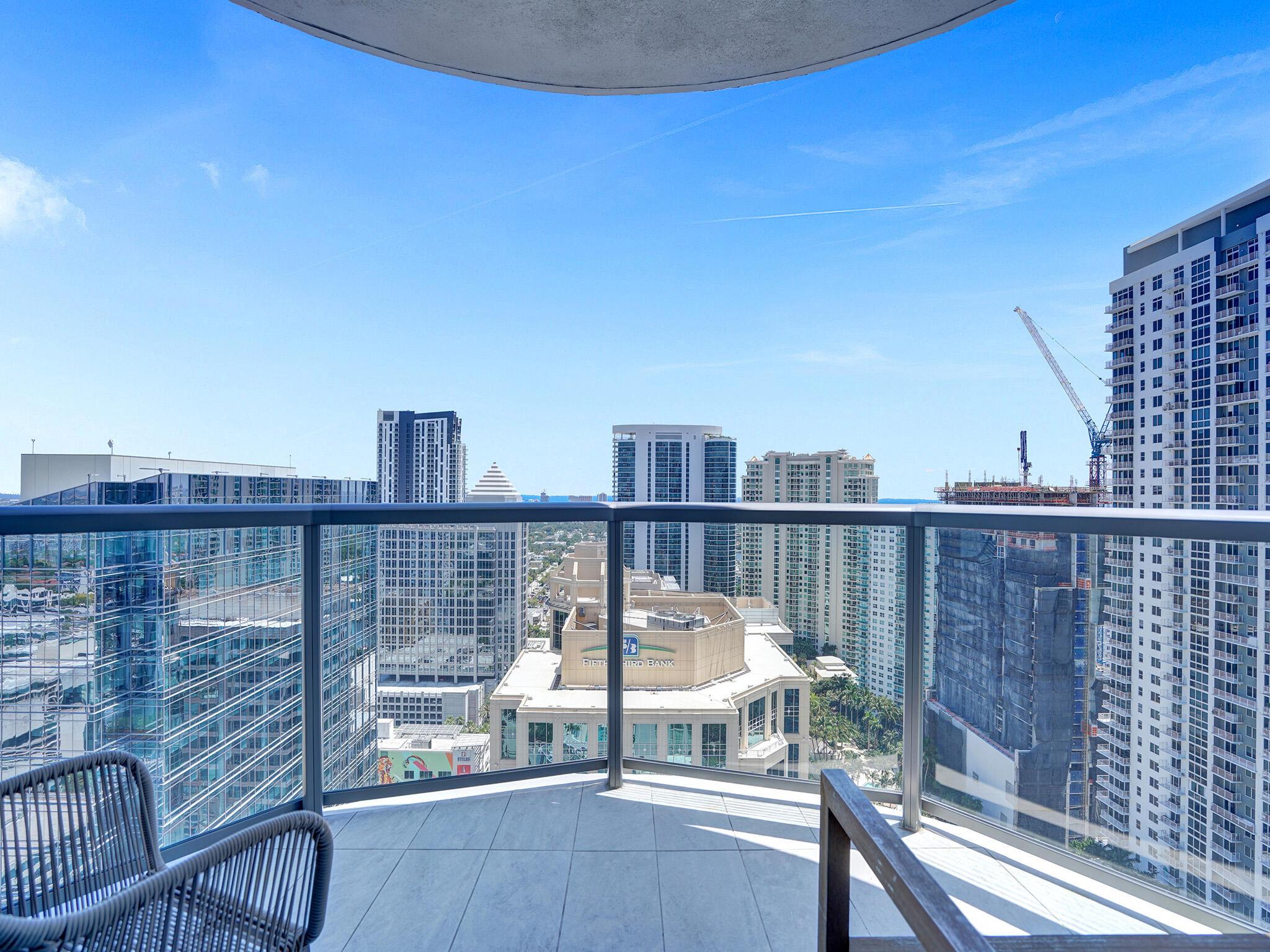 Fabulous sweeping panoramic backdrop of downtown Ft. Lauderdale's City Skyline with River & ocean views from its newest & tallest address, 100 Las Olas with wrap around, curved terrace. Walk to restaurants, shops, night life, grocers, theater & water taxi. From stunning sunrises & sunsets to sparkling city night lights, this highly desirable Model ''A''open floorplan with modern European cabinetry, top of the line appliances, waterfall island, sparkling white tile, Smart tech, remote solar blinds on all sliders & windows has it all! Third Bed is Office with Murphy Bed for versatility. Primary Bed has private balcony, spectacular views, huge walk-in closet seamless glass bath. 2 garage spots. Resort style living incl. pool, full gym, sundeck, grille, coffee room, party room & more.