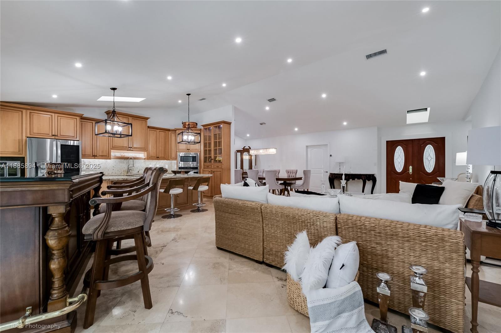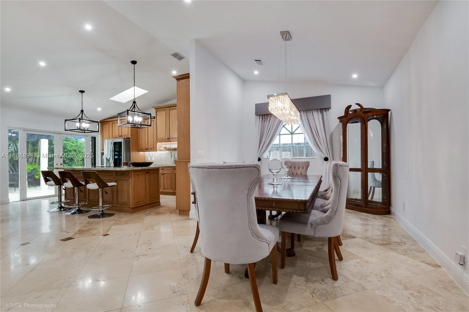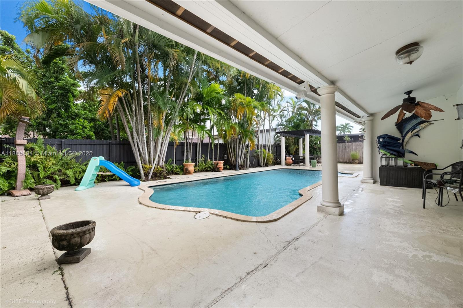 Welcome to this four-bedroom, two-bathroom pool home for rent in sought-after Calusa Club Estates. Enjoy an open-concept layout with a spacious kitchen and island, large dining area, and bright living spaces. The garage has been converted to provide a fourth bedroom plus storage and laundry. The master suite offers a spacious bedroom, walk-in closet, and beautifully renovated bathroom, while the secondary bath has also been updated. Step outside to a fenced backyard with a pool, open covered porch, and space for gatherings. A circular driveway allows for ample parking. Calusa Club Estates offers quick access to the Turnpike, top-rated schools, supermarkets, and dining. Lawn maintenance and pool service included. No HOA. 1 dog allowed under 25 pounds.