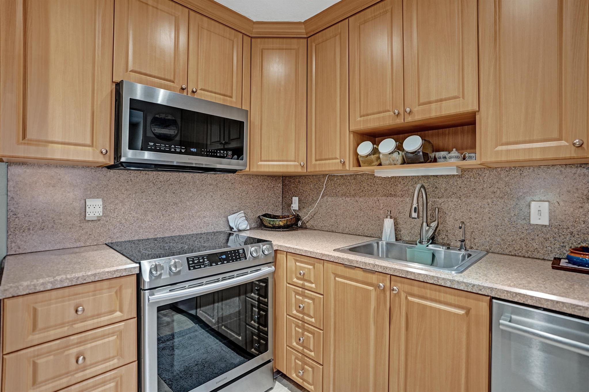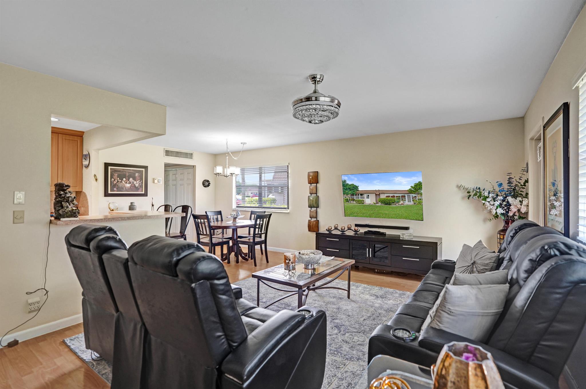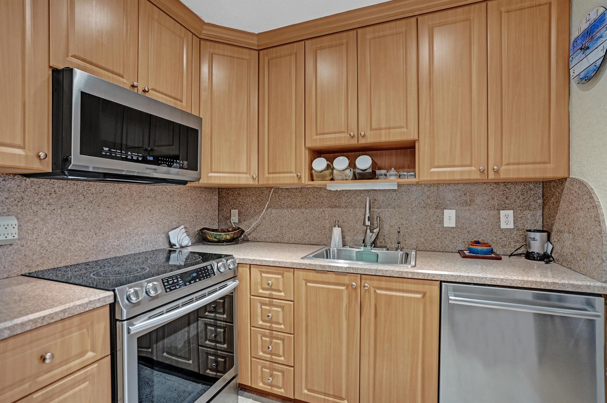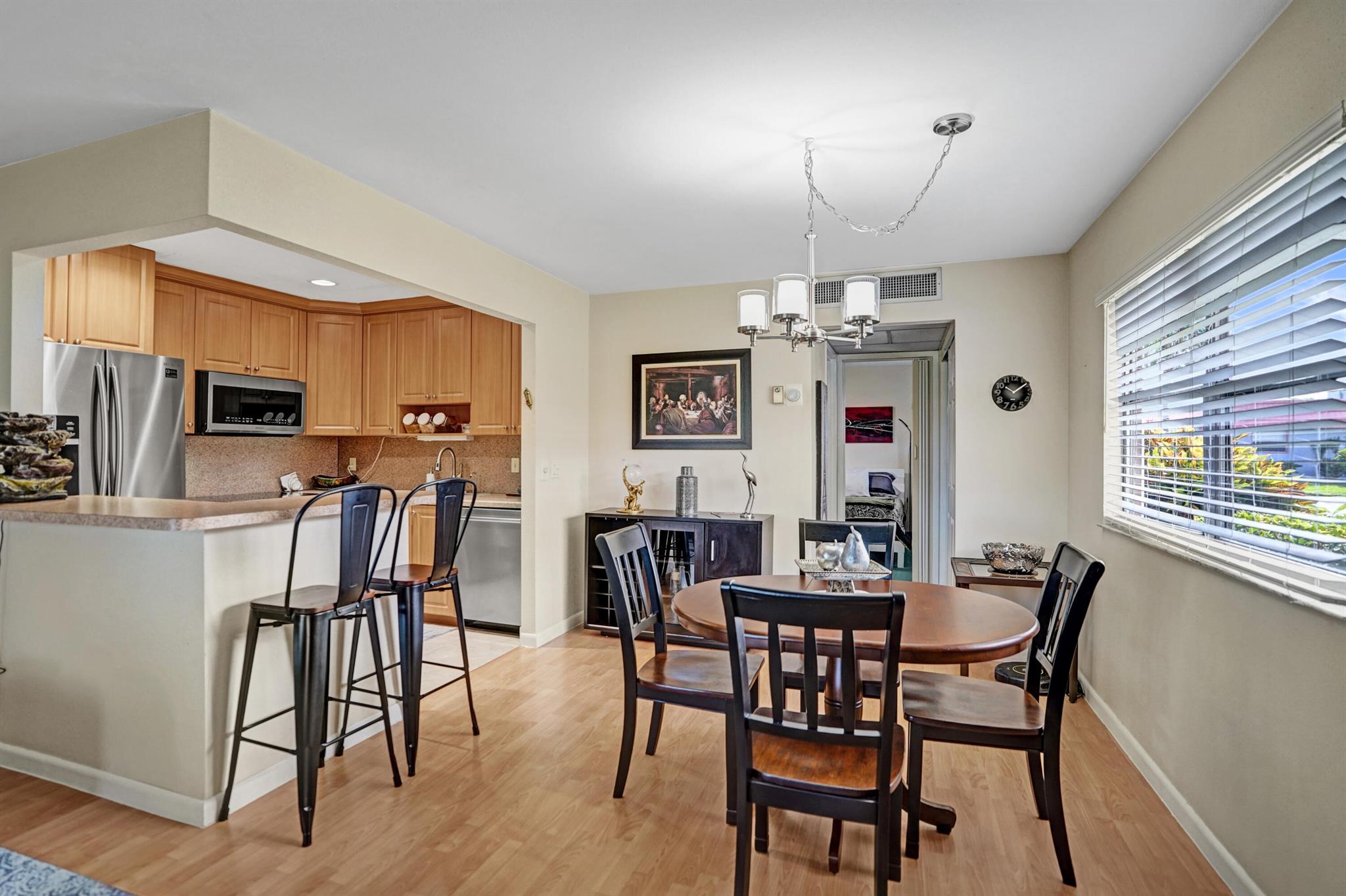 Beautiful and sparkling fully furnished unit with a wonderful lake view from the living room. Florida room has impact windows and wall a/c for comfort. Great open wood cabinet kitchen with bar seating stainless steel appliances and