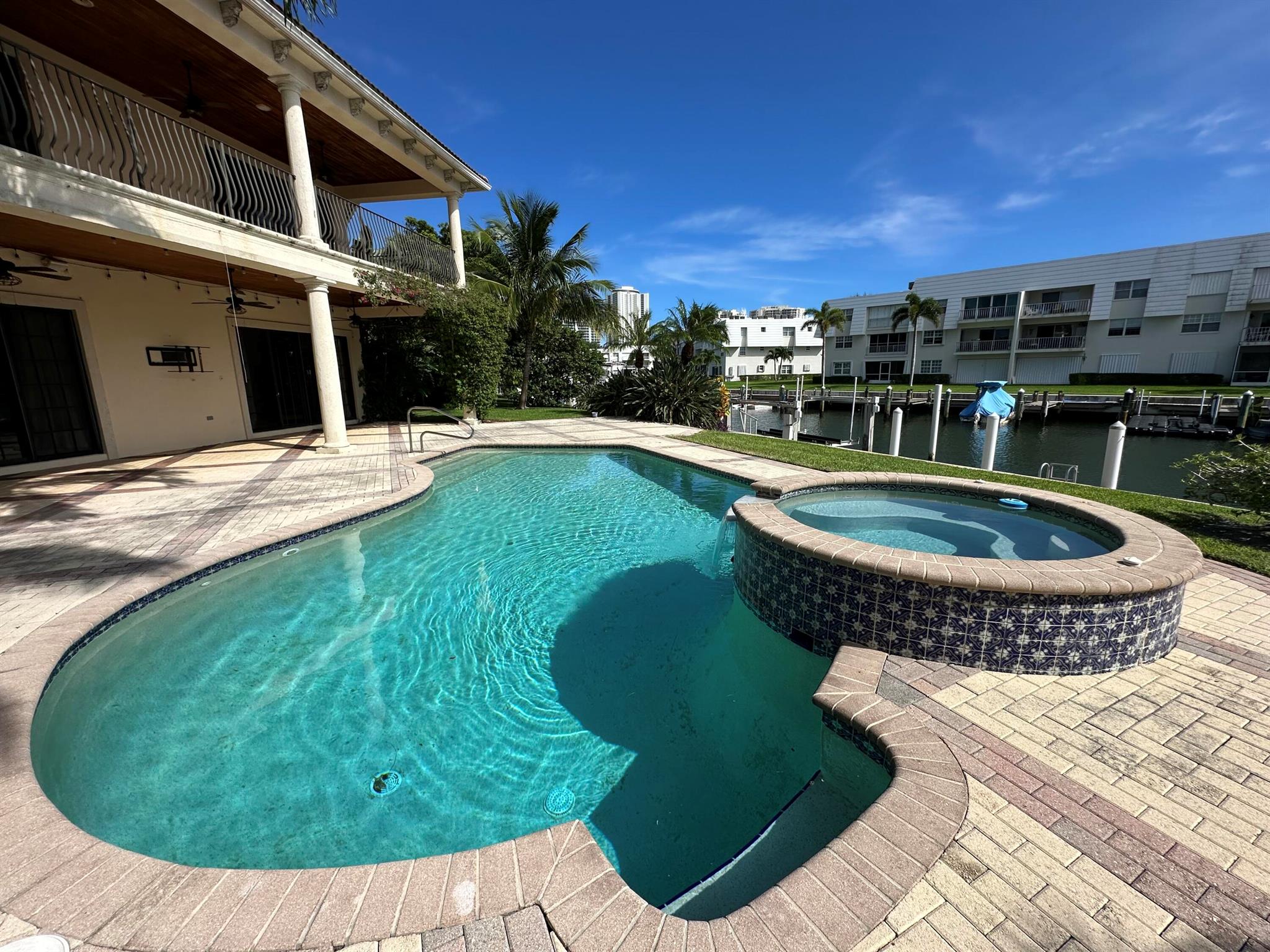 Enjoy 100 feet of prime canal frontage with coveted southern exposure in this rare and spacious, 5 bedroom, 4 bath waterfront home. Boating enthusiasts will appreciate the 9,000 lb. lift, large dock, and easy access to the ocean via the Palm Beach Inlet. High ceilings, light-filled rooms, and an open floor plan create a bright, airy atmosphere. Features include a wood-burning fireplace, impact windows and sliders, and an inviting pool with expansive covered patio- perfect for entertaining. The spacious upstairs lanai is ideal for relaxing in private. Yacht Harbor Manor is a quiet neighborhood and just a short walk to Singer Island's pristine beaches, minutes from the Sailfish Marina, top dining, shopping, Palm Beach, West Palm Beach, and Palm Beach
