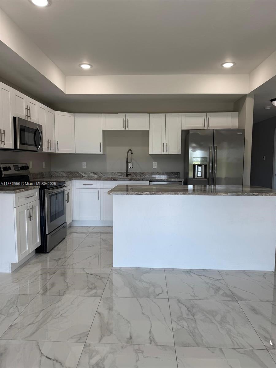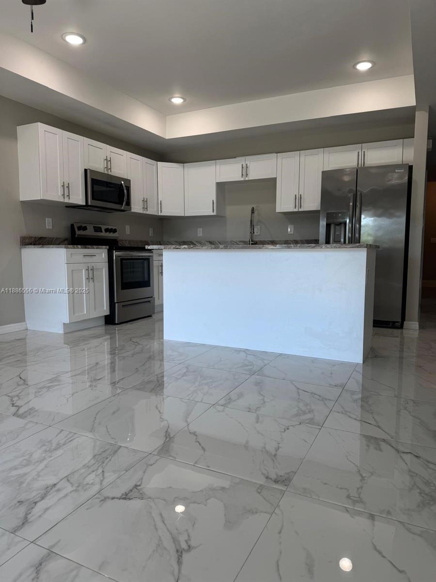Welcome to this stunning 3-bedroom, 2-bathroom duplex, offering 1,150 sq. ft of modern living space designed for comfort and style. Step inside to an open-concept layout featuring gleaming marble-inspired tile floors that flow seamlessly from the spacious living area to the gourmet kitchen. The kitchen boasts white shaker cabinets, elegant quartz countertops with a beautiful veining pattern, stainless steel appliances including a range, microwave, dishwasher, and refrigerator, plus a convenient island perfect for casual dining or entertaining. Practical amenities include an in-unit washer and dryer, as well as an attached garage for secure parking and storage. This move-in-ready duplex combines functionality with upscale touches—schedule your showing today!