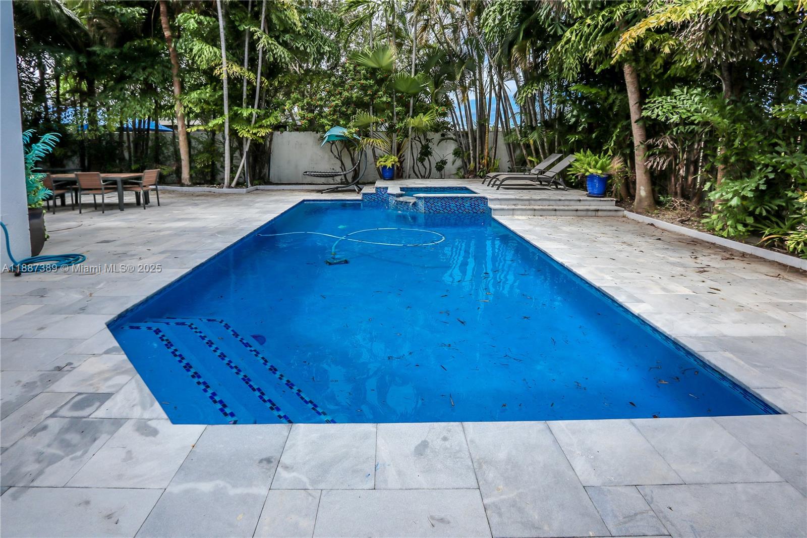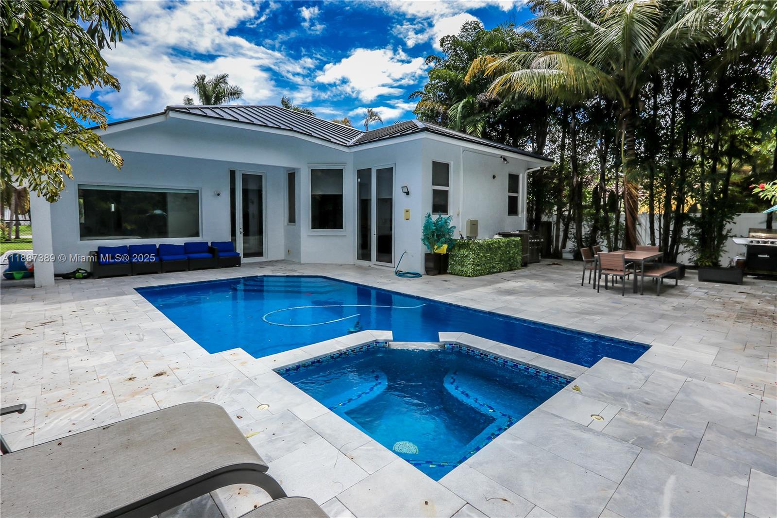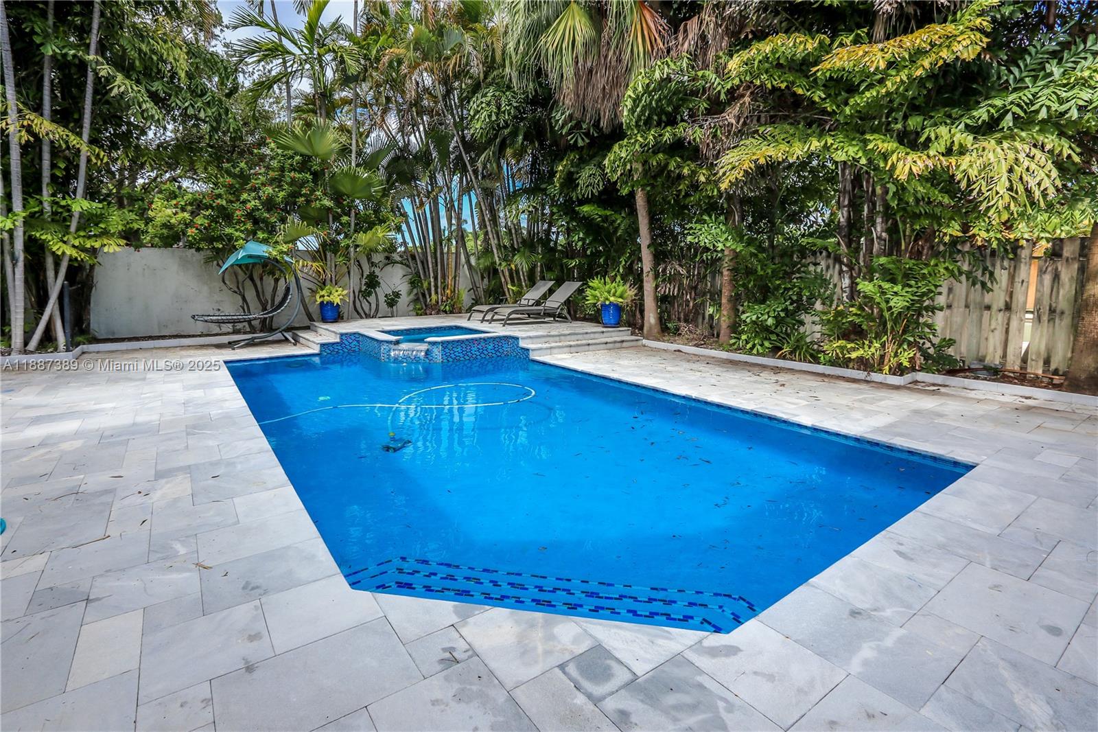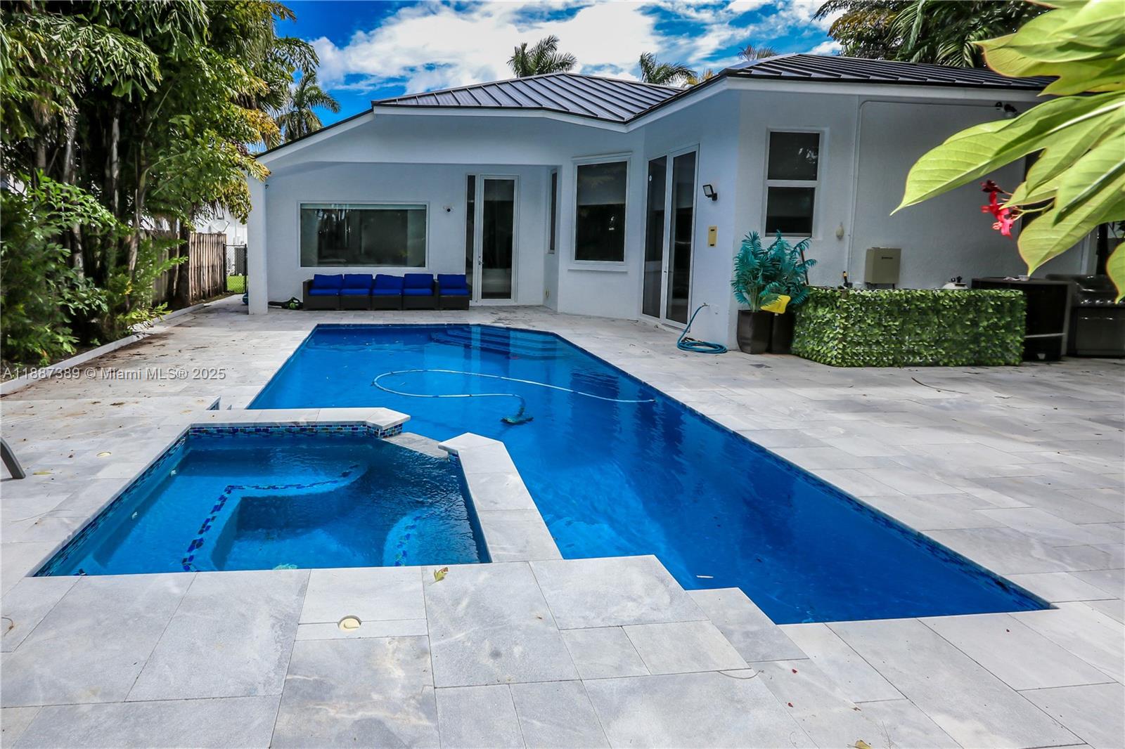 This beautifully crafted 3 bed, 2.5 bath home with pool and additional den/office sits on a quiet cul-de-sac just minutes from Hollywood Beach! Vaulted ceilings, marble floors, and expansive windows create a bright and airy atmosphere, while the open kitchen shines with quartz countertops and stainless steel appliances. The split floor plan offers privacy with a versatile den for office or guest use. The primary suite is a luxurious retreat with a sitting area, spa-like bath featuring a roman tub and walk-in shower, and custom closets. A fenced backyard with pool and patio is perfect for entertaining or unwinding. Freshly painted inside and out, complete with a new roof, two-car garage, and ample parking, this move-in ready residence combines comfort with timeless elegance.