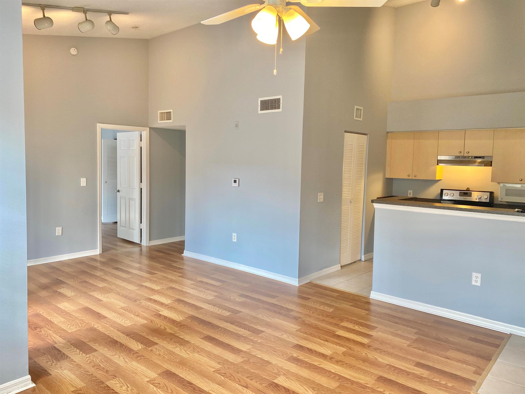 Spacious living/dining area 1BED 1 BATH 3rd floor condo with outdoor patio and view of green space, Stainless Steel appliances and nicely sized bedroom. High ceilings let in the light and give unit a spacious feeling. Great central location- Community has clubhouse-pool-gym-tennis court- electronic security gate. Full size washer/dryer in unit. Association requires minimum credit score 700. Pet friendly community. All Ages- WATER/SEWER /BASIC CABLE INCLUDED in rent !