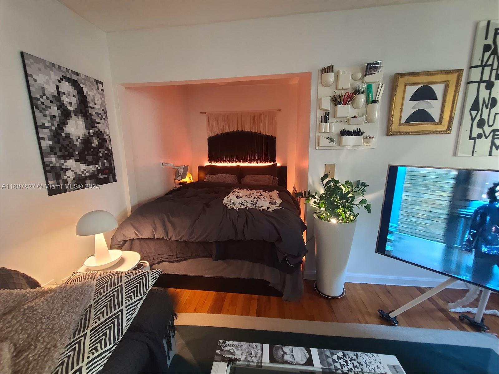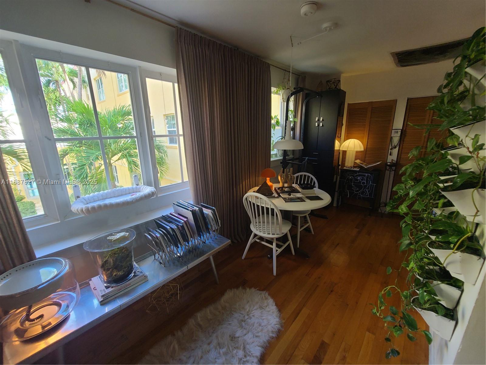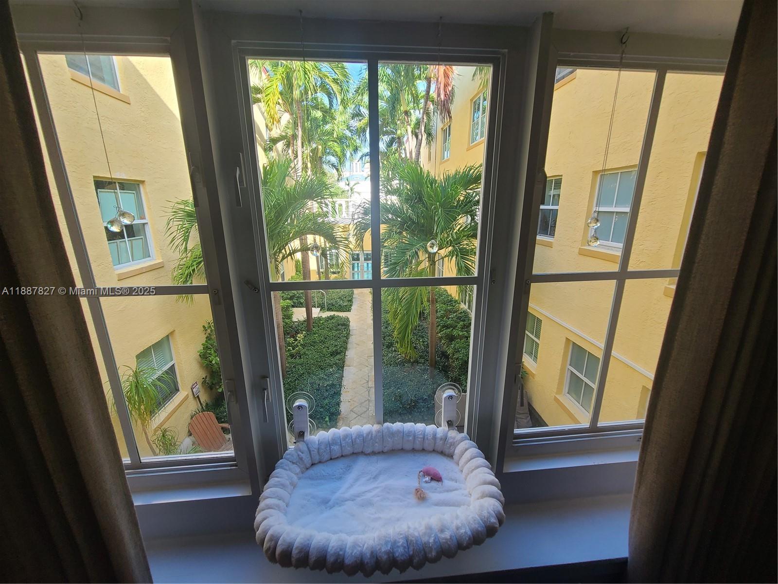 Cozy studio with impact windows, central AC and views of the beautifully maintained communal courtyard. The Habana Condominium is a well-run, clean and quiet. It features secured gated entry to the communal gardens and to the building, cameras, and a nice keyed laudry room. All of this just 2 blocks away from the beach!! It can be rented with the convenient storage bed or without. Owners prefer to rent it with the bed.