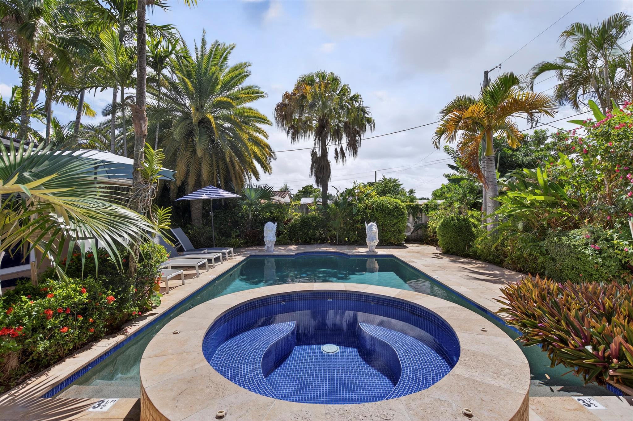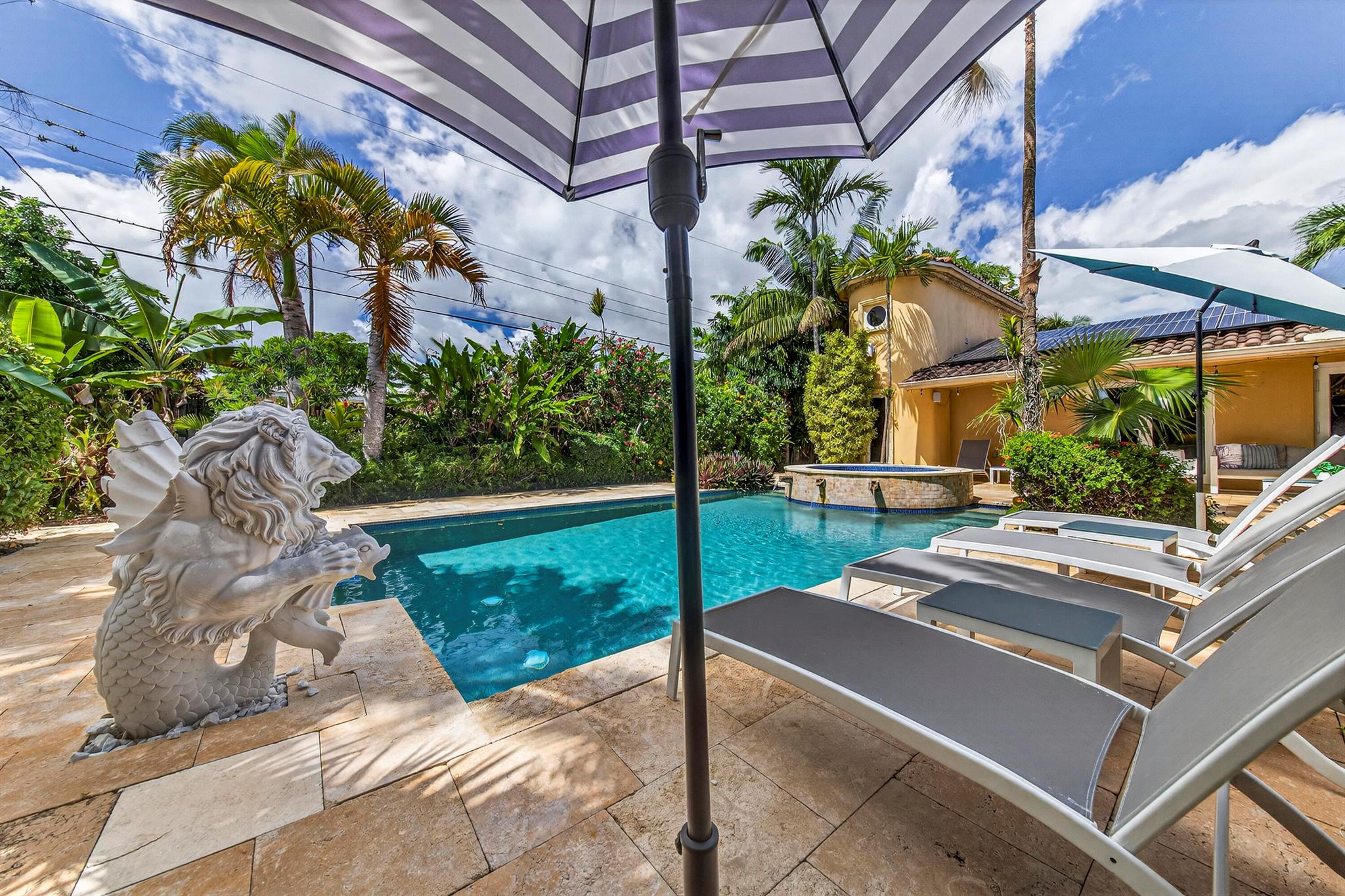 Discover this tropical paradise hidden gem in the heart of Fort Lauderdale. This stylish 4 bedroom, 2 bathroom furnished home features bright, open living spaces, gourmet chef's kitchen, built in closets, and modern finishes. Both bathrooms include walk-in, roll-in showers for comfort, accessibility and a touch of spa like luxury. Enjoy an expansive backyard oasis with sparkling, heated pool, hot tub and extensive outdoor seating, ideal for sun soaked afternoons, evening cocktails or dining under the stars. The front boasts a lush tropical patio with beautiful fountain, creating a serene welcome as well as a wonderful setting for morning coffee or peaceful relaxation. Located minutes from beaches, boating, dining and nightlife, this one captures the best of South Florida living.