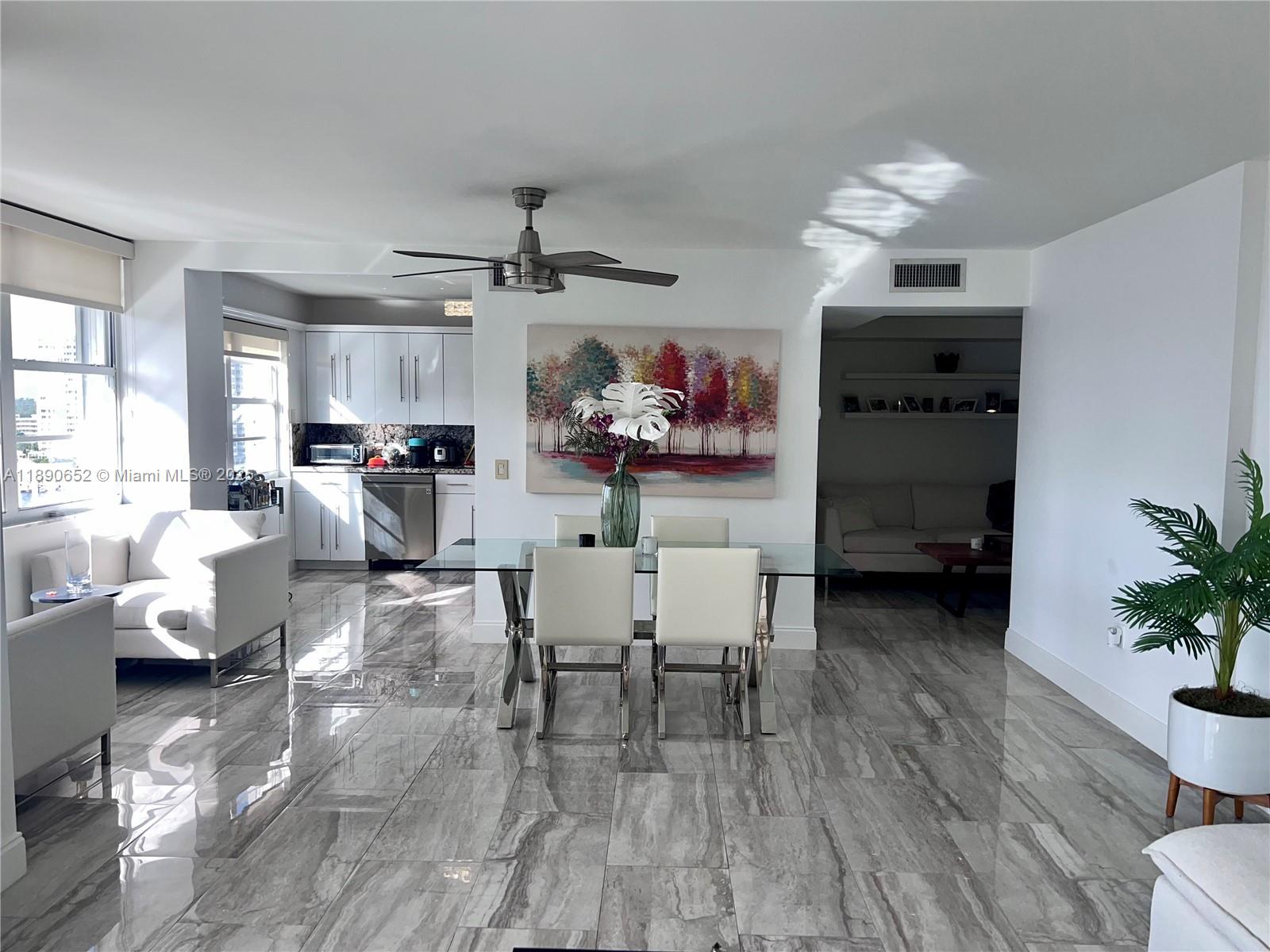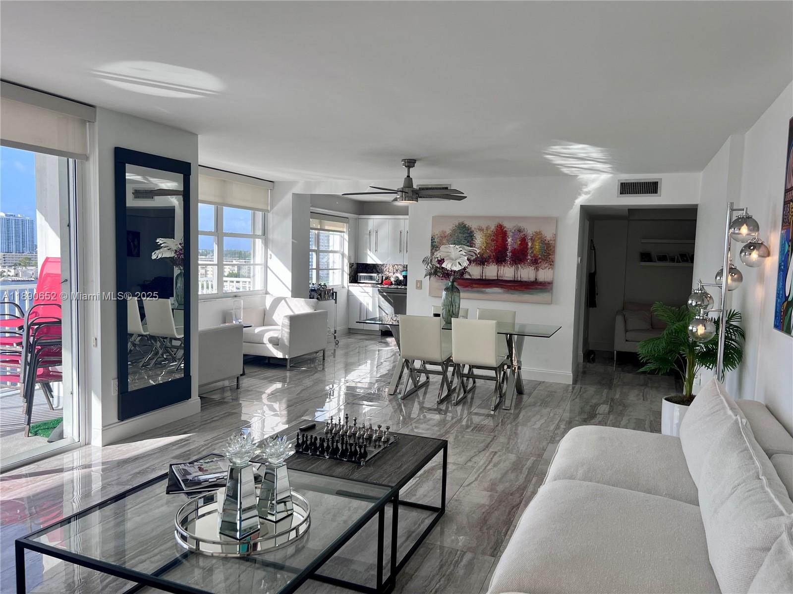 Experience breathtaking panoramic water views from every window in this beautifully remodeled 2-bedroom + den, 2-bathroom apartment at Admirals Port. Enjoy the serene beauty of Little Maule Lake from your expansive wraparound balcony, offering a sought-after direct southern exposure. This spacious and light-filled residence features a modern upgraded kitchen with sleek cabinets, granite countertops and backsplash, and elegant porcelain tile flooring throughout. Additional highlights include hurricane shutters, custom blinds, and enhanced overhead lighting. Admirals Port offers resort-style amenities including pools, tennis, fitness center, 24-hour security, and more. Located near restaurants, Aventura Mall, and houses of worship, this apartment offers convenience and lifestyle.