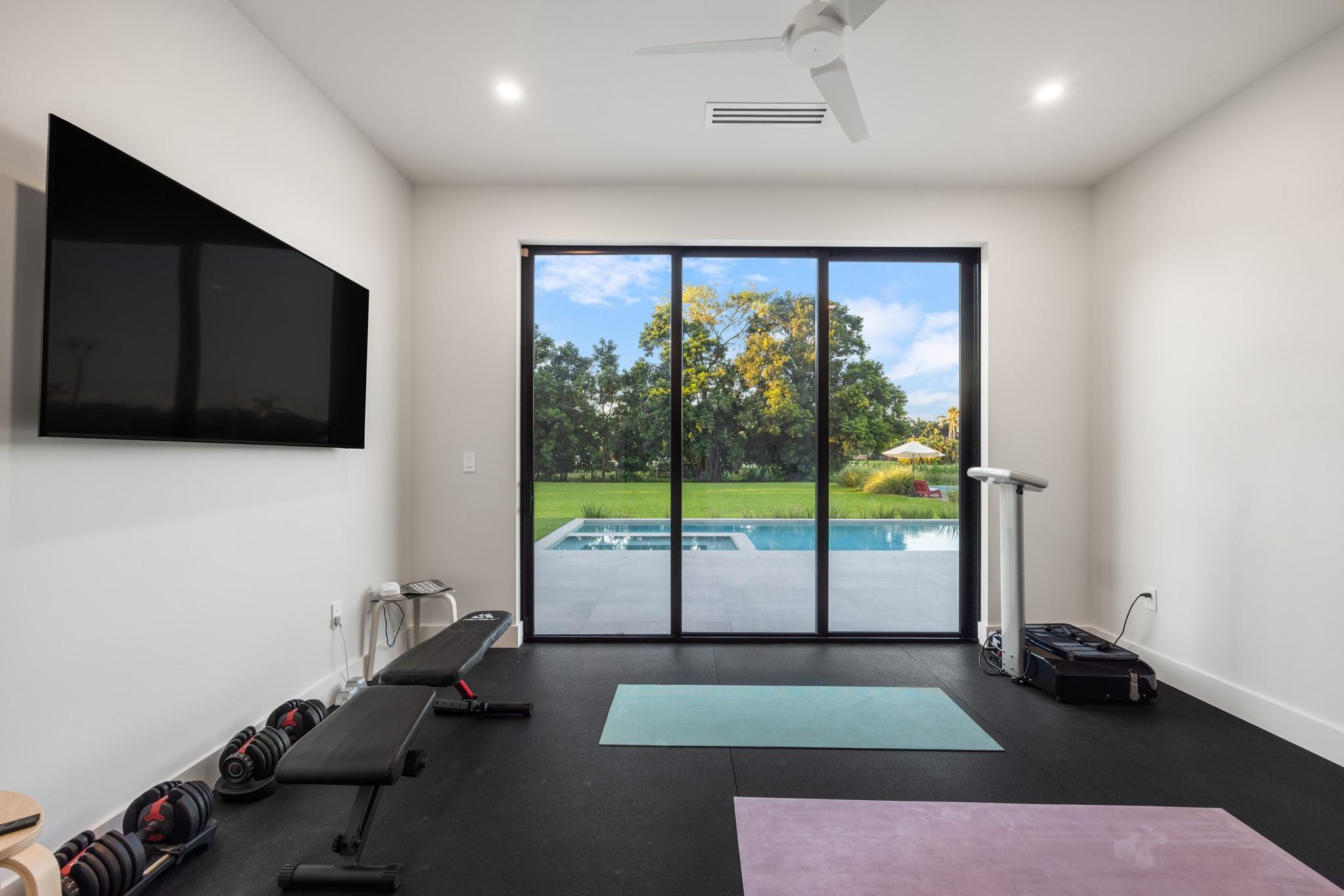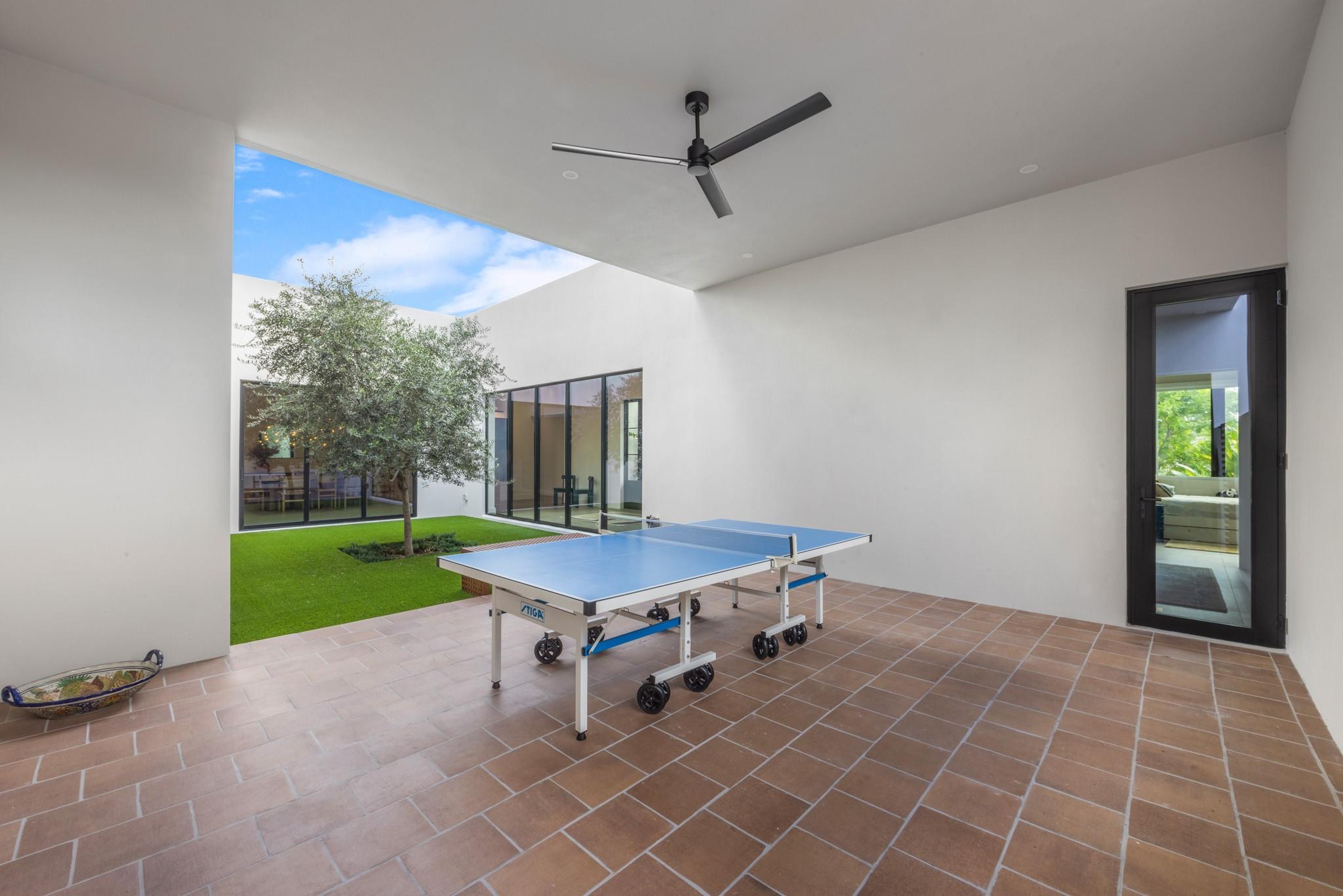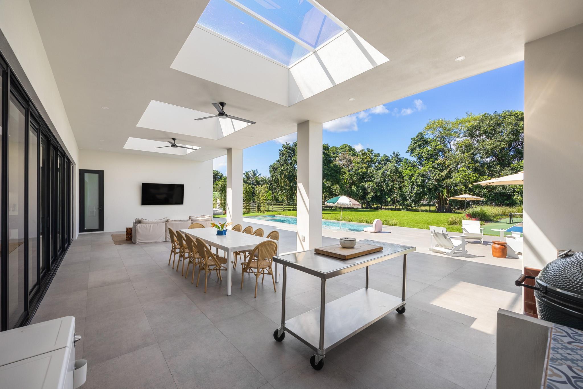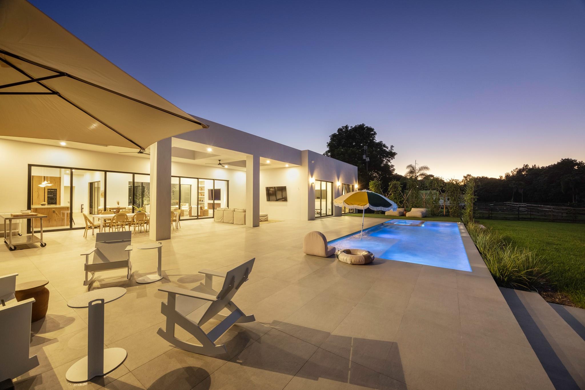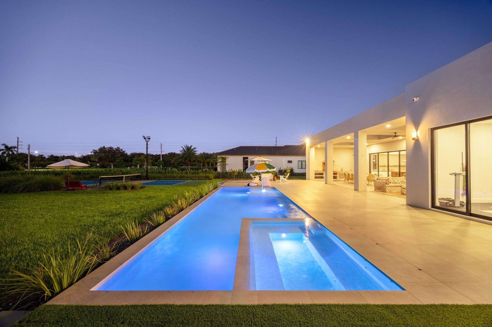 Experience the ultimate South Florida escape at this Modern Hacienda. One-of-a-kind! This luxurious 4-bed, 5-bath, gym, office home blends modern elegance with resort-style amenities for an unforgettable stay. Lighted Pickleball Court–Play day/night on your private court. Golf Practice Cage/Ping pong table. Relaxing sauna, outdoor shower and spectacular heated pool/spa. Expansive patios/grill make this the ideal setting for family gatherings or quiet evenings under the starts. Spacious interiors/fully equipped gourmet kitchen. 20 minutes to Fort Lauderdale Beach and airport. Enjoy quick access to Miami or Boca while still feeling a world away from it all. Whether you’re seeking a private retreat, an active family getaway, or a relaxing staycation, this Modern Hacienda is the perfect home.
