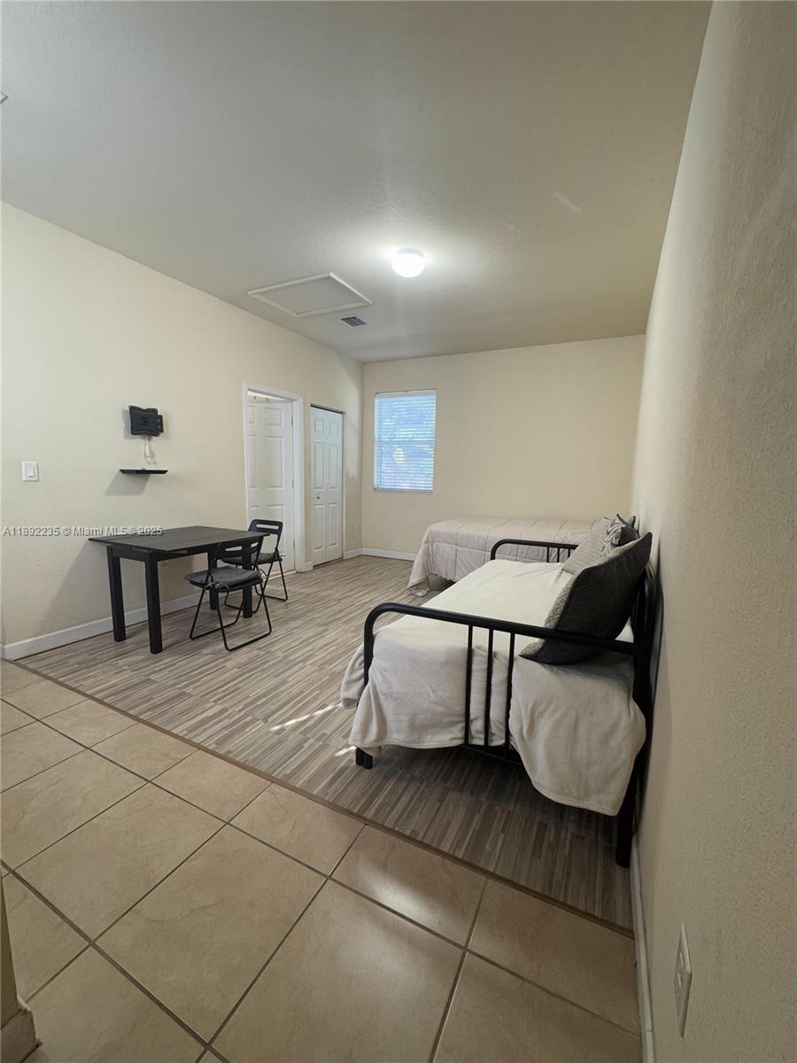 Fully furnished studio apartment, 400 sq ft, upstairs unit. Full kitchen with stove, refrigerator, dishwasher, and microwave. Walk-in closet. Washer and dryer inside the unit. Full-size bathroom and spacious interior layout.