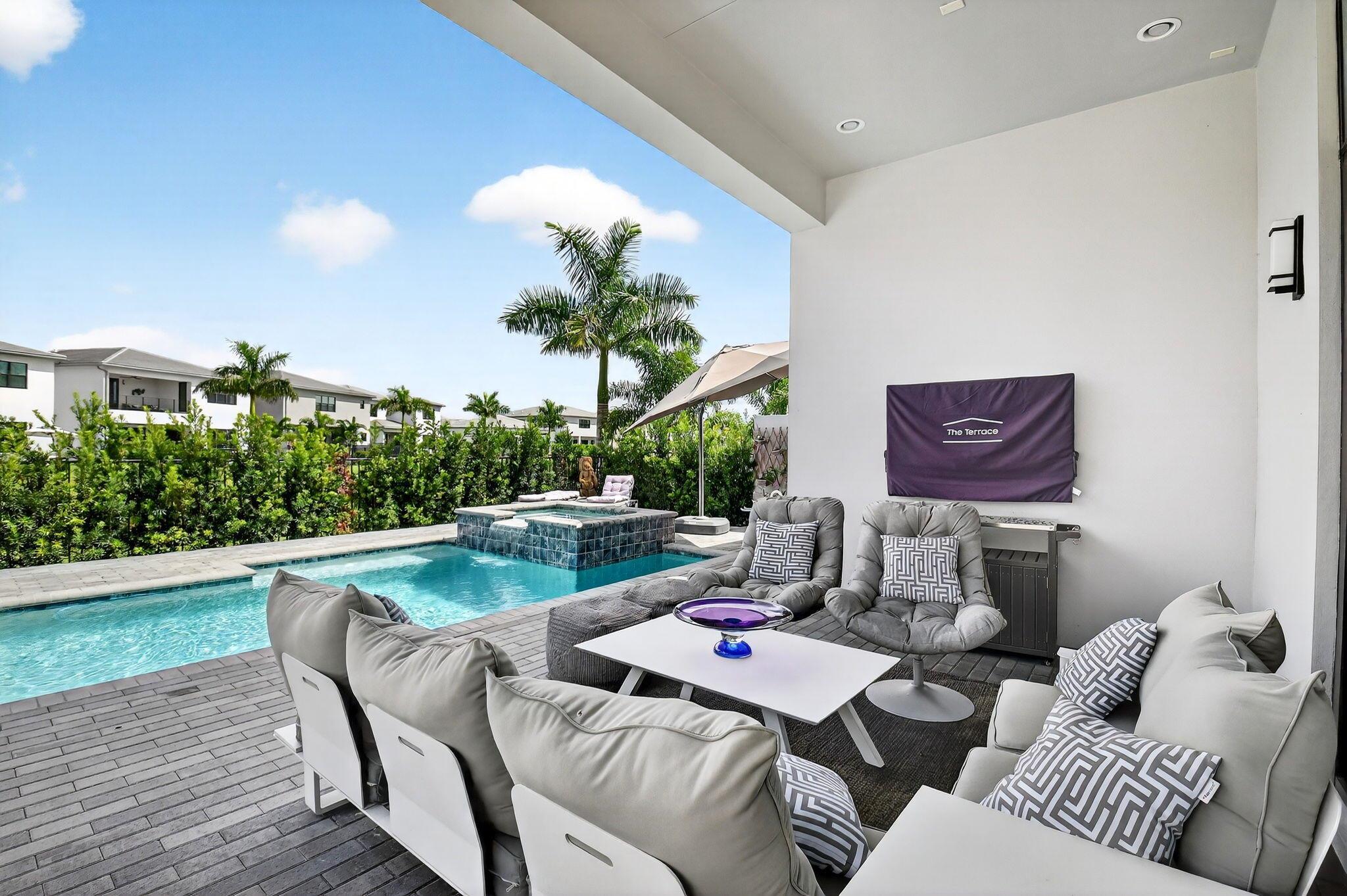 Fully furnished and beautifully decorated one-story home, with 3-bedrooms + office and quiet lake views in Lotus Palm! Barely lived-in Bermuda model complete with designer window treatments, electric shades throughout, and full-house generator. The interior is light, bright, and open. Eat-in kitchen features an extended waterfall island, built-in coffee bar, and stainless steel appliances, including a gas cooktop and double ovens. Master suite has 2 large custom walk-in closets, and a master bath with 2 sinks, large shower, custom stand-alone tub, and touchless commode. All guest bedrooms are ensuite with built-out closets. Outside, the backyard features a pool with spa, entertainment area, and stunning lake views.
