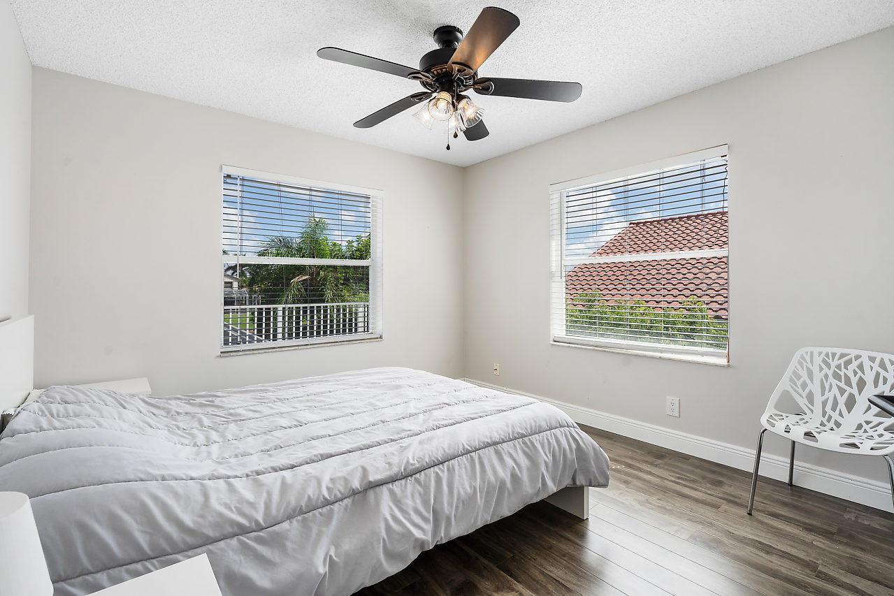 Beautifully renovated, unfurnished contemporary 4BR/3BA, 3 car garage, 2 story pool home on water in 24 hour man gated Boca Raton community. This light and bright home features lots of windows, NO carpeting, open floor plan and lovely water views! Modern kitchen with white wood shaker style cabinets, french door fridge, quartz counters, and is open to large family room and overlooks gorgeous pool (newly redone) and yard. Oversized master BR with huge closets, private balcony and sitting area and 3 generous sized rooms upstairs. Ceiling fans in all bedrooms. Pets considered on case by case basis. Fabulous all age community has a pool, gym, clubhouse, tennis, billiards room. Cable, lawn and pool care included.