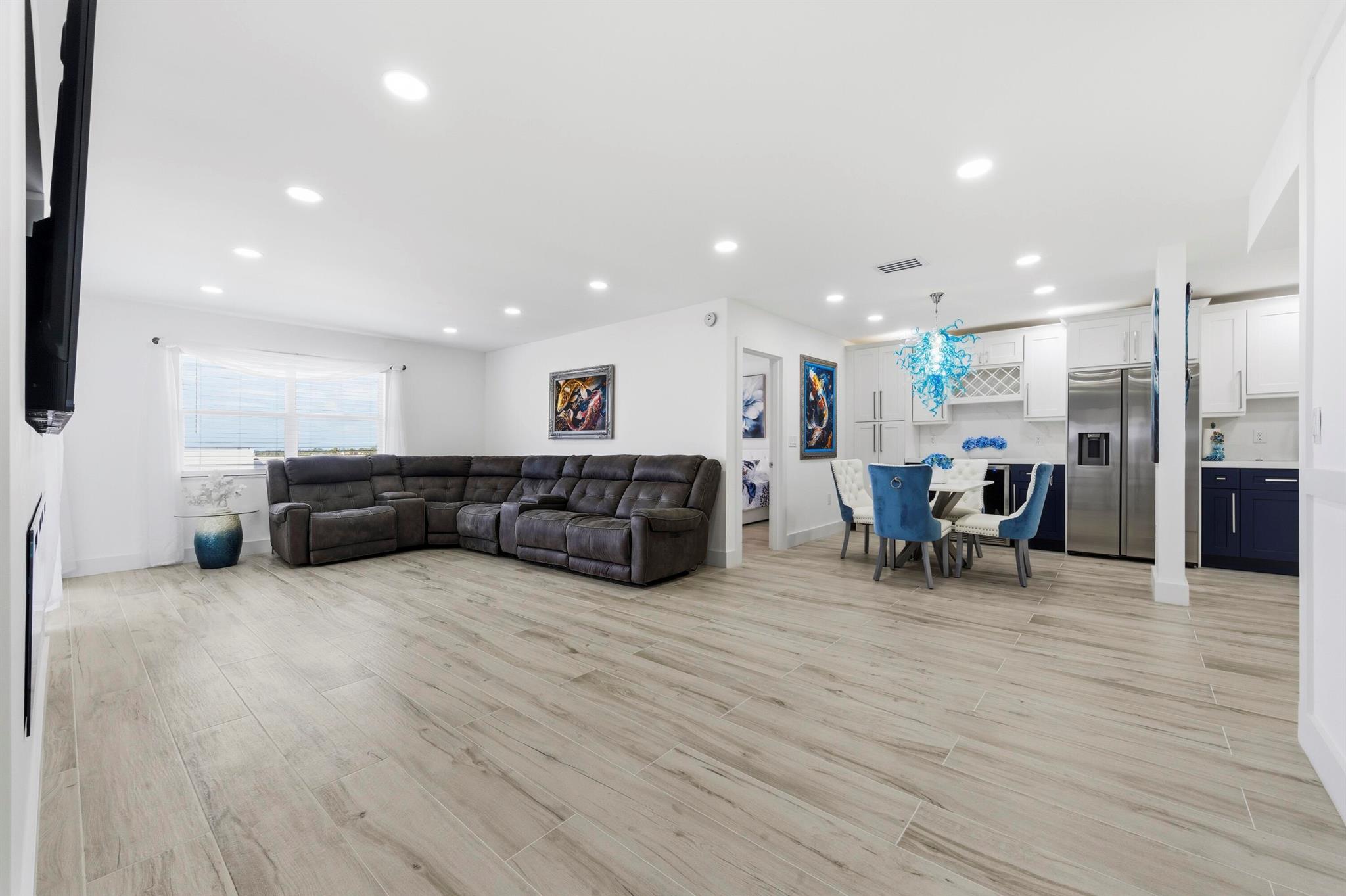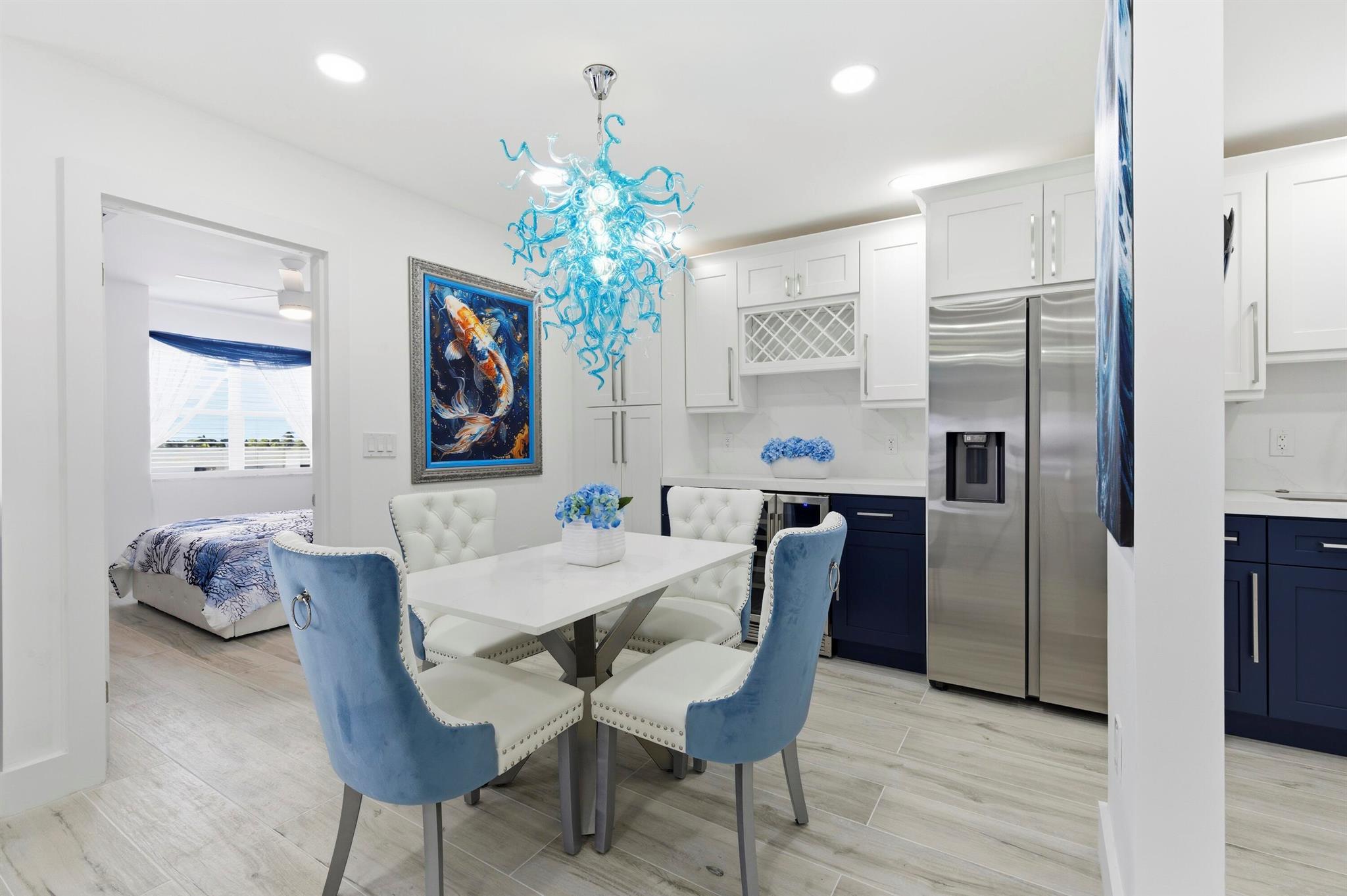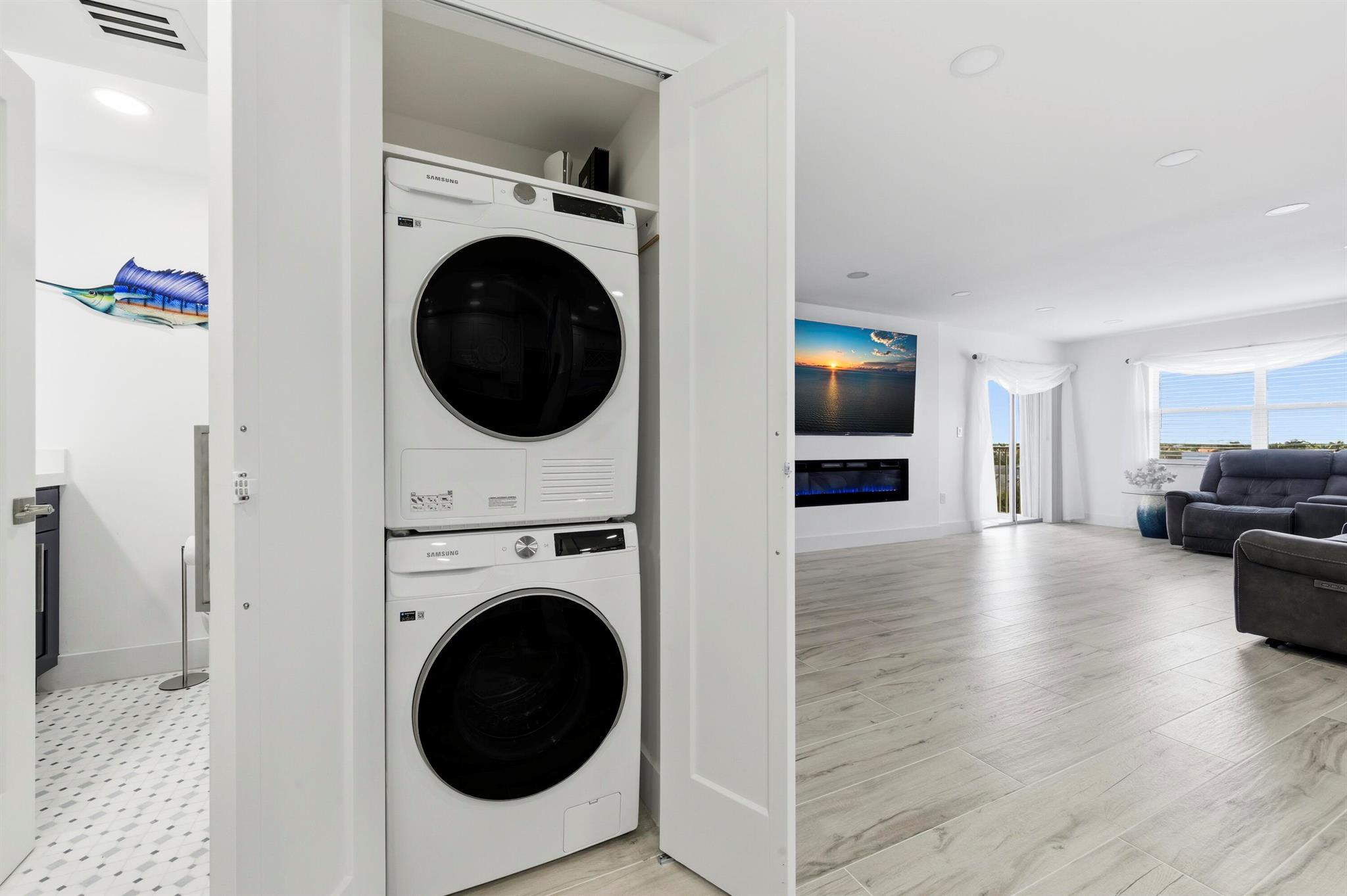 Experience beachfront luxury in this fully renovated 2-bedroom, 2-bath condo. This sophisticated residence features an open floor plan with brand-new kitchen cabinets, stainless steel appliances, and a bar area with a wine cooler, perfect for entertaining. The bathrooms have been modernized with double sinks and upscale fixtures. Enjoy the seamless tile flooring throughout, complemented by high hats and stylish finishes.Relax in the spacious living area with an 86'' TV and a cozy fireplace. The master suite boasts a walk-in closet and 2 additional closets; the condo comes fully furnished with an in-unit washer and dryer. The community offers an array of amenities, including a pool, gym, billiard room, cards room, barbecue area, party room, and sauna, providing a resort-style lifestyle.