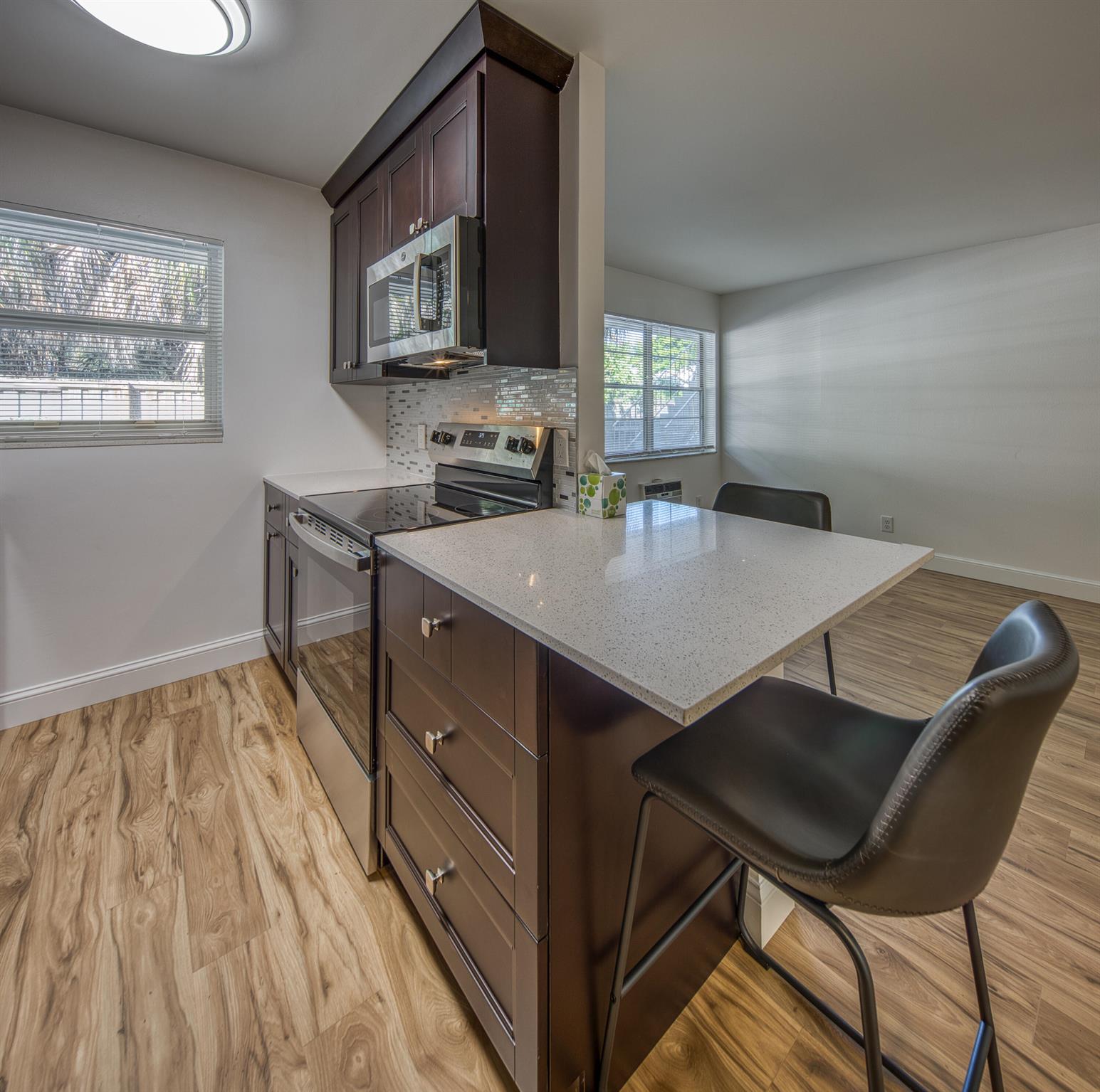 Beautifully remodeled-move right in! All new bathroom with walk in shower, kitchen with fabulous counter seating, new range-micro-dishwasher and fridge. Plenty of room for table/desk area plus tons of storage including a full size pantry, linen closet, walk in storage closet as well as wall to wall bedroom closet. New floors throughout! On premise laundry is just steps from this stunning 1st floor unit. Located a few blocks north of vibrant Lake Worth Beach downtown nightlife, restaurants, music venues (Bamboo Room) and art scene. Home to the country's largest Street Paint Festival (chalk) and minutes away to Benny's On The Beach! Also includes assigned off street parking steps away from unit. Your best of ALL worlds awaits you.