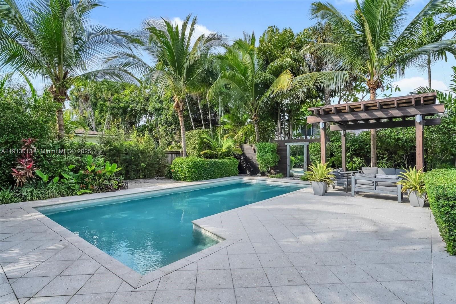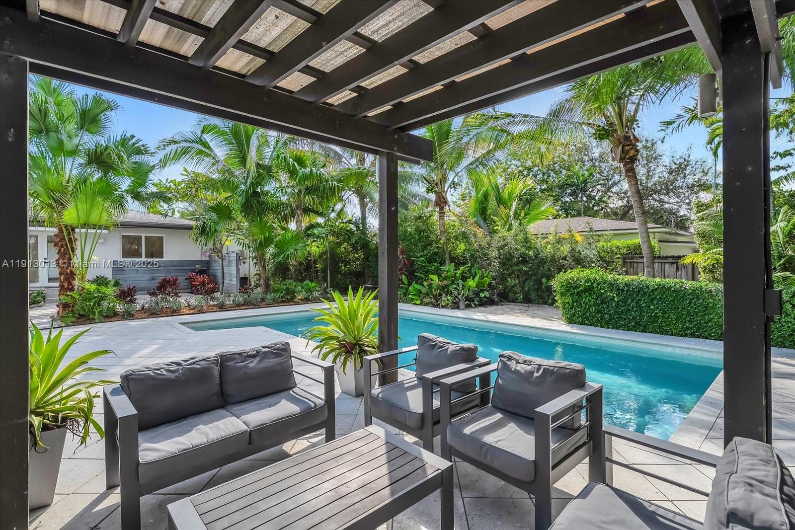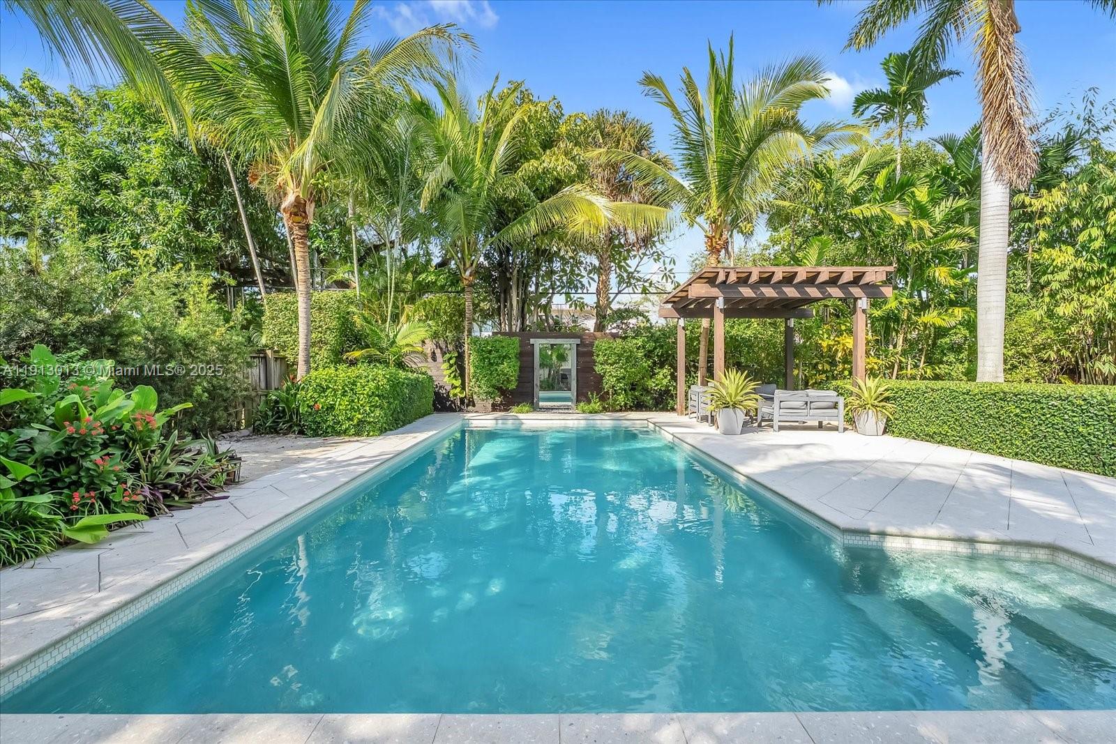 Step inside this paradisiac and lush tropical oasis, featuring 3 spacious bedrooms and 2 bathrooms bathed in natural light, with open and modern, recently upgraded living spaces and kitchen. Outside, enjoy an oversized sparkling pool, an expansive deck and outdoors showing, perfect for entertaining or relaxing to the gentle songs of birds and nature. The spacious front and back yards, surrounded by mature tropical landscaping, create a private retreat on a 9,750 SF lot that offers a true indoor-outdoor lifestyle. Ideally located just an 8-minute walk to the bay, 2 minutes to Military Trail Park (with dog park), 1 mile from Miami Shores Country Club, and minutes from Publix, Walgreens, TD Bank, and more—this home beautifully combines convenience, natural beauty, and tranquility.