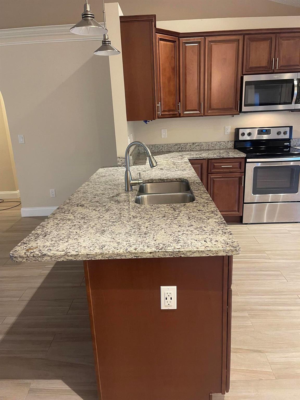 Cozy 3/2/2 home with wide plank tile in warm and cool tones. The living room offers a bay window plus a decorative shelf. Spacious kitchen has rich wood cabinets with soft close doors and drawers, under & over lighting, granite countertops extending out for extra seating at the breakfast bar, S/S appliances. Granite countertops on bathroom vanities. Also attractive lighting in both bathrooms and breakfast area. Screened back patio. Large backyard. All sizes are approximate.