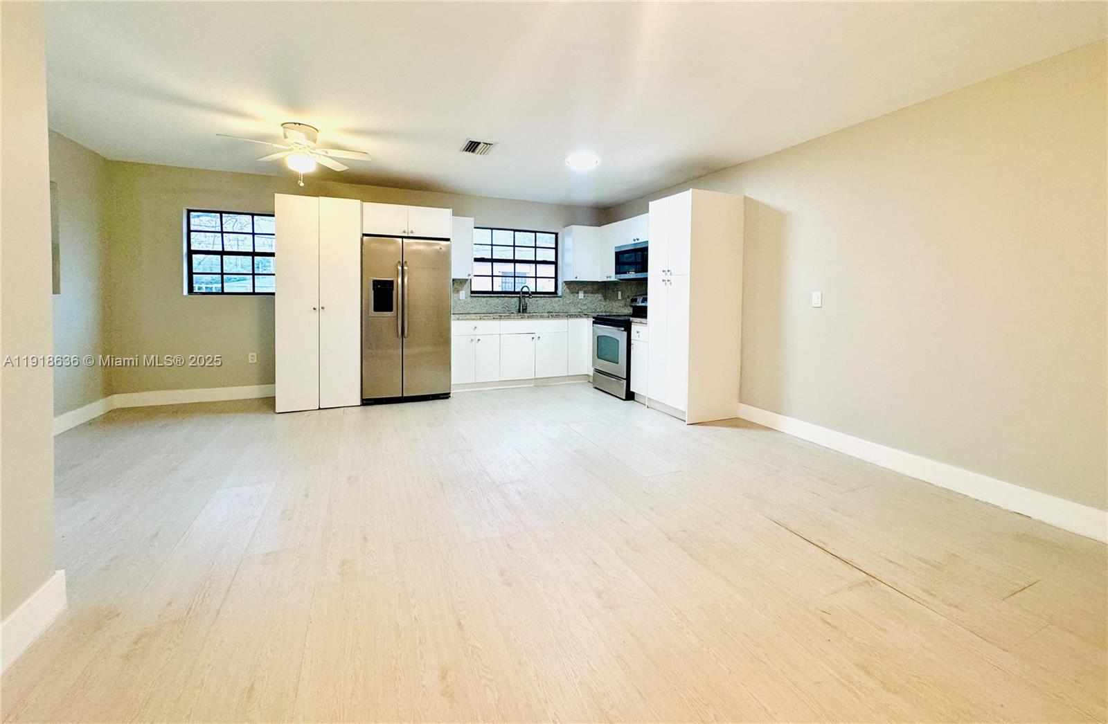 Renovated 2-bedroom, 1-bath private rear unit with a separate side entrance. Features spacious bedrooms with wood floors, a remodeled bathroom with high-quality tile, a new shower, and a modern vanity. The open kitchen includes stainless steel appliances, and the unit has been freshly painted. A brand-new high-efficiency A/C ensures year-round comfort. Enjoy a large backyard for outdoor relaxation.