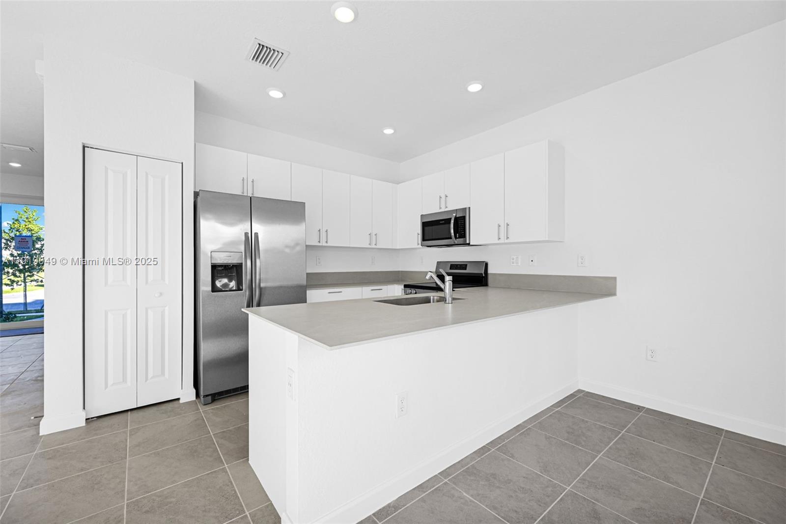 Welcome to Terra Sol! This contemporary Move in ready two-story townhome offers a thoughtfully designed layout with a 1-car garage plus two additional driveway spaces, a private patio, and an inviting open-concept living area. The kitchen showcases quartz countertops, brand-new stainless steel appliances, Italian-style cabinetry, and smart-home features throughout. The property is equipped with high-impact windows and doors for added protection. Before the tenant moves in, ALL CARPET ON THE STAIRS AND SECOND FLOOR WILL BE REPLACED WITH BEAUTIFUL LAMINATE FLOORING. New zebra blinds and blackout shades are also being installed throughout the home. The upper level includes 3 bedrooms and 3 full bathrooms and a half bathroom in the 1st floor, with two bedrooms offering en-suite designs. The primary suite features a balcony, a spacious walk-in closet, and an additional area perfect for a small office or reading nook. A laundry closet with a brand-new washer and dryer is conveniently located upstairs. Pet-friendly and situated in a gated boutique community close to schools, shopping, the Turnpike, US-1, and easy access to the Florida Keys. HOA is covered by the landlord, and future clubhouse amenities will be available.