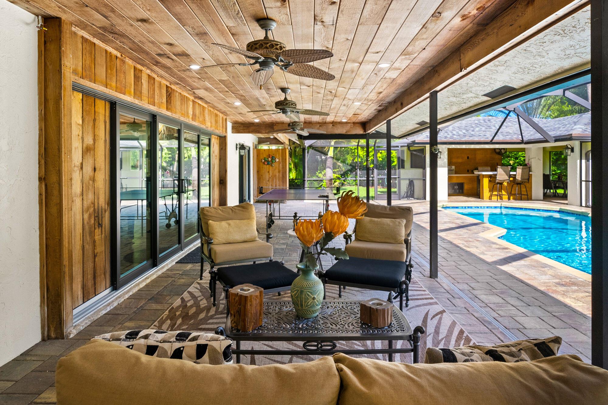 Seasonal Luxury Retreat in Wellington - Close to WEF, Polo & Palm Beach Welcome to your private South Florida retreat, a lush tropical paradise set on a fully fenced acre in the heart of Wellington. This single-story ranch estate has been completely remodeled inside and out, offering nearly 3,000 sq. ft. of like-new living space plus an additional 1,500 sq. ft. of screened-in outdoor living designed for seamless entertaining and relaxation. Inside, the open-concept great room boasts vaulted ceilings, rich wood floors, and sliding glass doors that blend indoor and outdoor living. The chef's kitchen features quartz countertops, stainless steel appliances, and custom cabinetry with a pass-through window for easy outdoor dining.