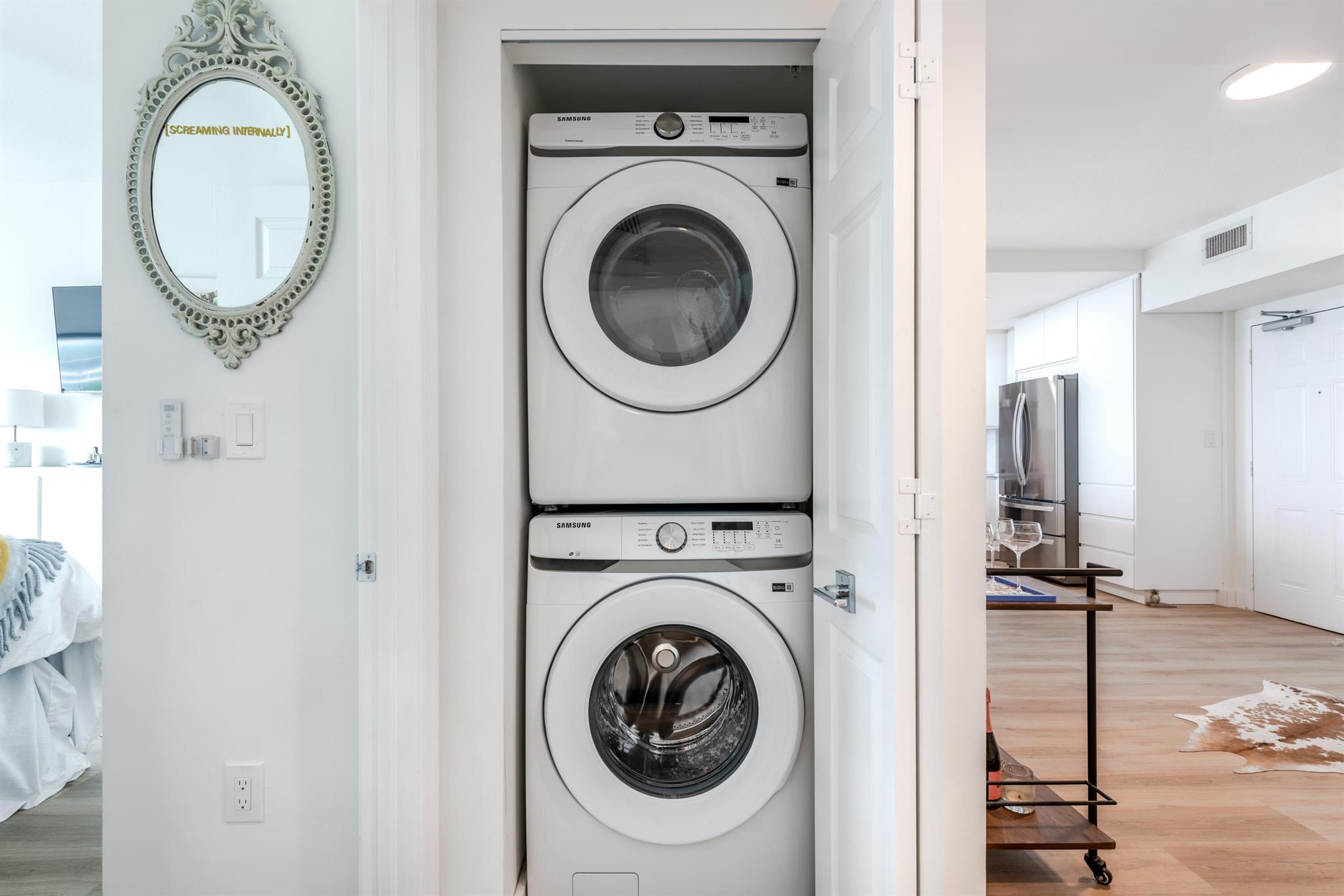 2 Deeded Garage spaces for this completely renovated, high floor, furnished condo. Vinyl plank flooring thruout. Completely open Euro-style kitchen with Quartzite countertops and stainless steel appliances - separate cooktop and oven. Main bedroom is on suite with stunning marble tile bathroom and open walk-in shower. 2nd bathroom - has a tub shower. All windows have remote operated blinds with blackouts in the bedrooms. Newer front-load washer & dryer in unit. Fitted closets. Mostly Furnished with high end furniture. Large balcony with city views. Visitor parking available. Less than 1 block from Underline path. Building has just undergone renovation work in lobbys and hallways with exceptional new mobile accessible access system. Great city-view pool deck and gym available for resident