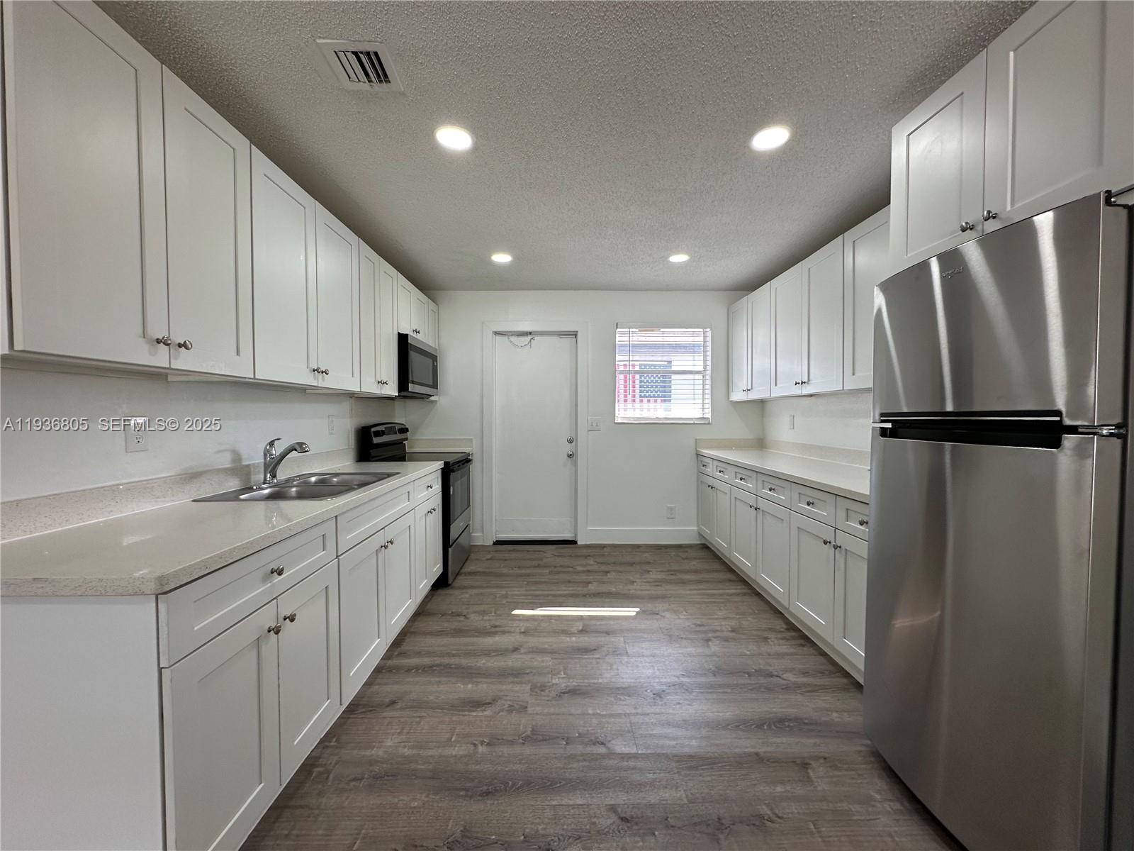 Brand-new, charming 2BR/2BA apartment in Hallandale Beach, meticulously remodeled to embody comfort and style. Every detail feels like home, with new elegant finishes throughout—sparkling granite countertops, brand new, high-end appliances, with beautiful lighting and flooring. The spacious, first-floor corner unit boasts an open, welcoming layout perfect for family gatherings and entertaining, complemented by big rooms and walk-in closets for ample storage. Has a private laundry/utility room with washer & dryer hookup. Unit includes 1 assigned parking space. Situated in a perfect location in a quiet community with easy access to parks, beaches, shopping & dining. This is a true Hallandale gem—a haven of newness, spaciousness & convenience, where every detail makes you feel right at home.