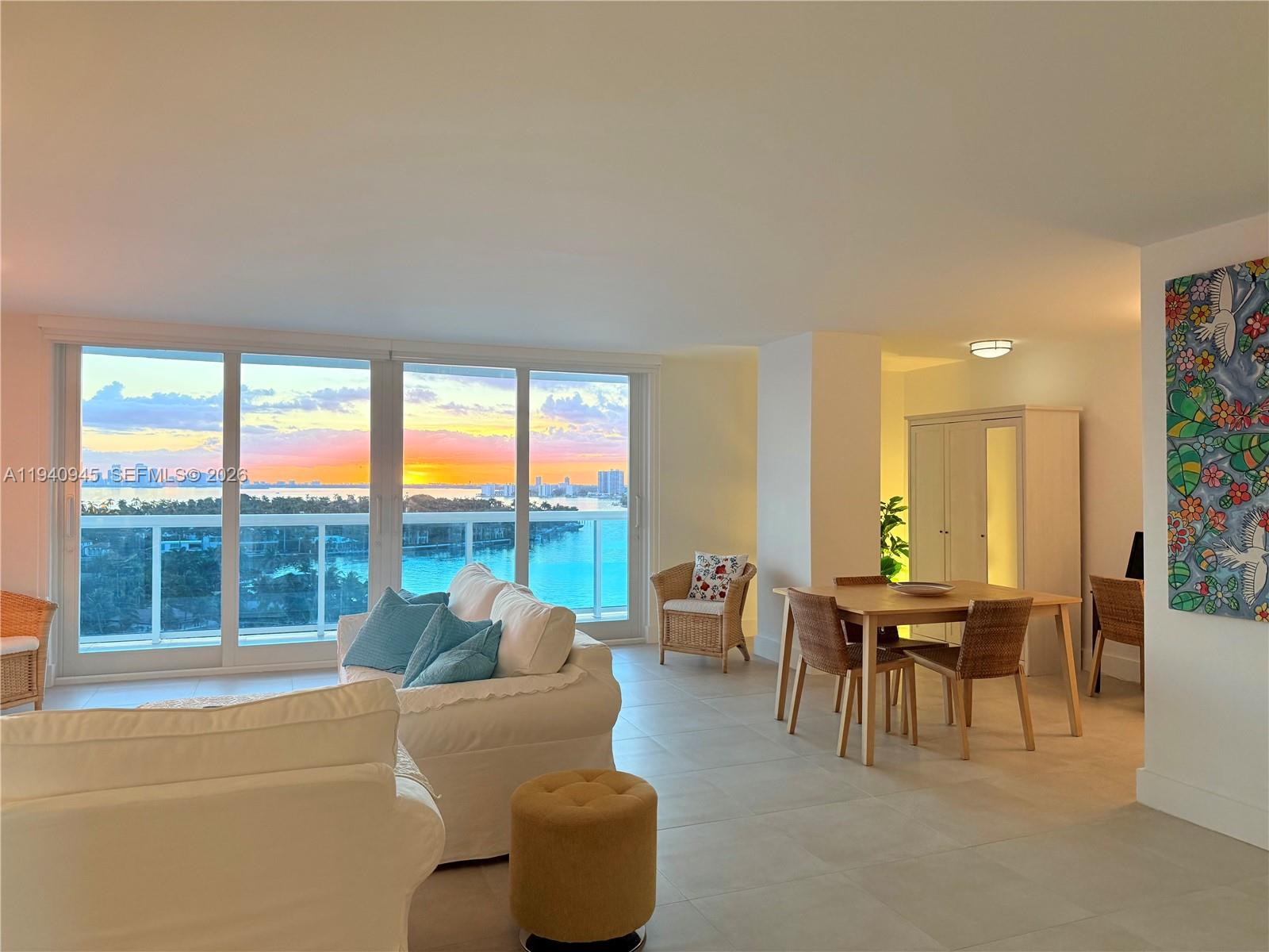 Furnished Waterfront Studio (993 SF) on the 14th floor with floor-to-ceiling high-impact sliding windows and dynamic Intracoastal, Biscayne Bay, and skyline views. Rare 26-ft private balcony exclusive to this line. Features stainless steel appliances: fridge, stove, microwave, dishwasher, black granite countertops, modern bath, walk-in closet, linen closet, and dedicated adjacent storage room. Building offers 24/7 security, valet parking , fully equipped gym, sauna, on-site management, and laundry steps away. Pool under renovation. Two blocks from beach and boardwalk with easy access to South Beach, Bal Harbour, Wynwood, Design District, and MIA. $2,500/month. Sorry No pets. Available 3/1/26.