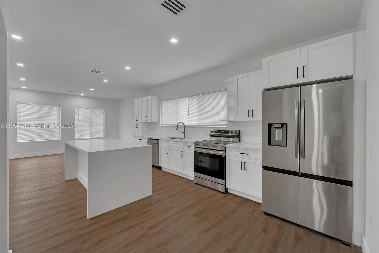 Beautifully renovated 3-bedroom, 2-bath residence offering approximately 1,200 sq ft of modern living space in the heart of Allapattah. This light-filled home features an open-concept layout anchored by a sleek chef’s kitchen with an oversized quartz island, custom cabinetry, stainless steel appliances, and recessed lighting throughout. Stylish flooring and thoughtfully updated bathrooms add to the clean, contemporary feel. Enjoy access to a shared outdoor common area, perfect for relaxing or casual gatherings. Property is part of a duplex. Rent includes electricity and water, providing exceptional value. Centrally located with easy access to major highways, Downtown Miami, Wynwood, and the Health District.