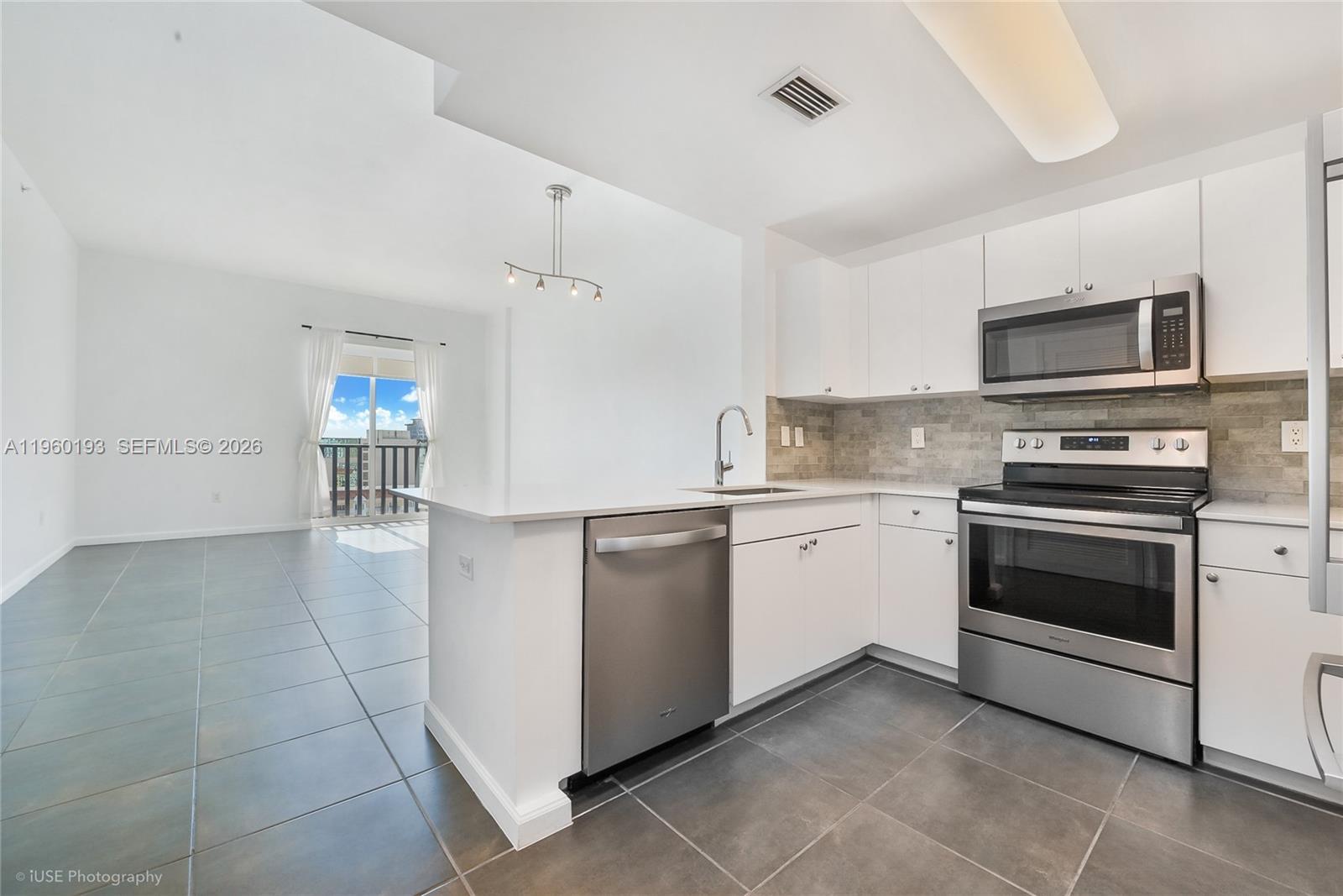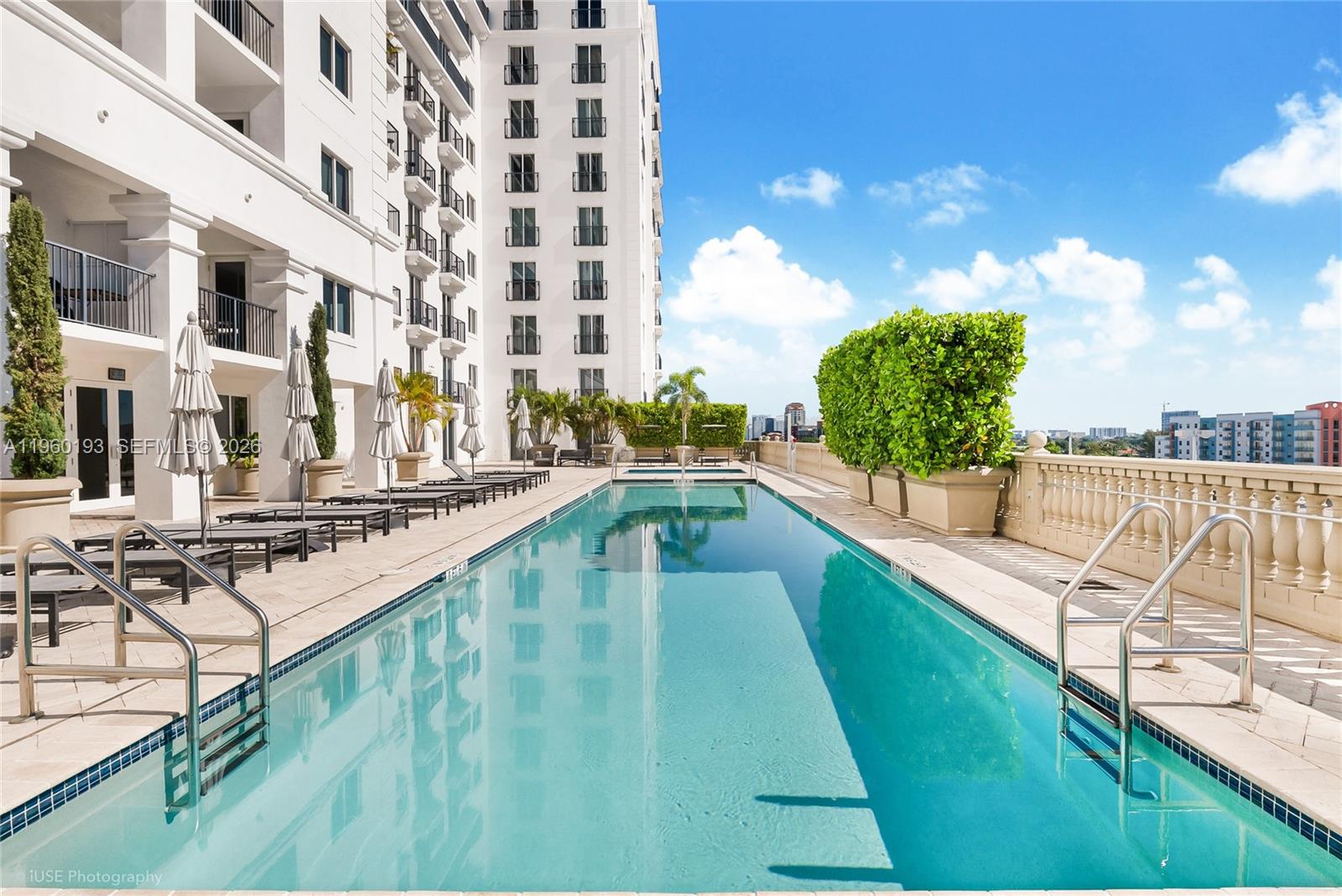 TEN ARAGON 1/1 PENTHOUSE in the heart of Downtown Coral Gables. This top-floor residence offers understated elegance with soaring ceilings and expansive city views, with (very) distant water views on clear days. A refined white kitchen features quartz countertops, glass tile backsplash, and stainless-steel appliances, blending modern design with timeless appeal. Neutral grey slate-tone tile flows seamlessly throughout, creating a calm, sophisticated atmosphere. Spacious bathroom and thoughtful storage, and washer/dryer in unit. Full-service building with concierge and security, resort-style pool, fitness center, and assigned covered parking. Impeccably maintained and move-in ready. Ideally located near Miracle Mile’s dining, boutiques, and cultural venues. A rare penthouse offering!